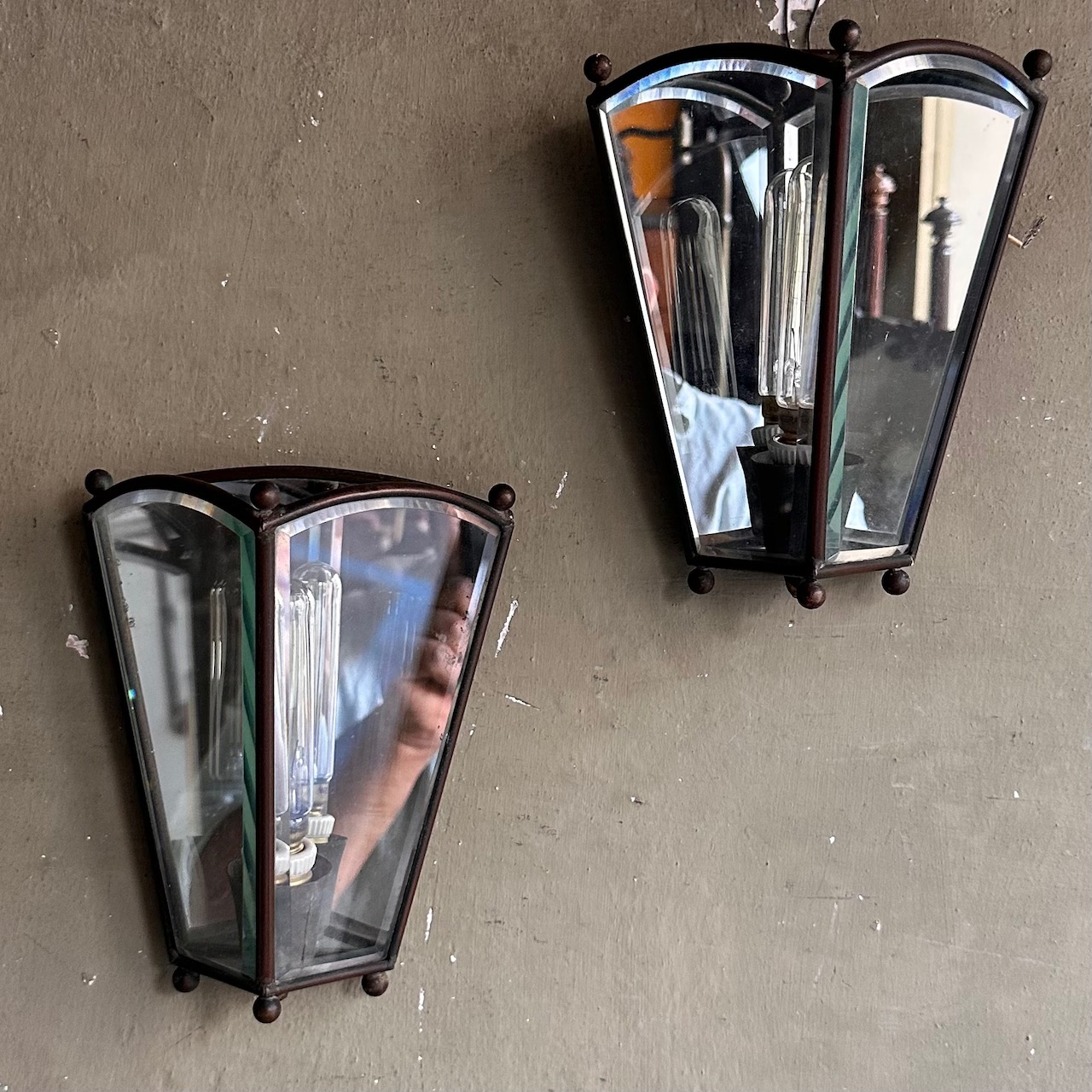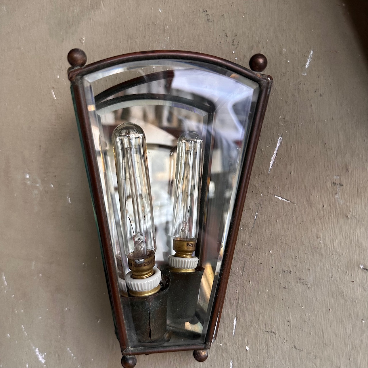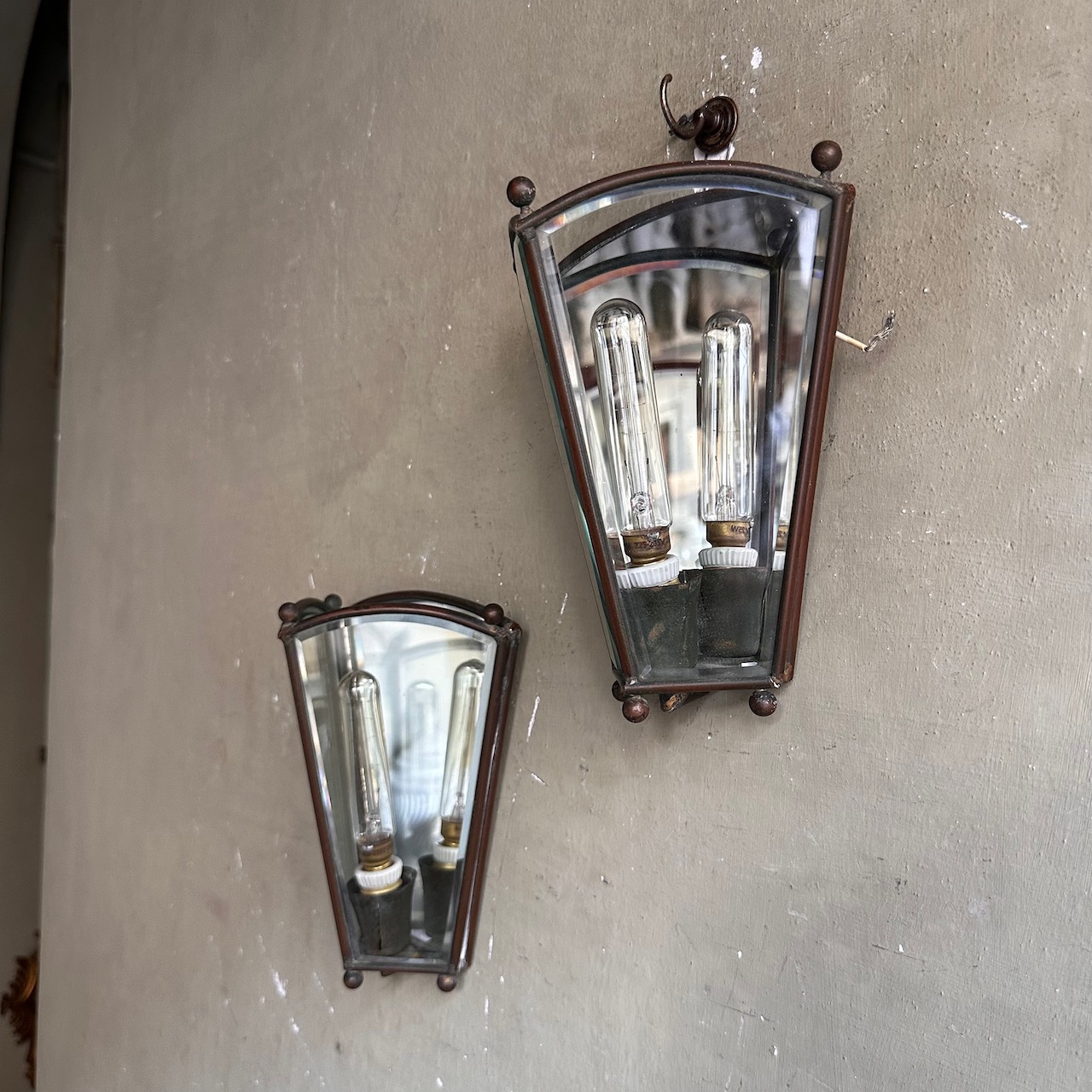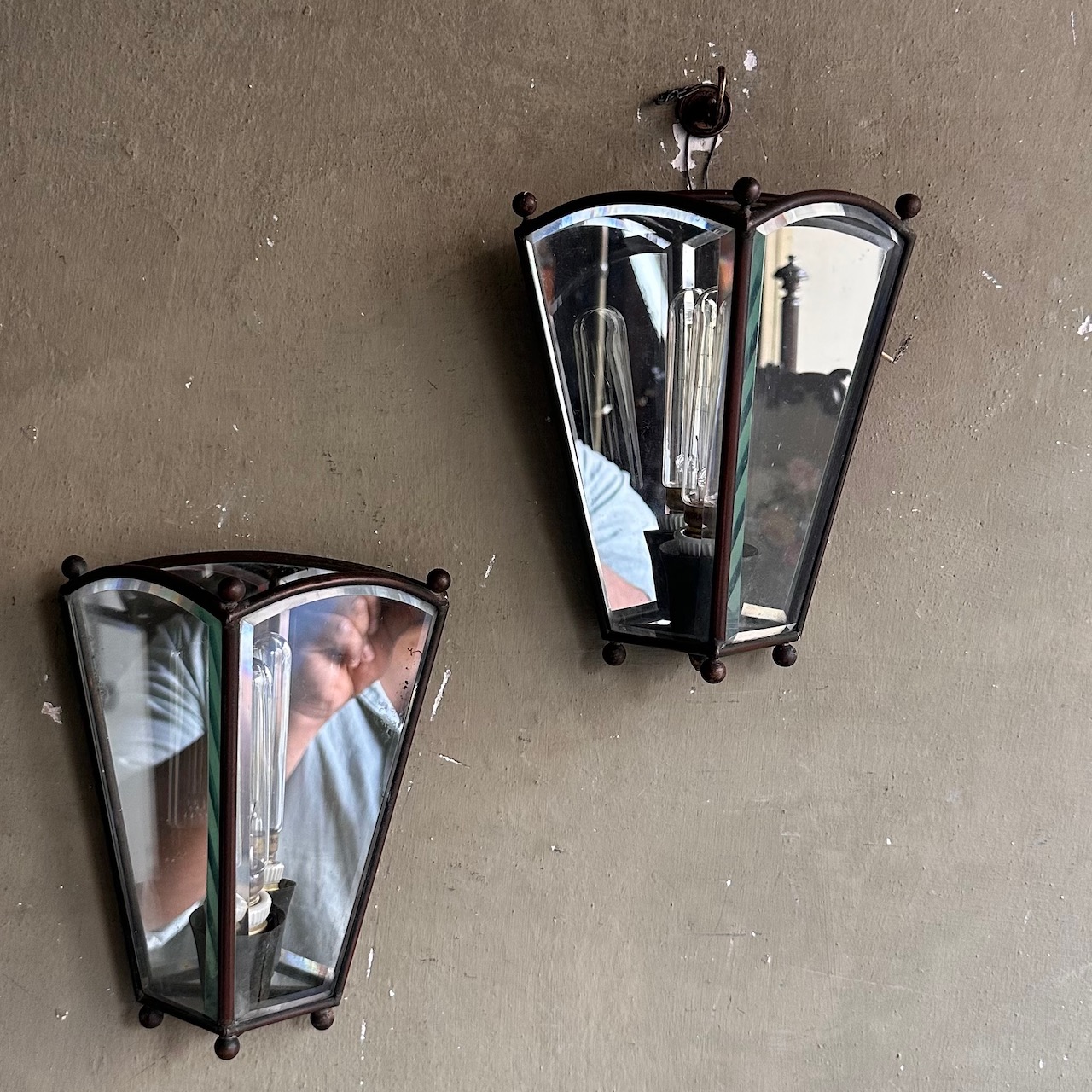 Coppia di applique in bronzo, fondo specchiato, parte frontale bipartita a vetro, Oscar Torlasco. Italia, sec. XX