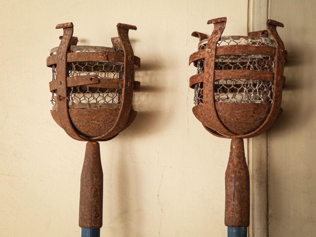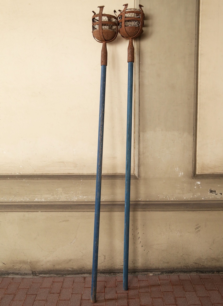 Coppia antiche torce astili da esterno in ferro. Italia, sec. XIX