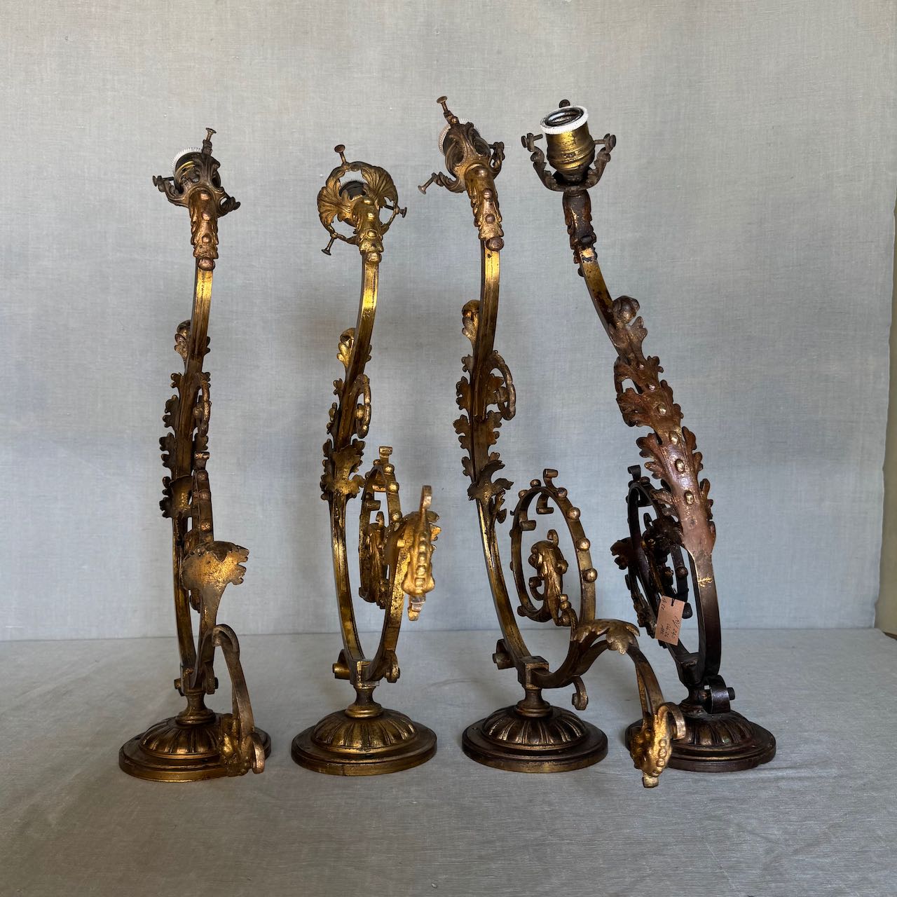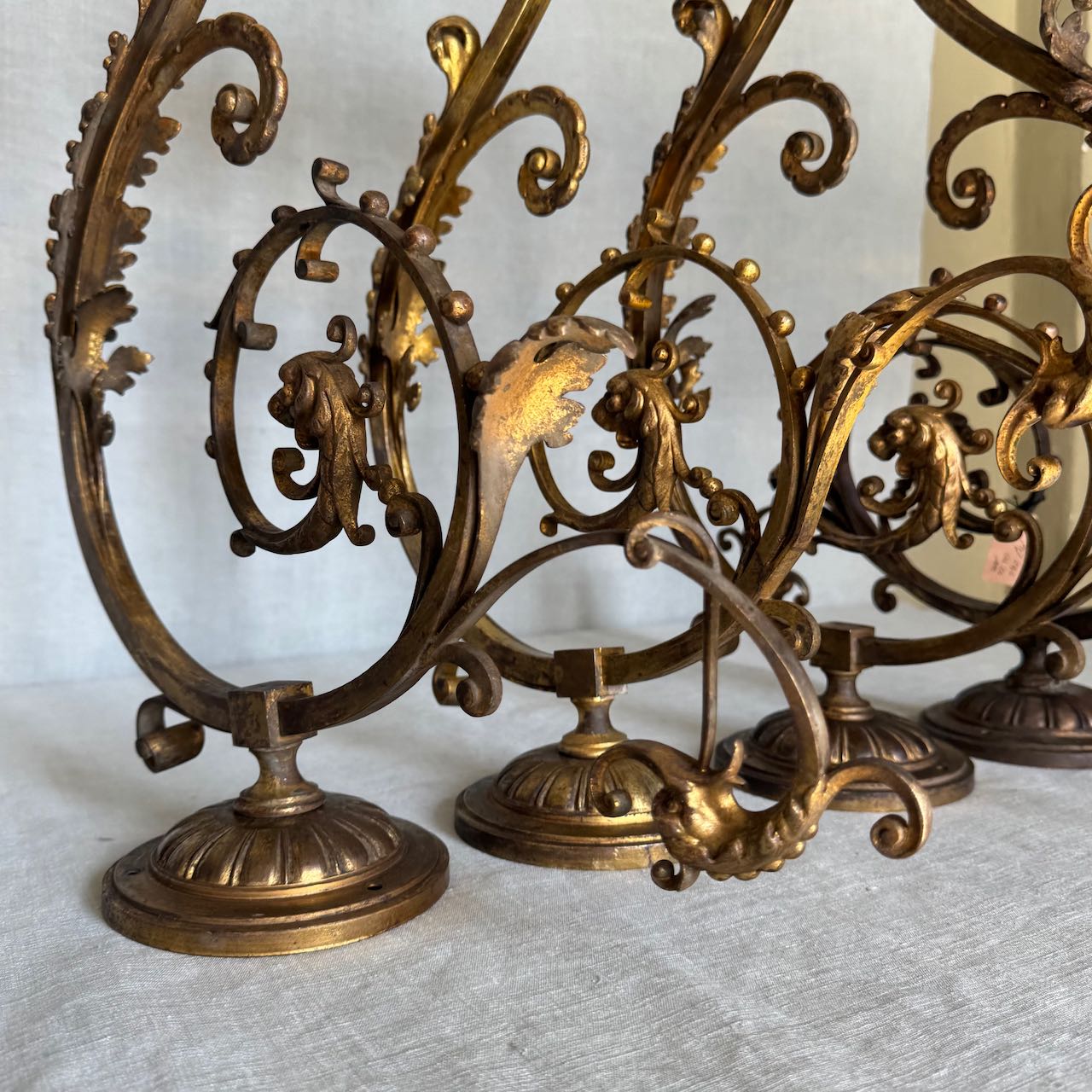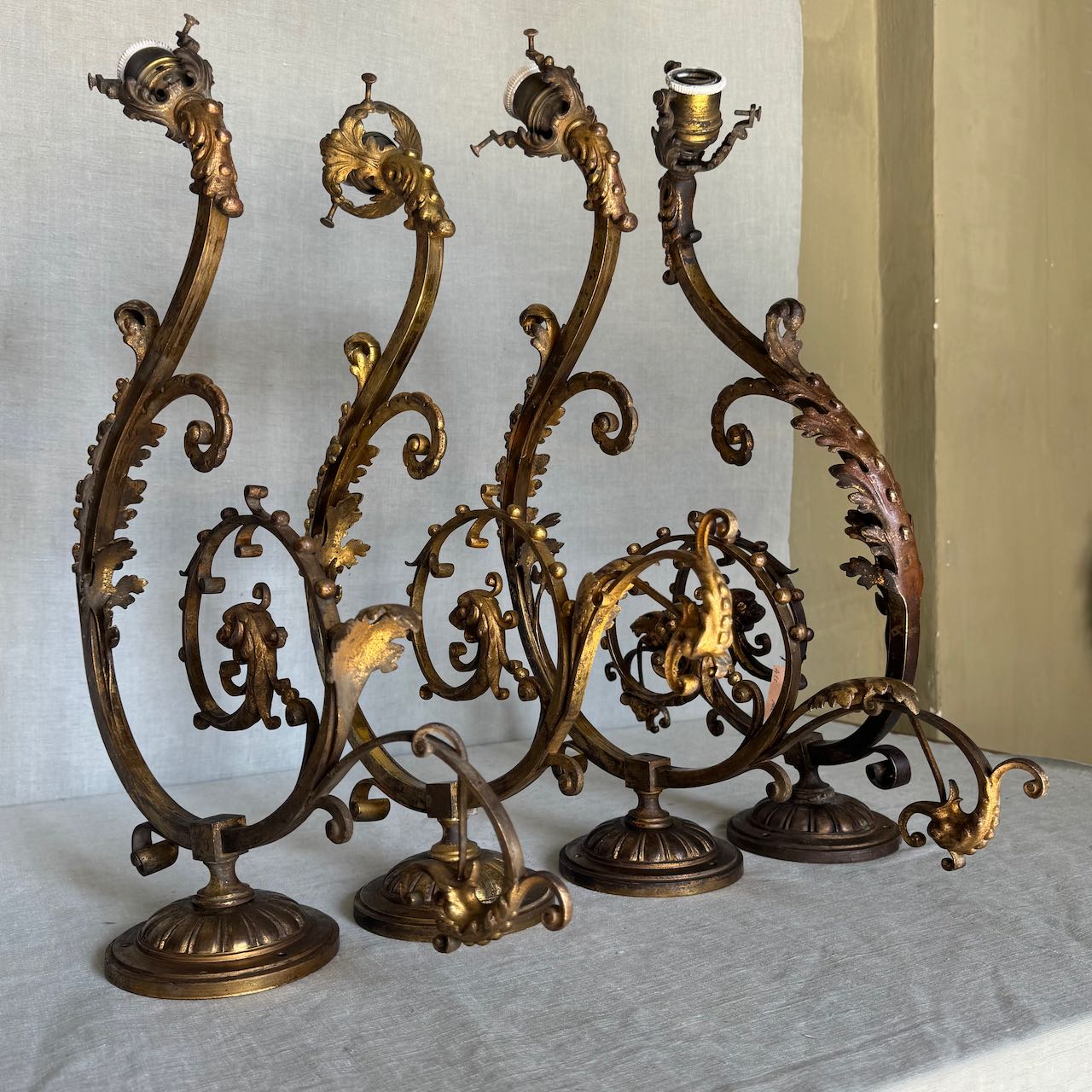Quattro lumiere a pare in bronzo dorato, braccio a ricciolo con decoro a foglie. Italia, sec. XIX