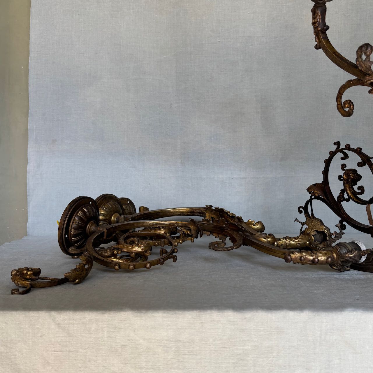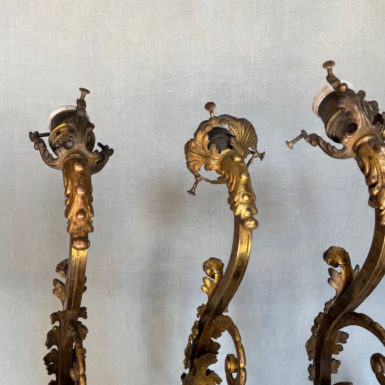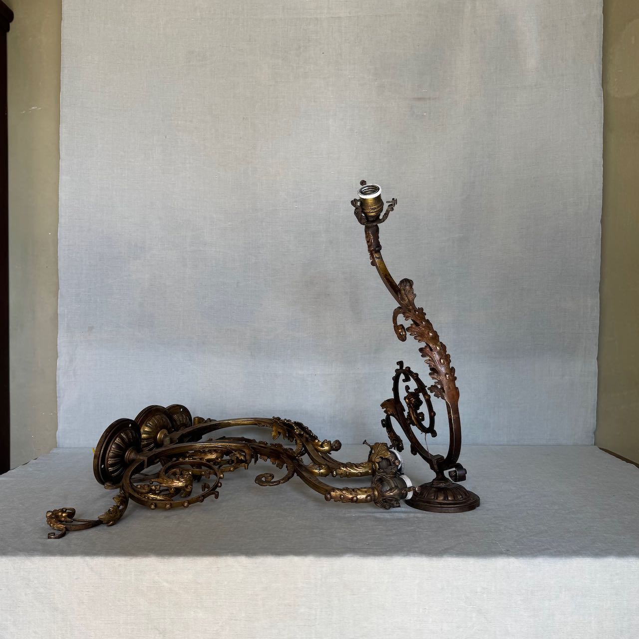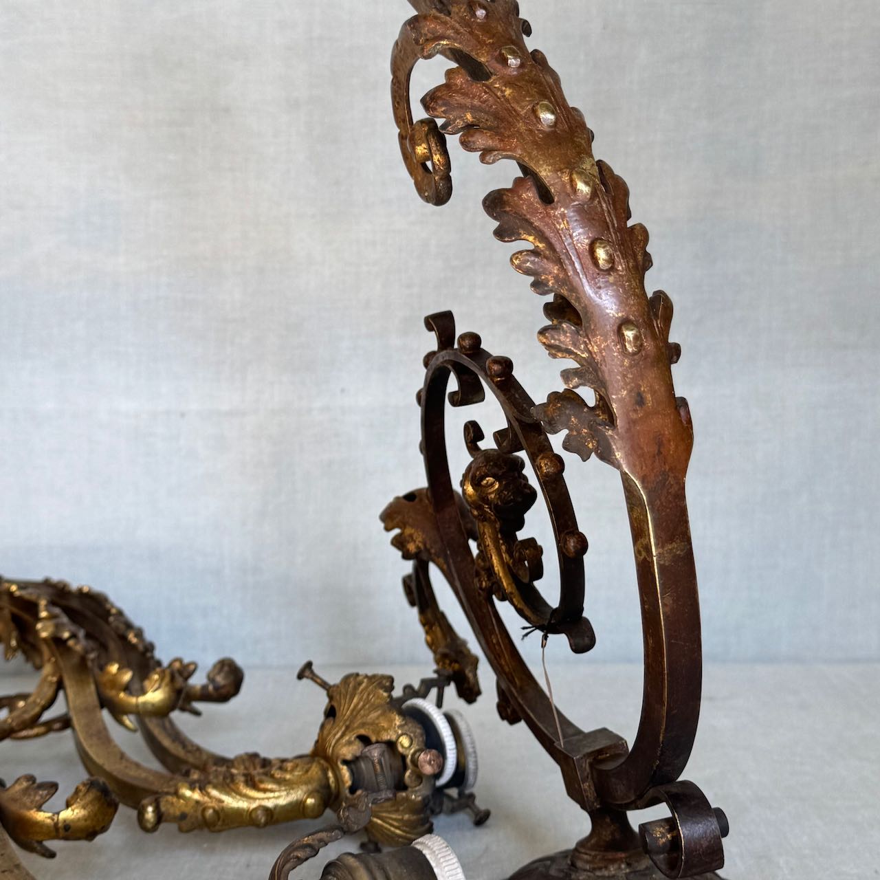 Quattro lumiere a pare in bronzo dorato, braccio a ricciolo con decoro a foglie. Italia, sec. XIX