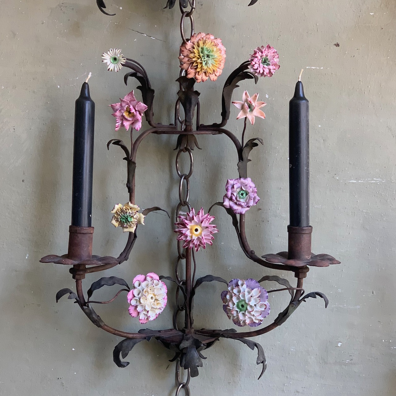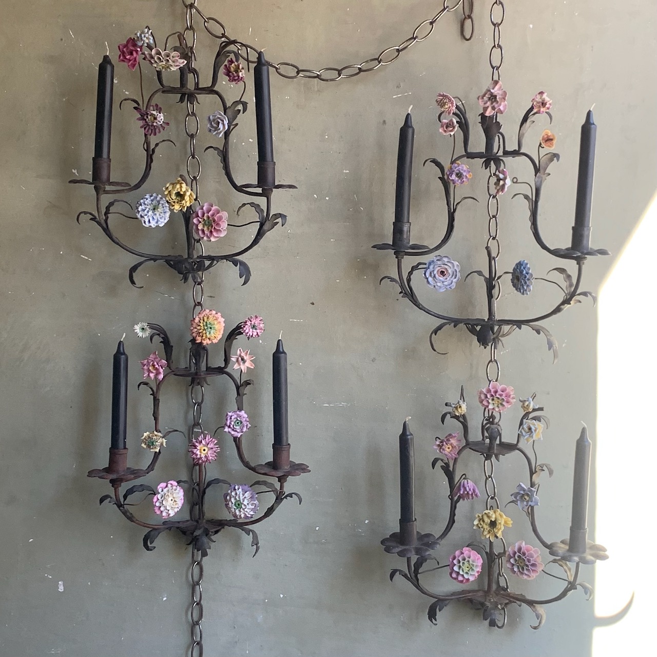 Quattro porta candele da parete in ferro battuto, a due bracci, decorati a tralci e fiori smaltati policromi. Italia, sec. XX