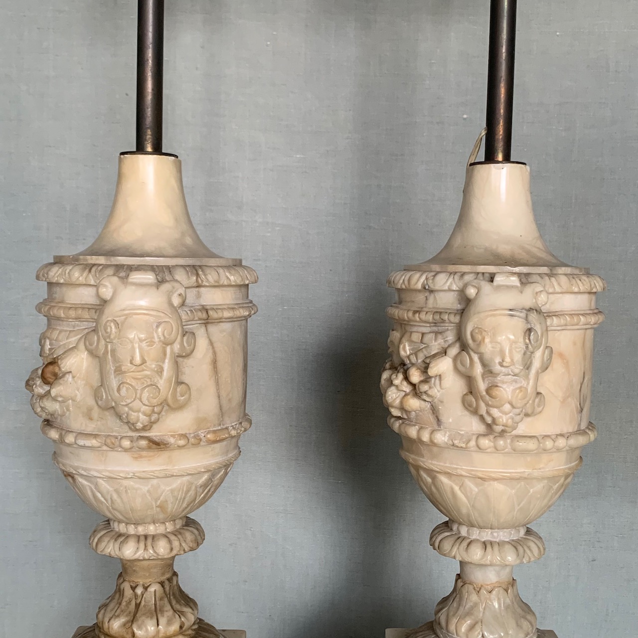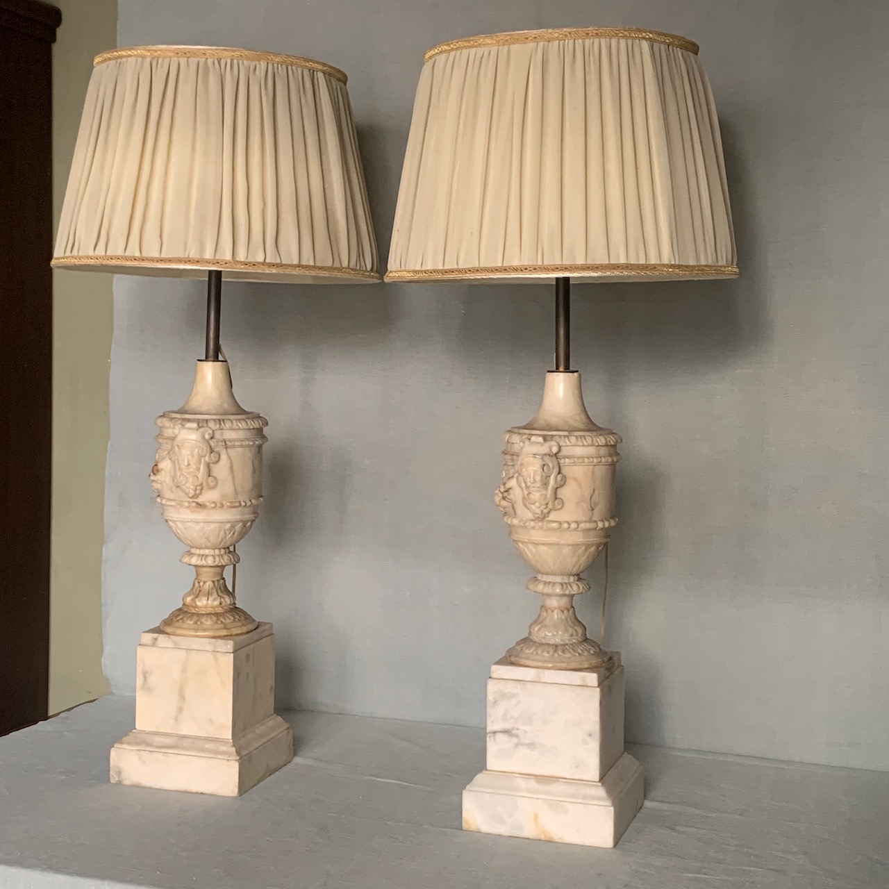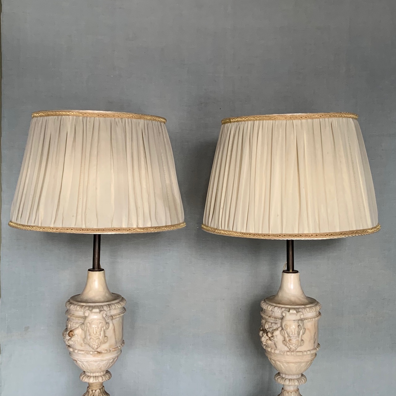 Coppia di lampade da tavolo a vaso su plinto, in alabastro scolpito, paralume in seta avorio. Italia, sec. XIX PARALUME NOLEGGIATO/VENDUTO SEPARATAMENTE