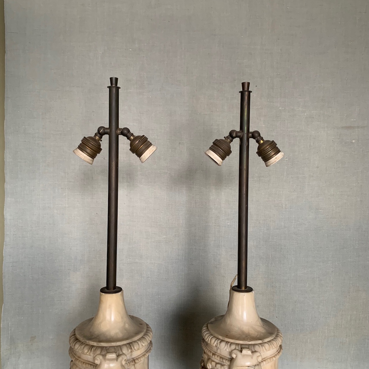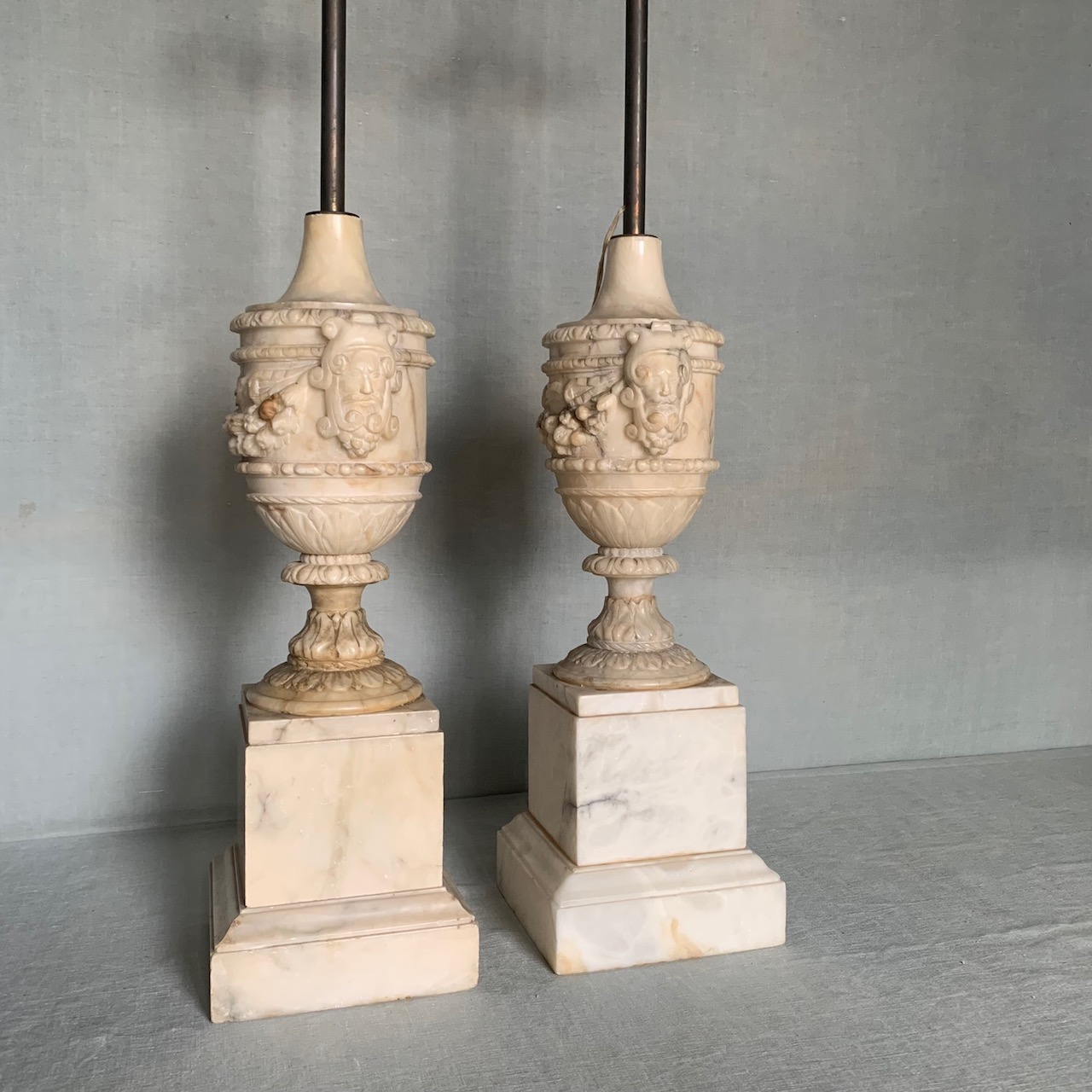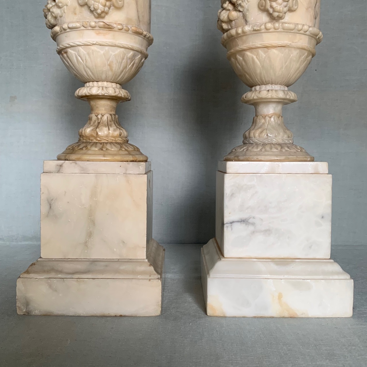 Coppia di lampade da tavolo a vaso su plinto, in alabastro scolpito, paralume in seta avorio. Italia, sec. XIX PARALUME NOLEGGIATO/VENDUTO SEPARATAMENTE