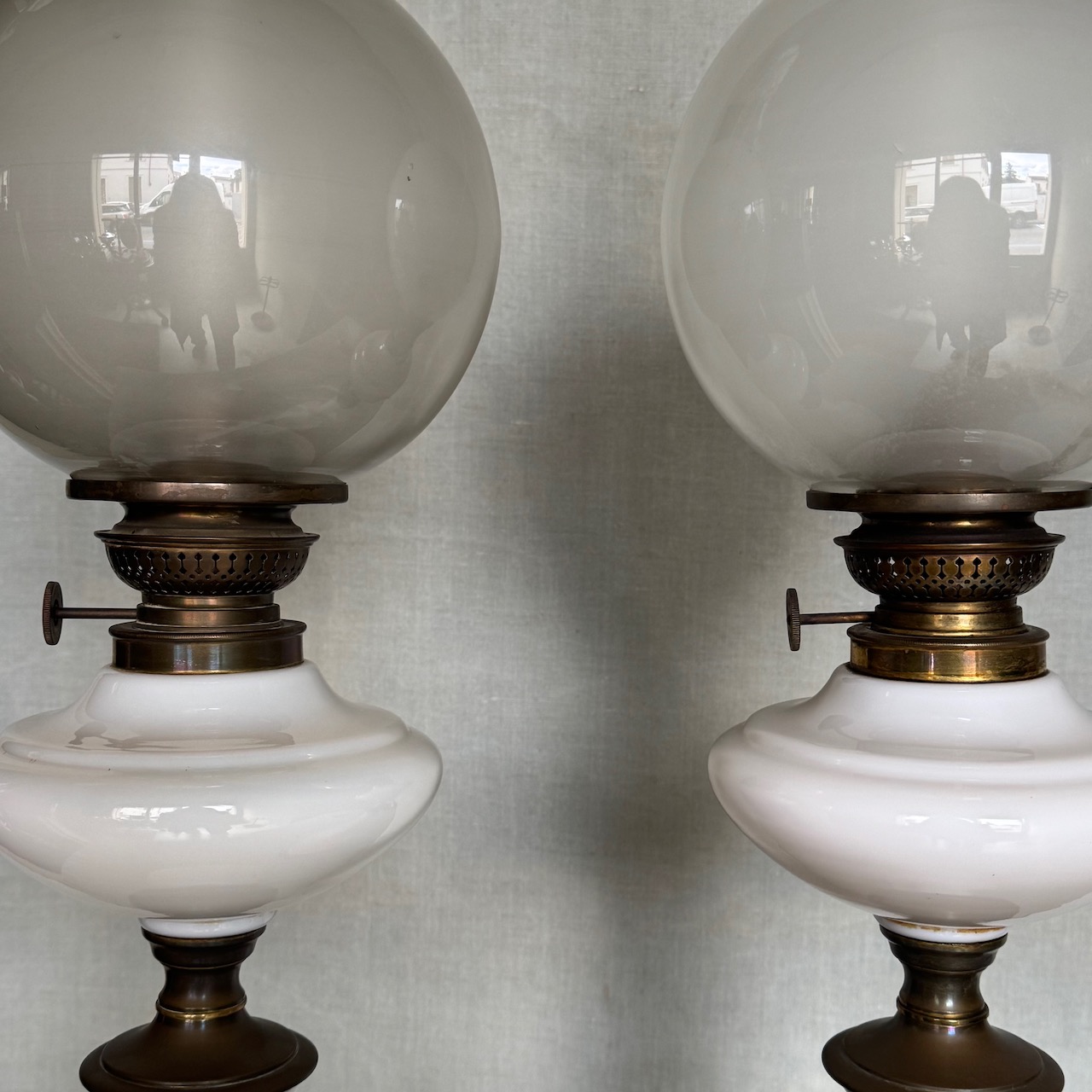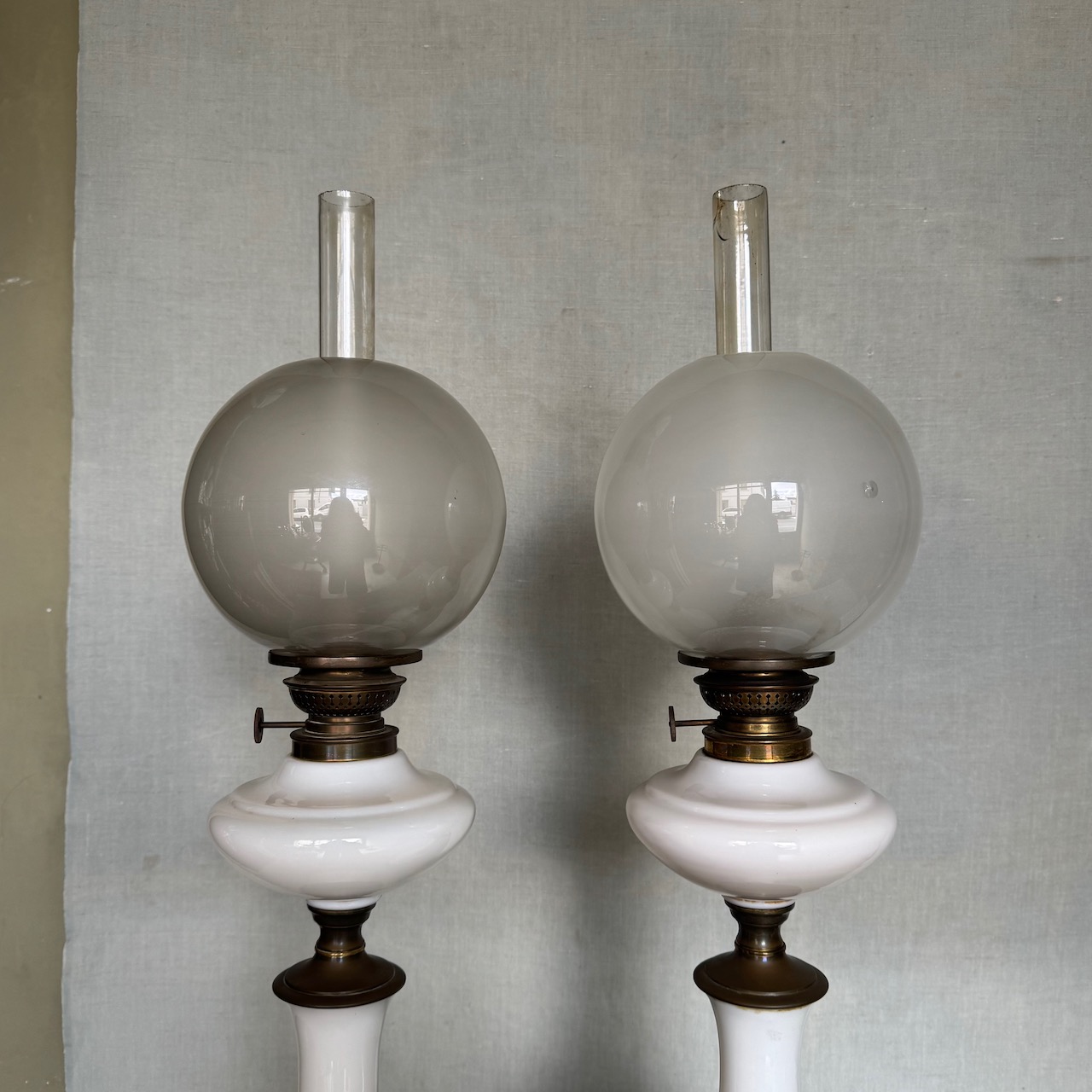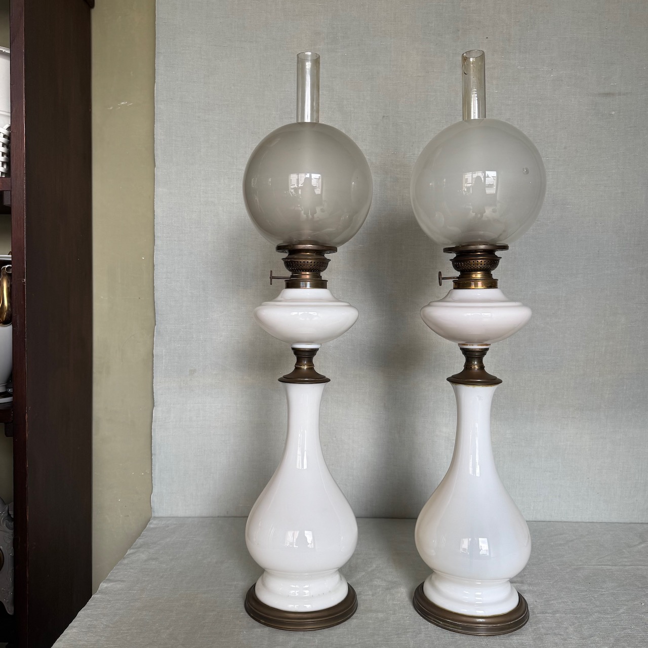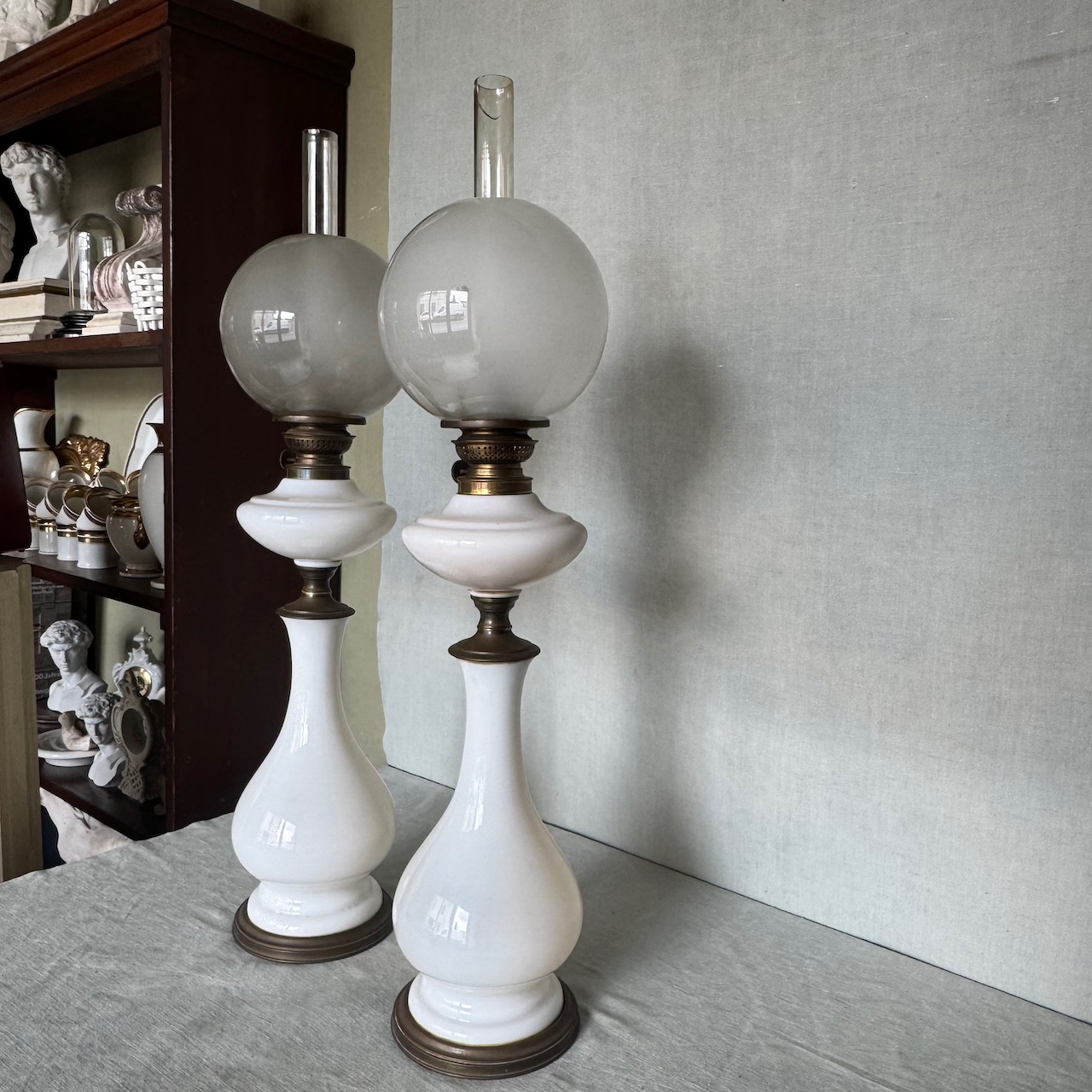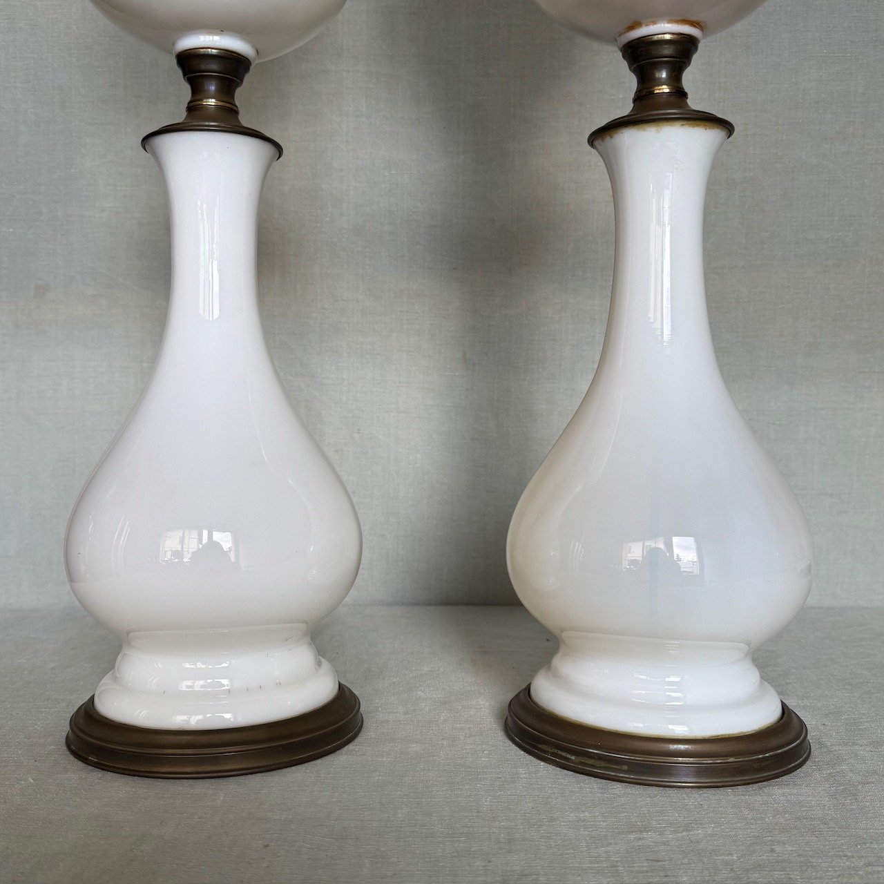 Coppia di grandi lumi da tavolo ad olio, in opalina bianca, fusto a balaustro su base circolare in metallo dorato, globo e cartoccio in vetro soffiato. Italia, sec. XIX