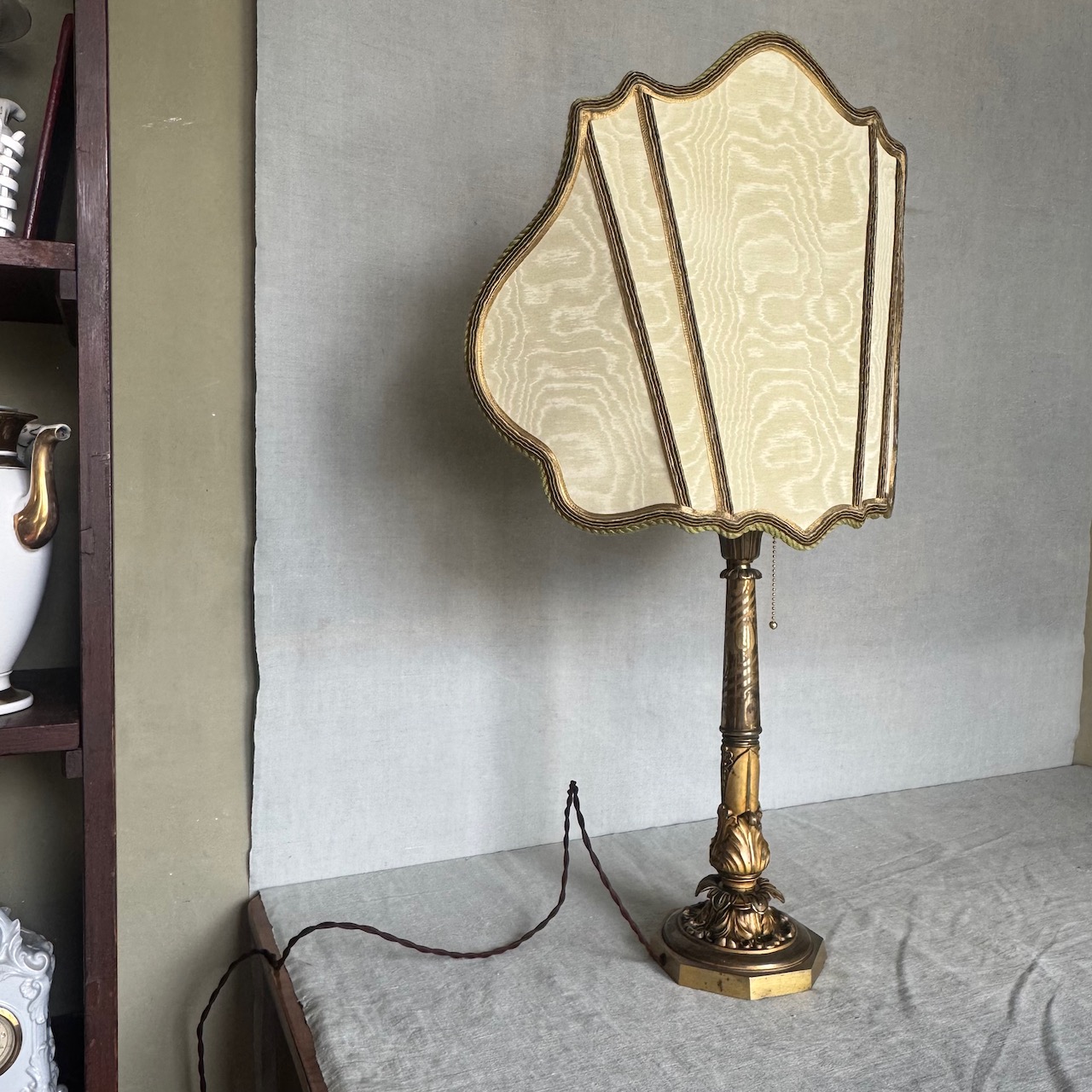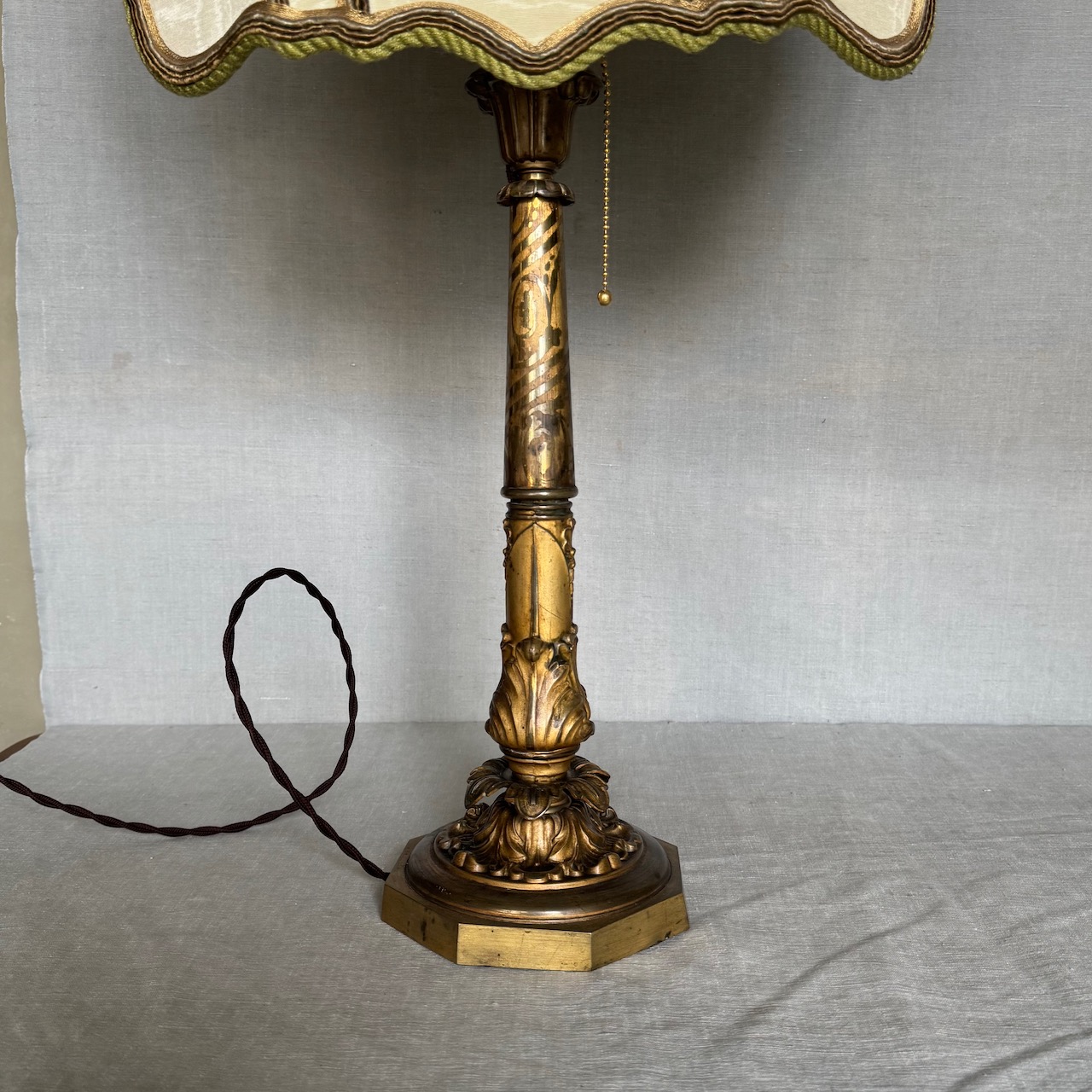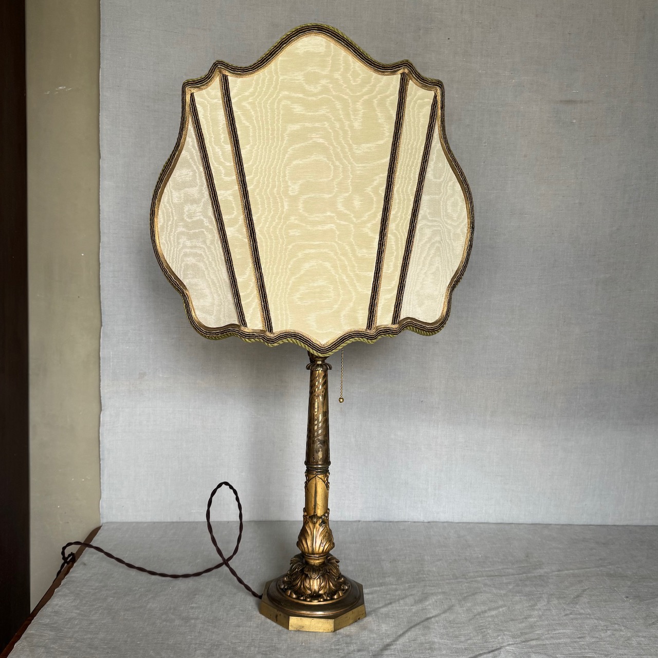 Grande lume da tavolo in bronzo dorato, stelo a colonna sbalzato con foglie d'acanto, corredato da paralume sagomato in tessuto avorio con dettagli in passamaneria. Italia sec. XX