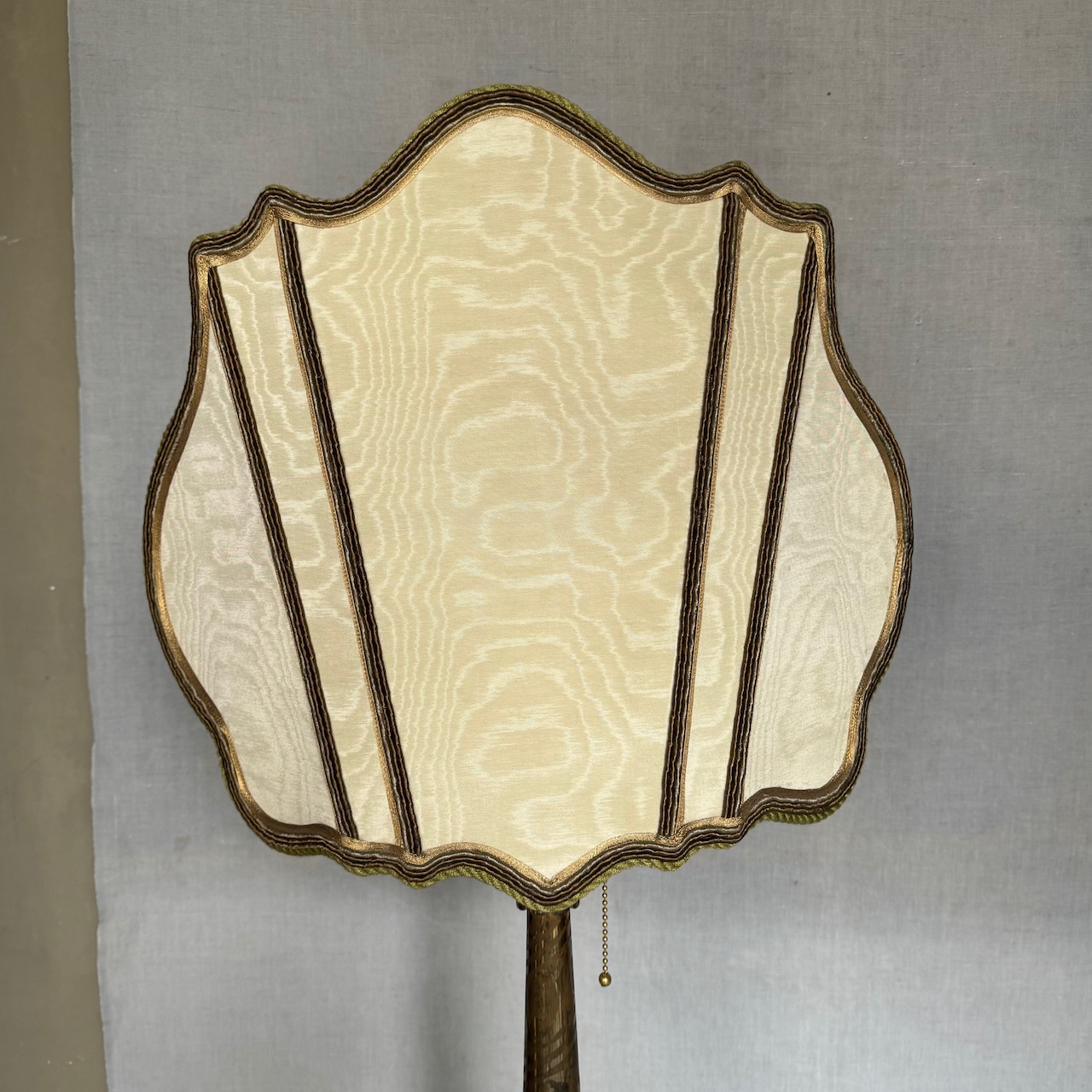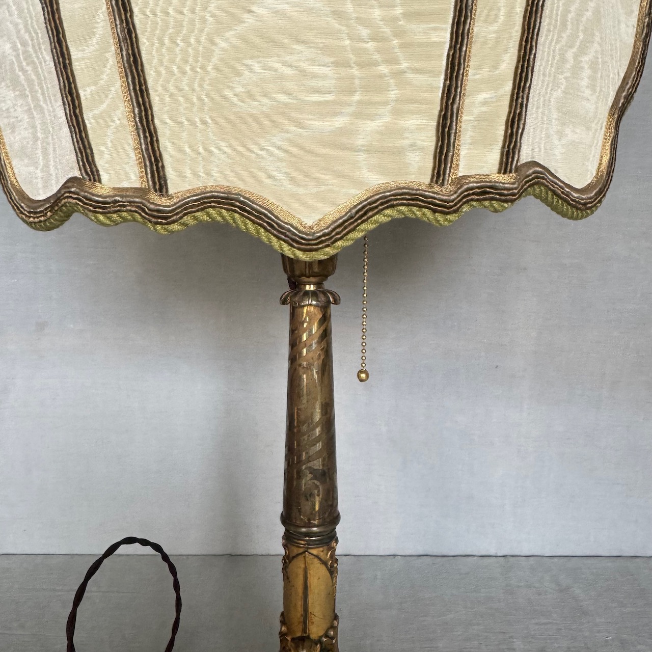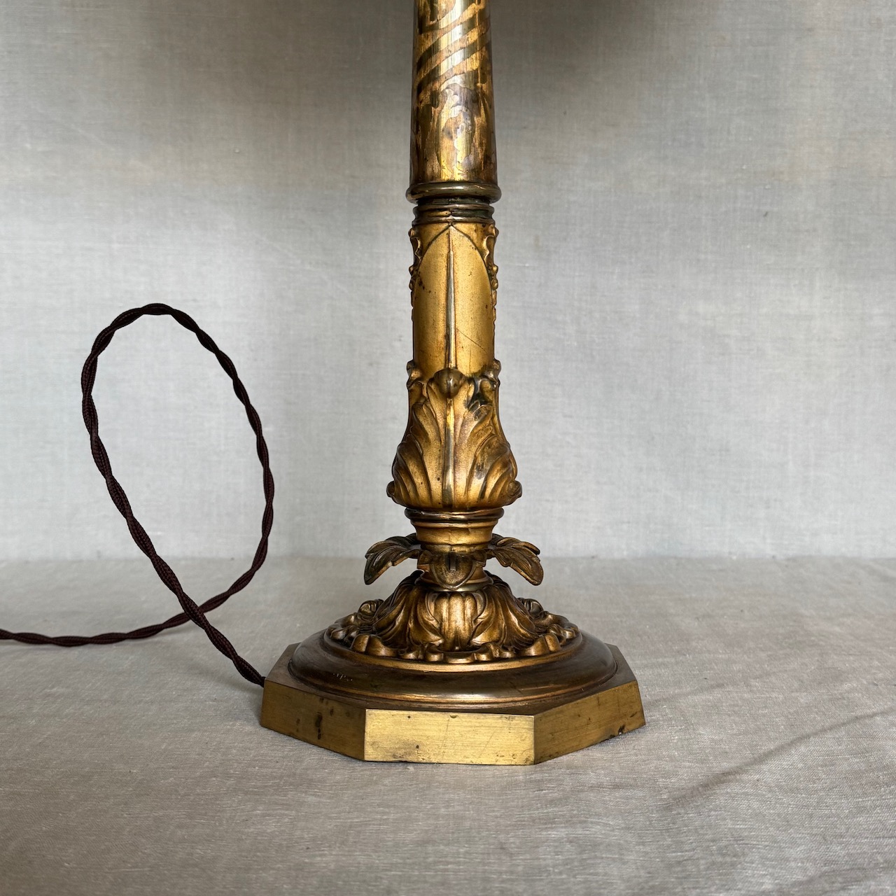 Grande lume da tavolo in bronzo dorato, stelo a colonna sbalzato con foglie d'acanto, corredato da paralume sagomato in tessuto avorio con dettagli in passamaneria. Italia sec. XX