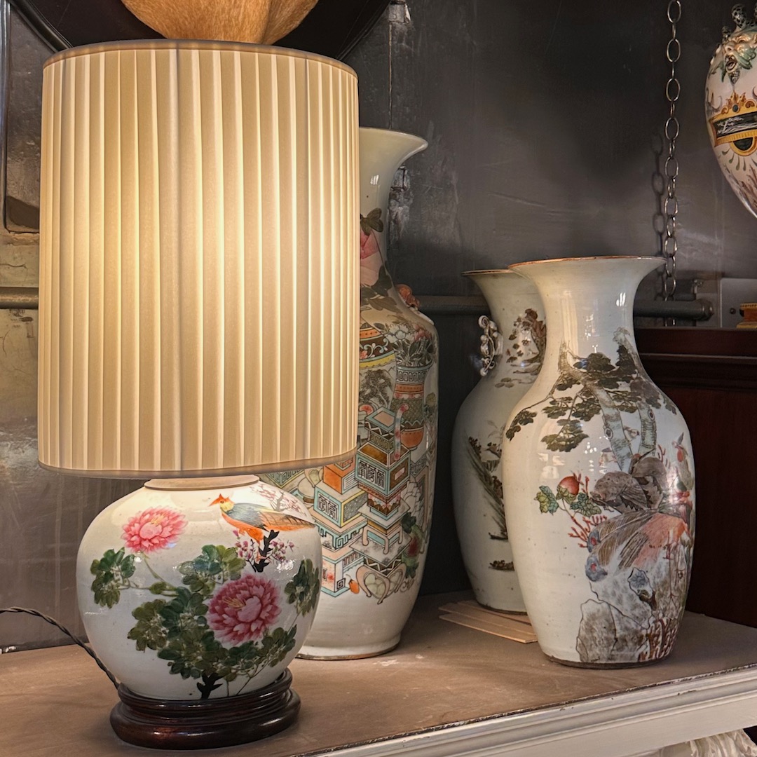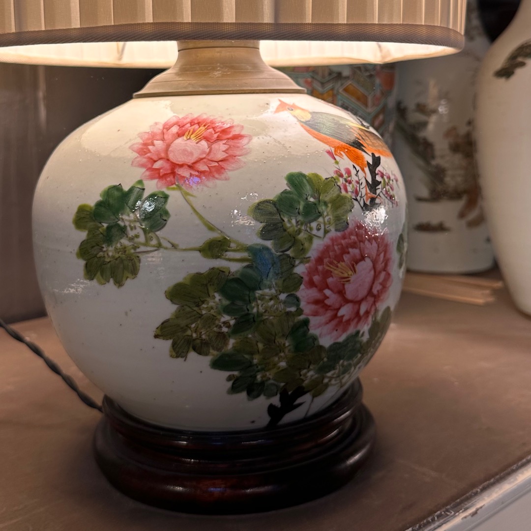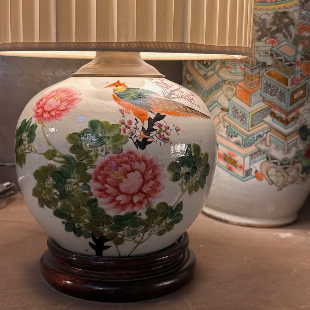 Potiche lampada da tavolo in porcellana policroma decorata a peonie e volatili. Cina, dinastia Quing, fine sec. XIX