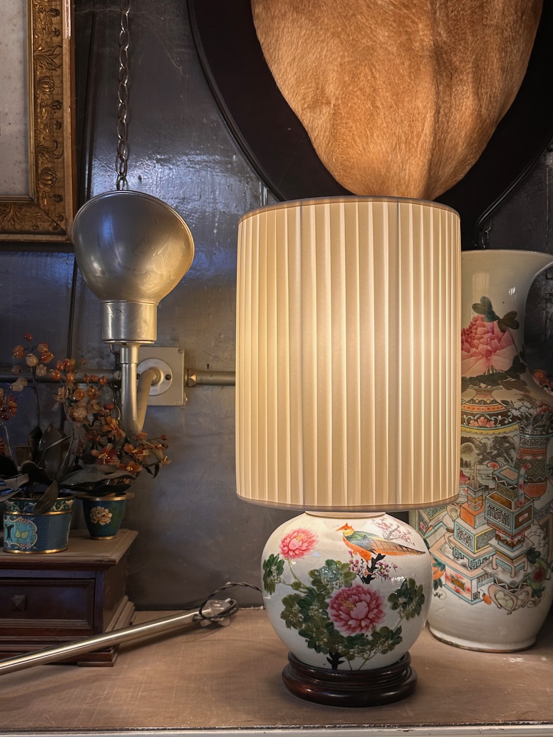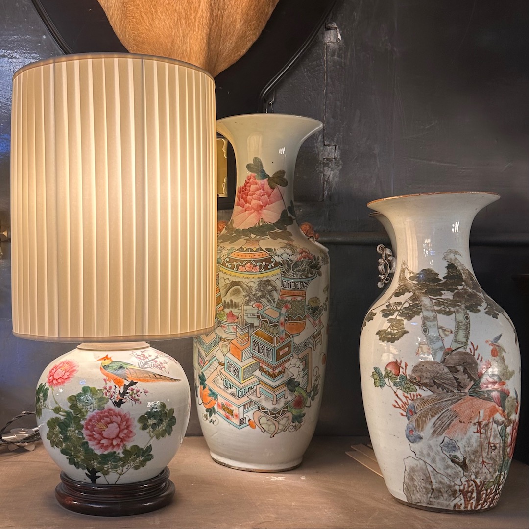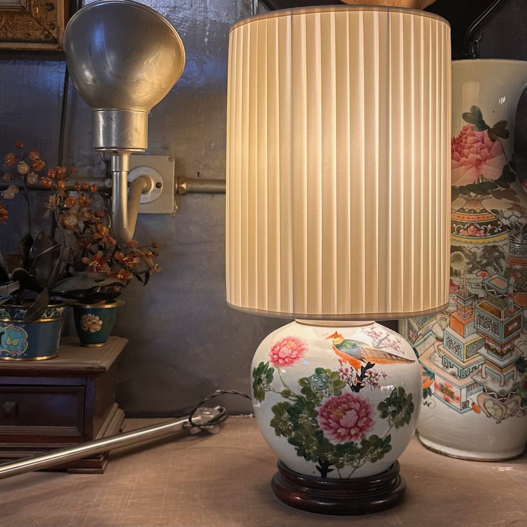 Potiche lampada da tavolo in porcellana policroma decorata a peonie e volatili. Cina, dinastia Quing, fine sec. XIX