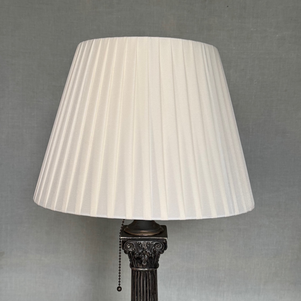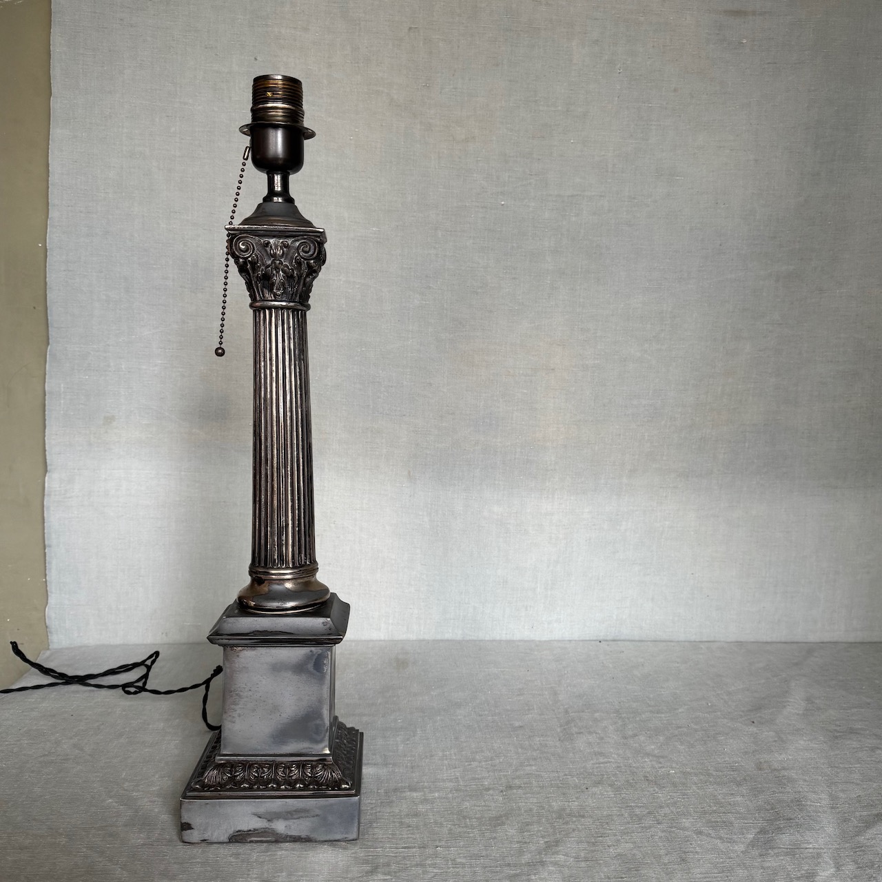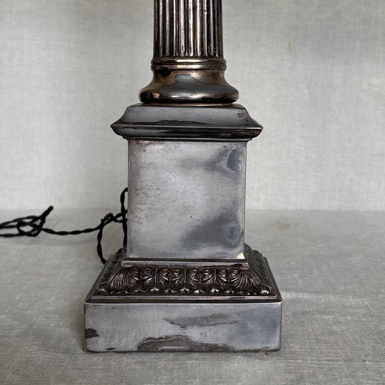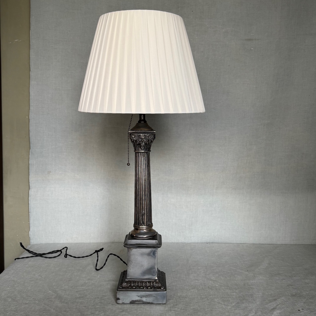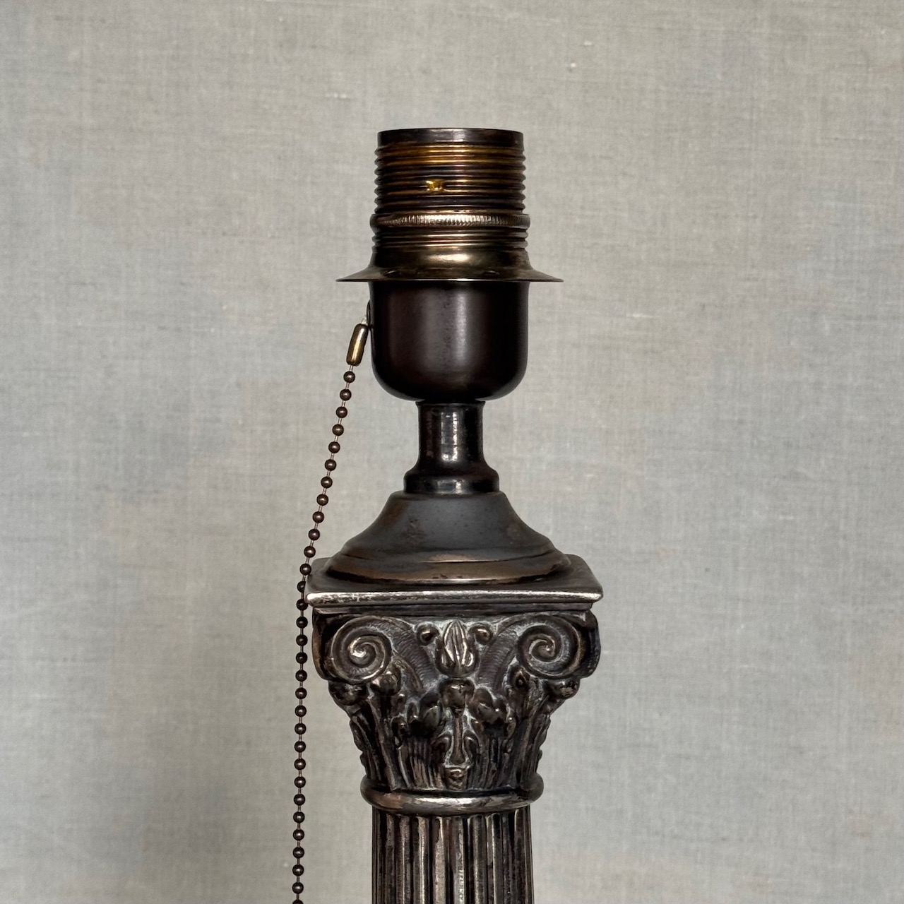 Lampada da tavolo Vittoriana in argento su rame, fusto a colonna corinzia su base a plinto. Italia, sec. XIX