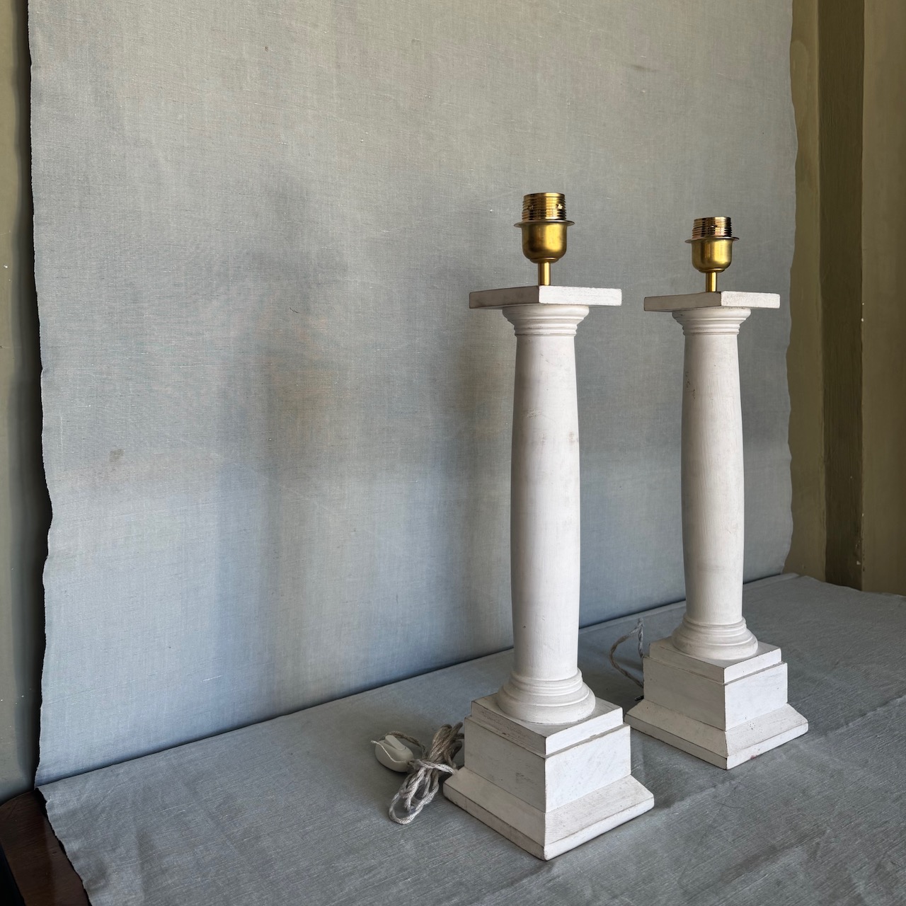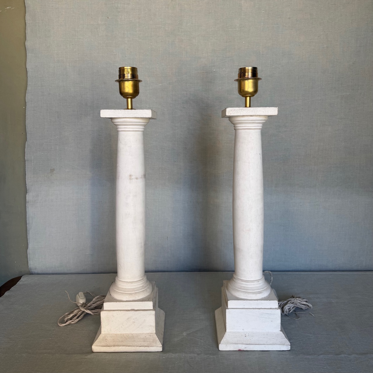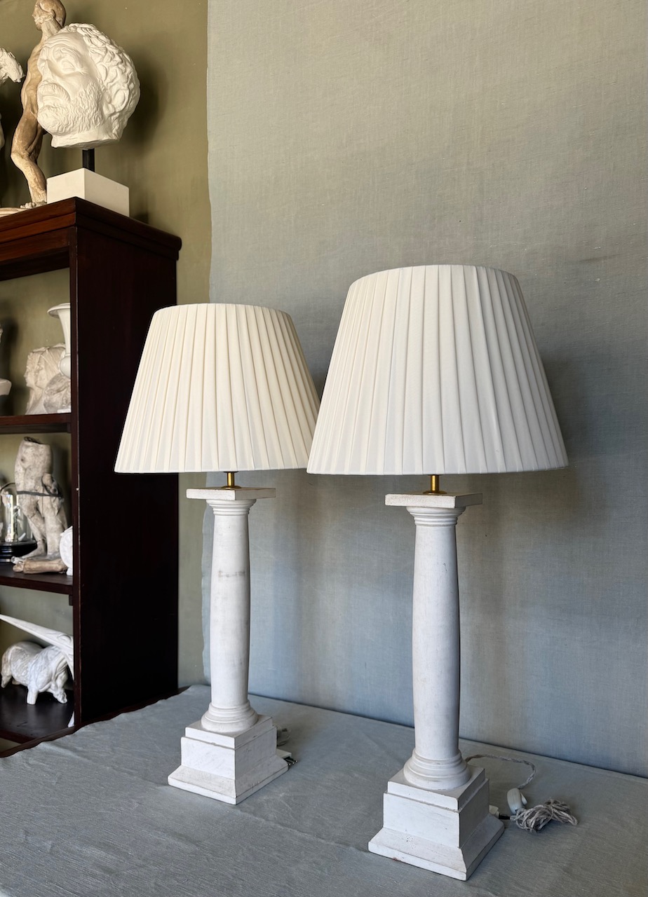 Coppia Grandi lampade da tavolo a colonna rastremata con capitello tuscanico in legno tornito ad ammannitura di gesso di bologna, accensione a catenella, cavo treccia in canapa. Italia sec. XX