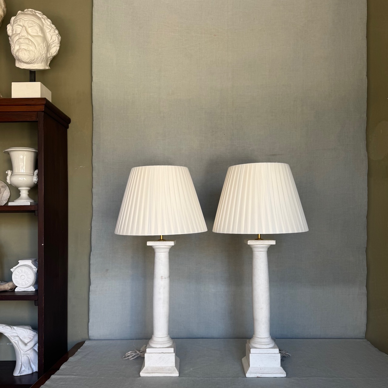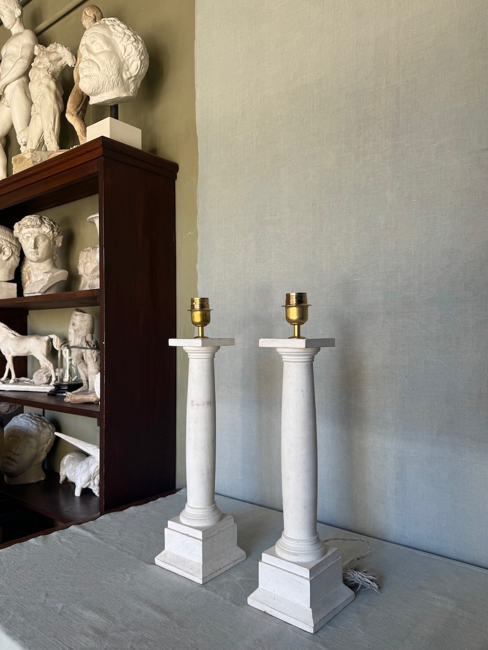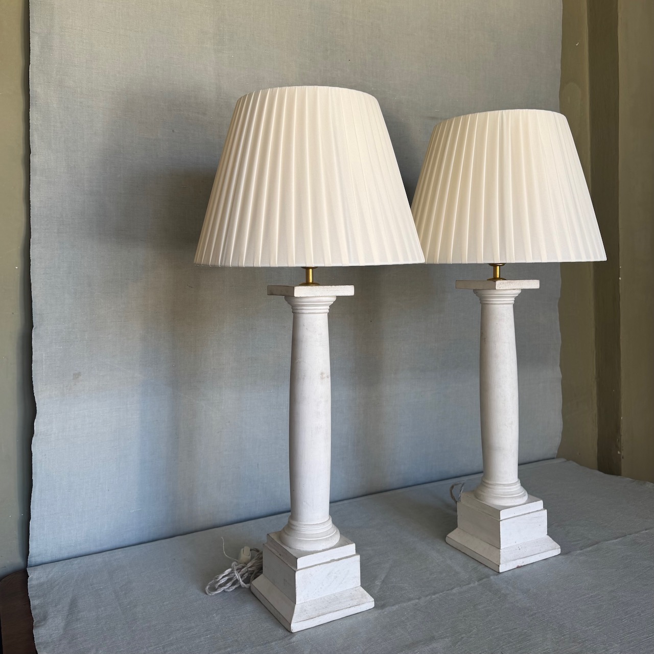 Coppia Grandi lampade da tavolo a colonna rastremata con capitello tuscanico in legno tornito ad ammannitura di gesso di bologna, accensione a catenella, cavo treccia in canapa. Italia sec. XX