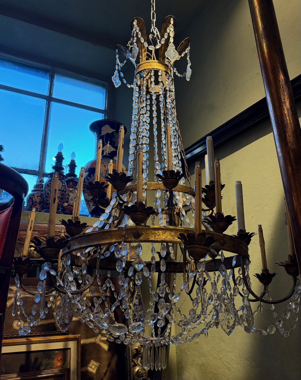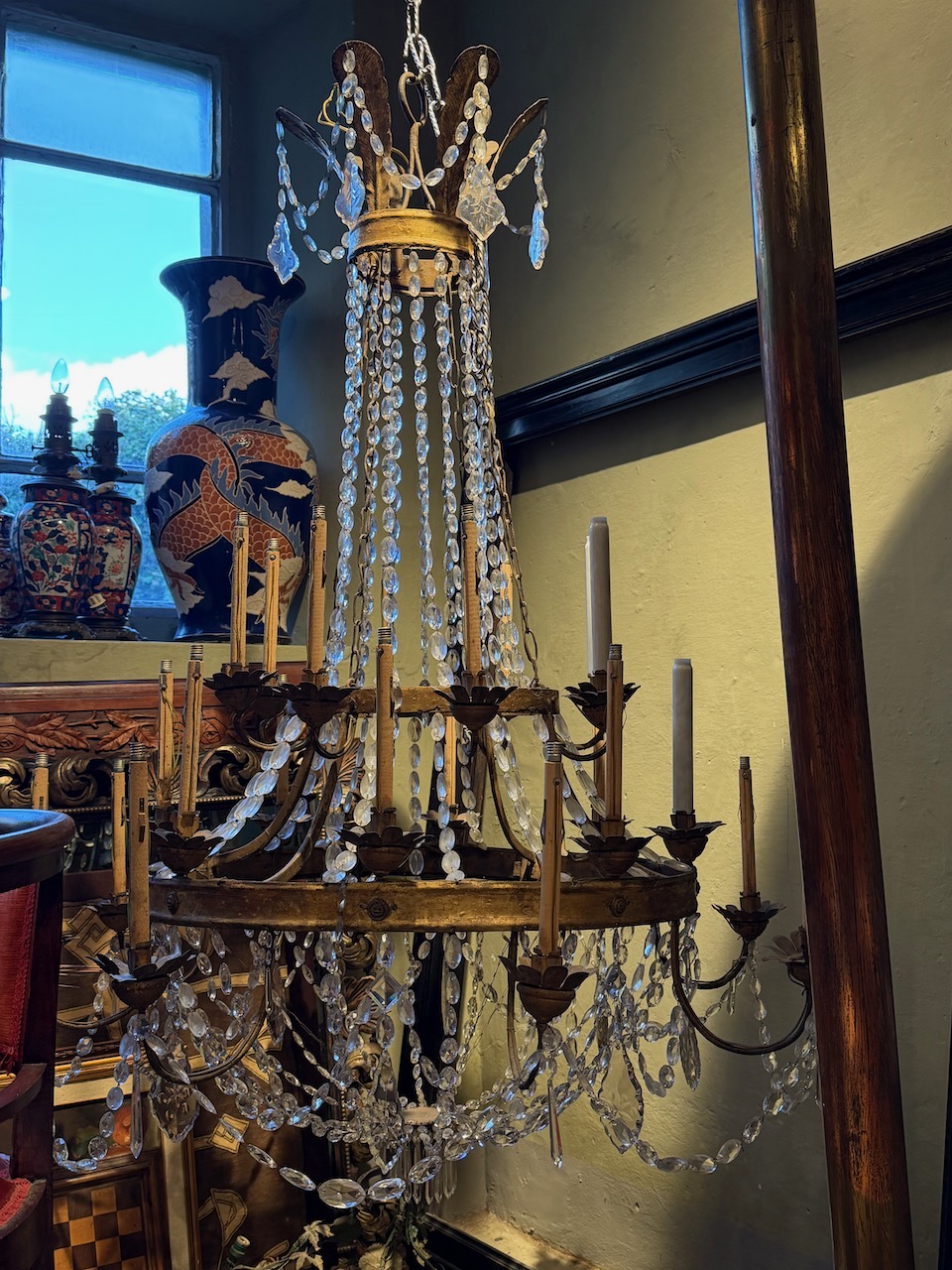 Grande lampadario impero a paniere in cristallo e tole dorato, ventiquattro bracci portacandele su tre ordini con bobeche a margherita, catene di perle briolette e pendenti, sormontato da corona di piume. Italia, inizio sec. XIX
