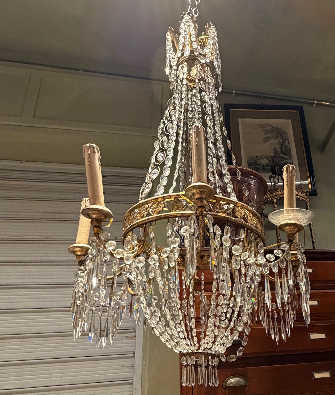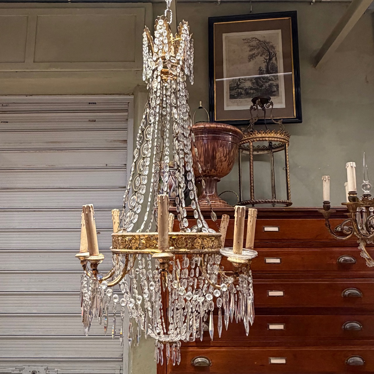 Grande lampadario a paniere in vetro e tole dorato, otto bracci portacandele su un ordine con bobeche in vetro, catene di perle e festoni di pendenti. Italia, fine sec. XIX inizio sec. XX