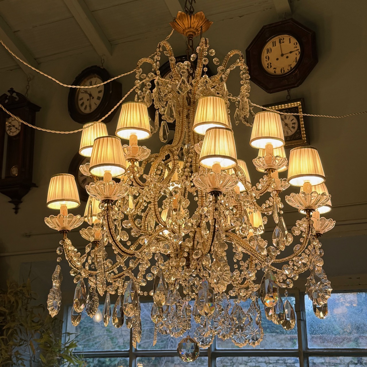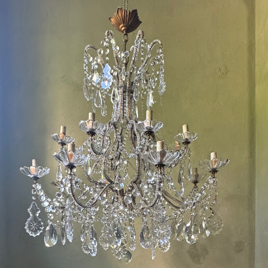 Grande Lampadario a doppio palco e sedici luci con fusto circolare in metallo dorato rivestito in fili di cristallo. Firenze, metà sec. XX