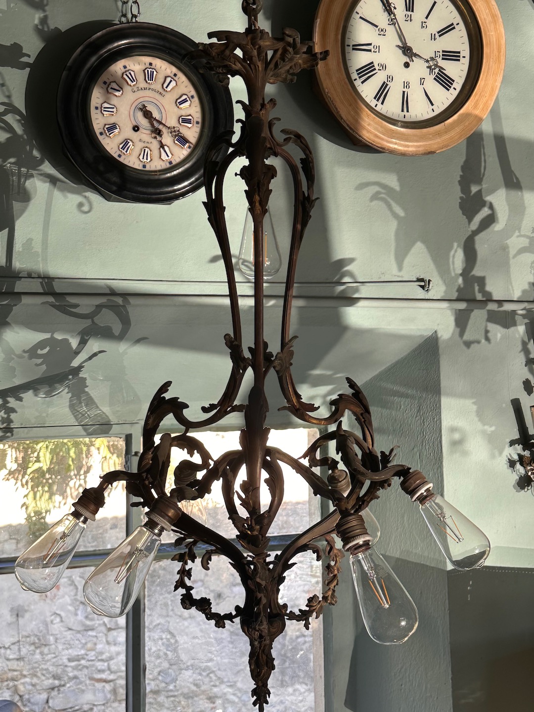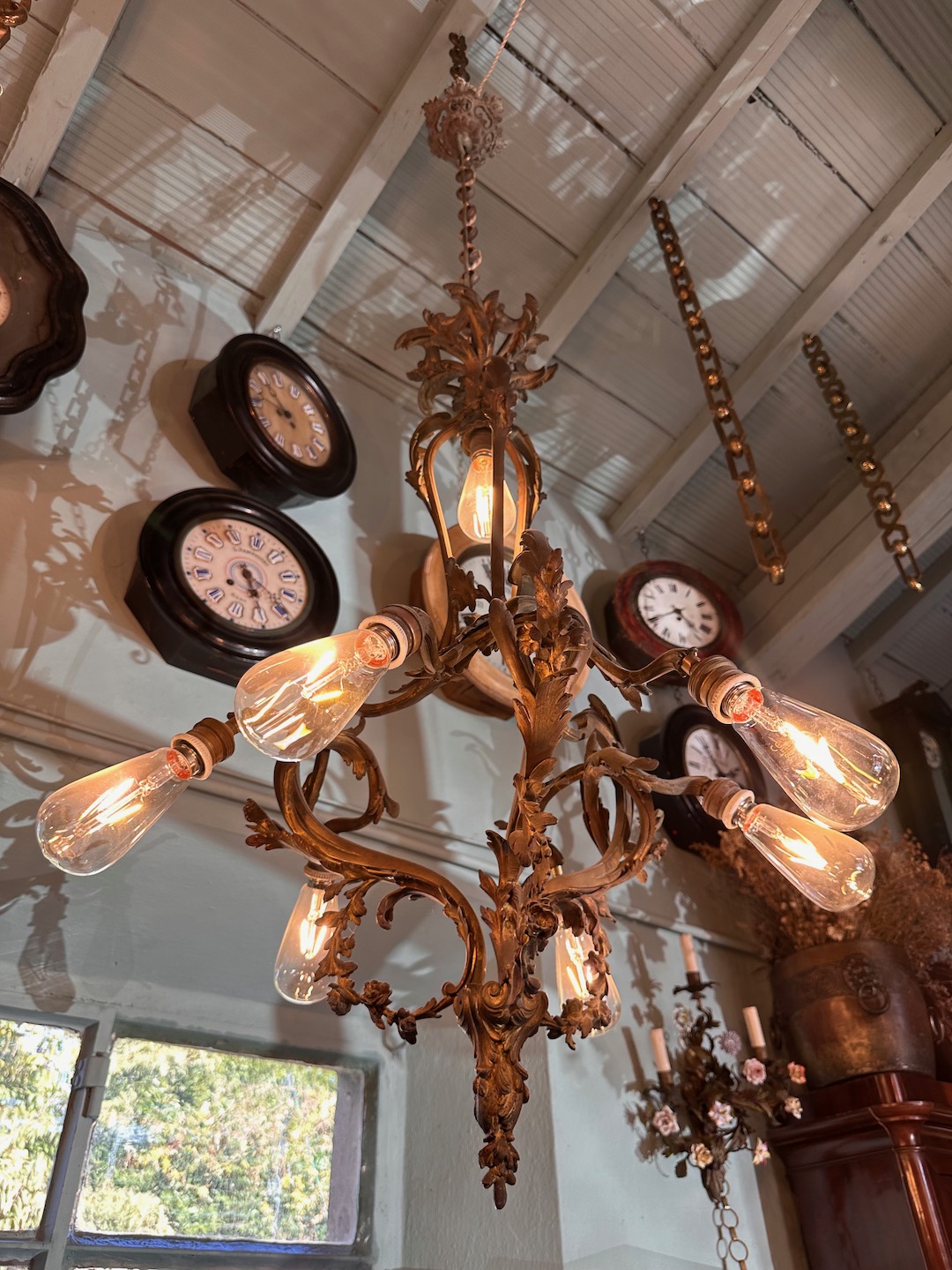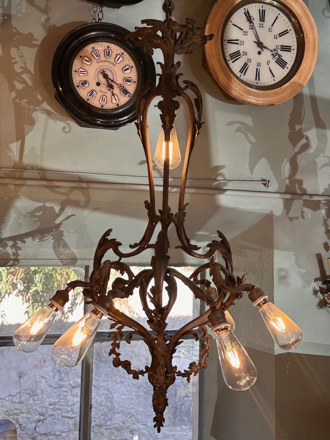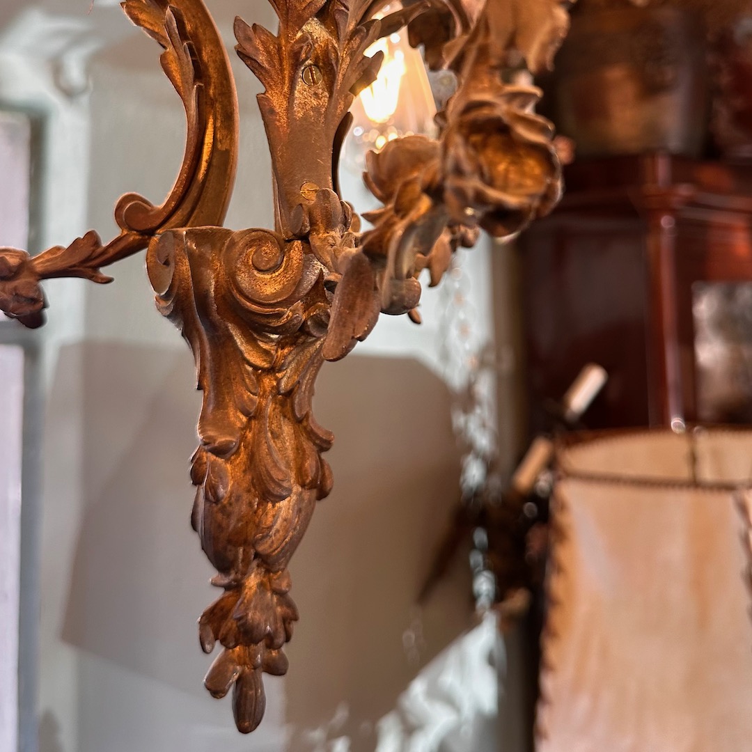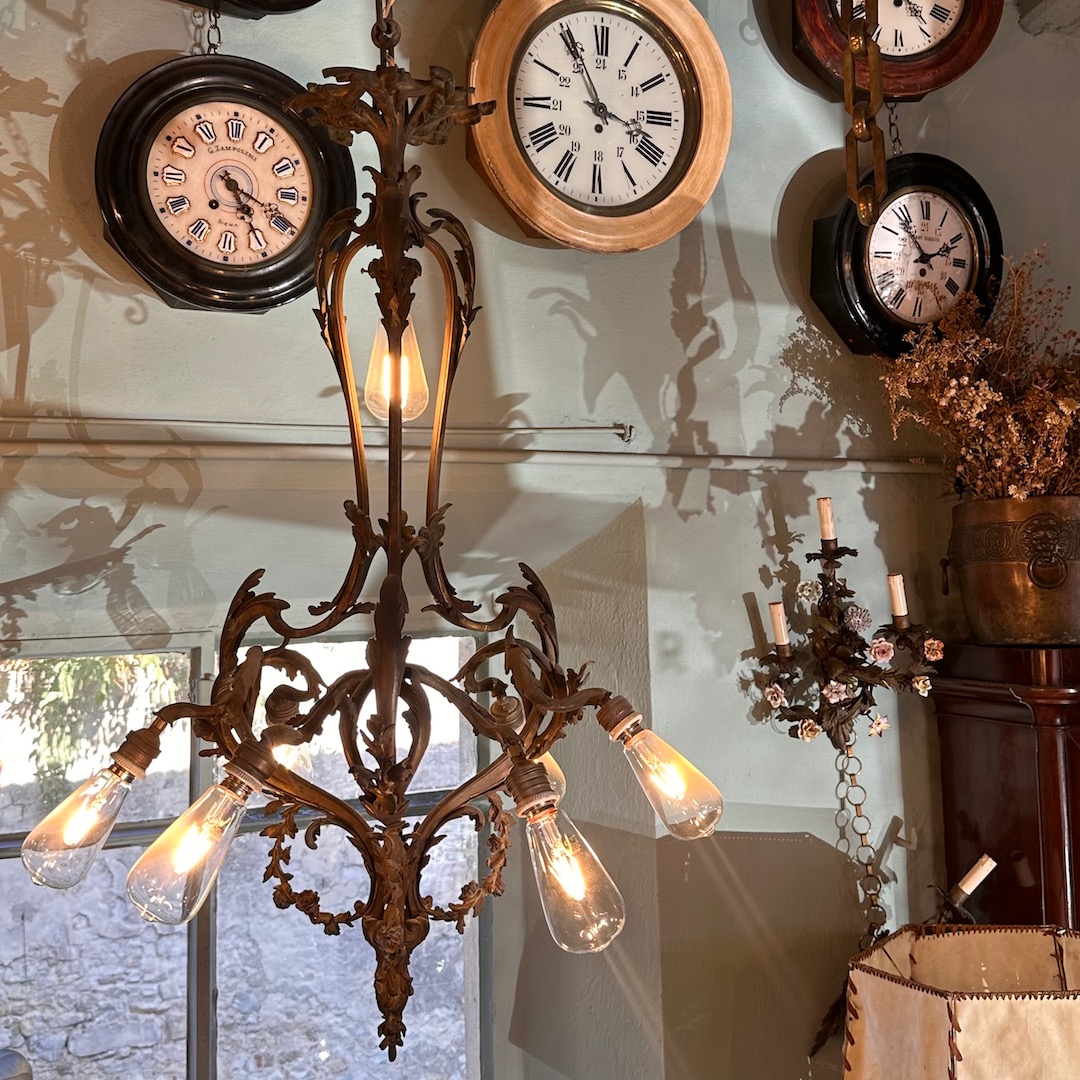 Grande lampadario genovese in bronzo dorato a sette luci, bracci a volute contrapposte desinenti foglie d acanto, catene e rosette en suite. Italia, fine sec. XIX