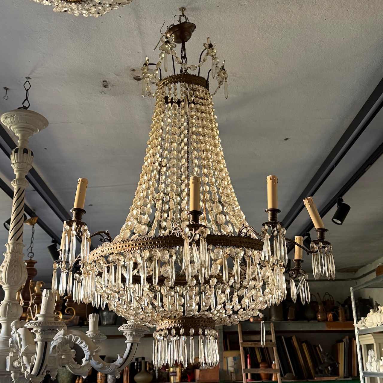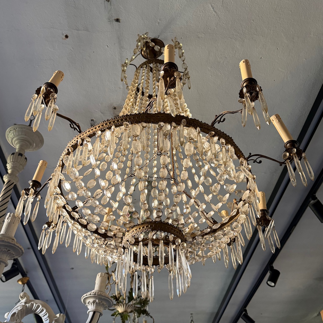Grande lampadario a paniera in cristallo e tole dorato, dieci bracci portacandele, catene di perle e pendenti sfaccettati. Italia, sec. XIX