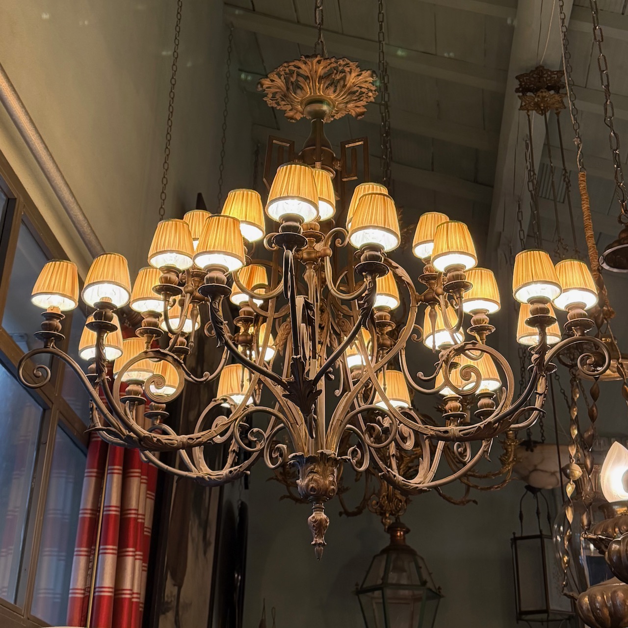 Grande lampadario in bronzo patinato a trenta luci, bracci a motivi e fogliacei. Italia 1840 circa