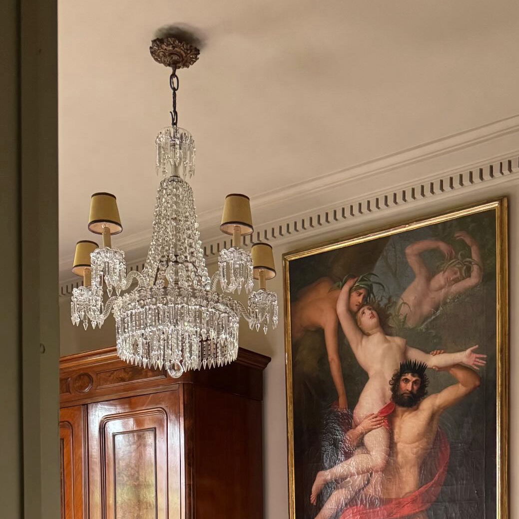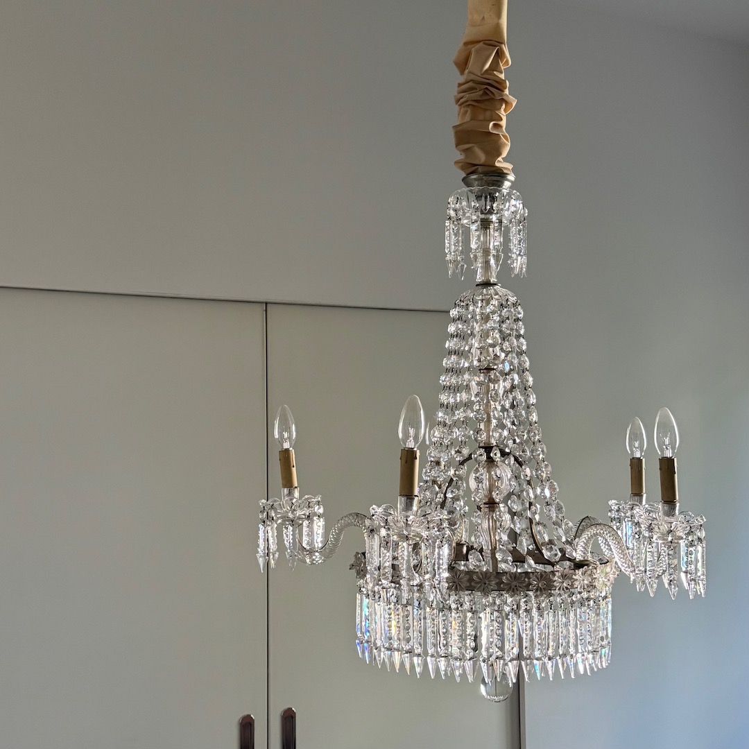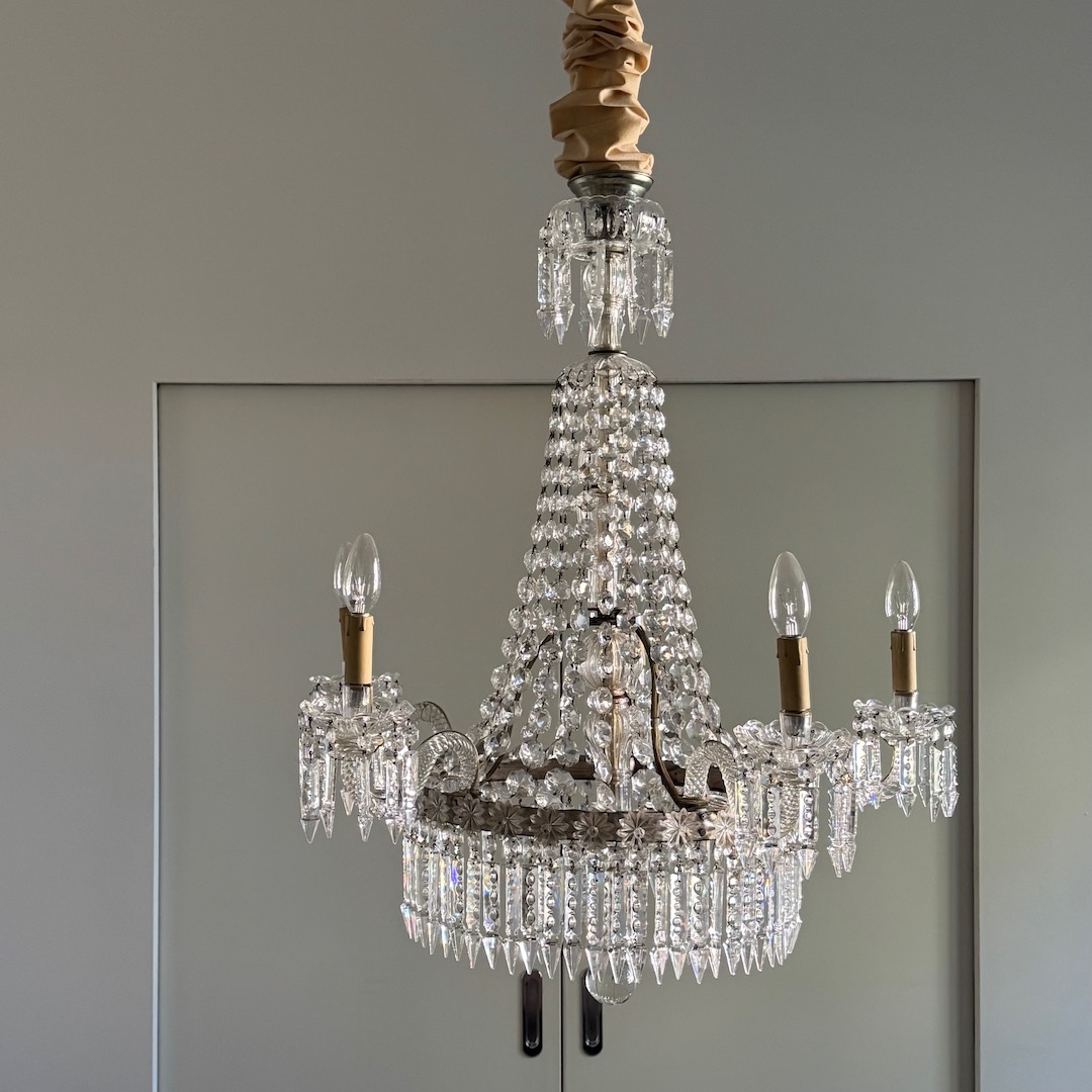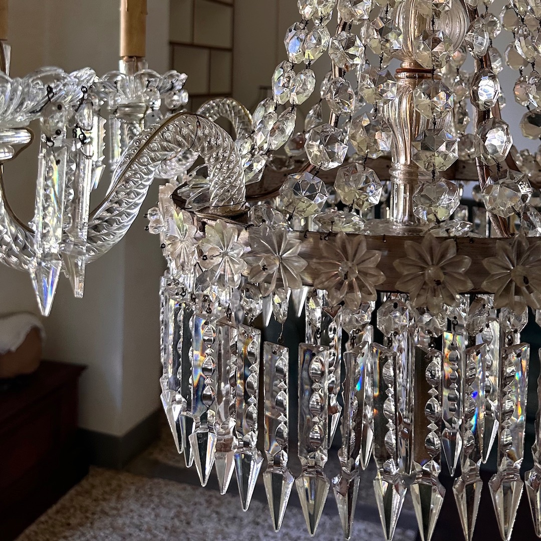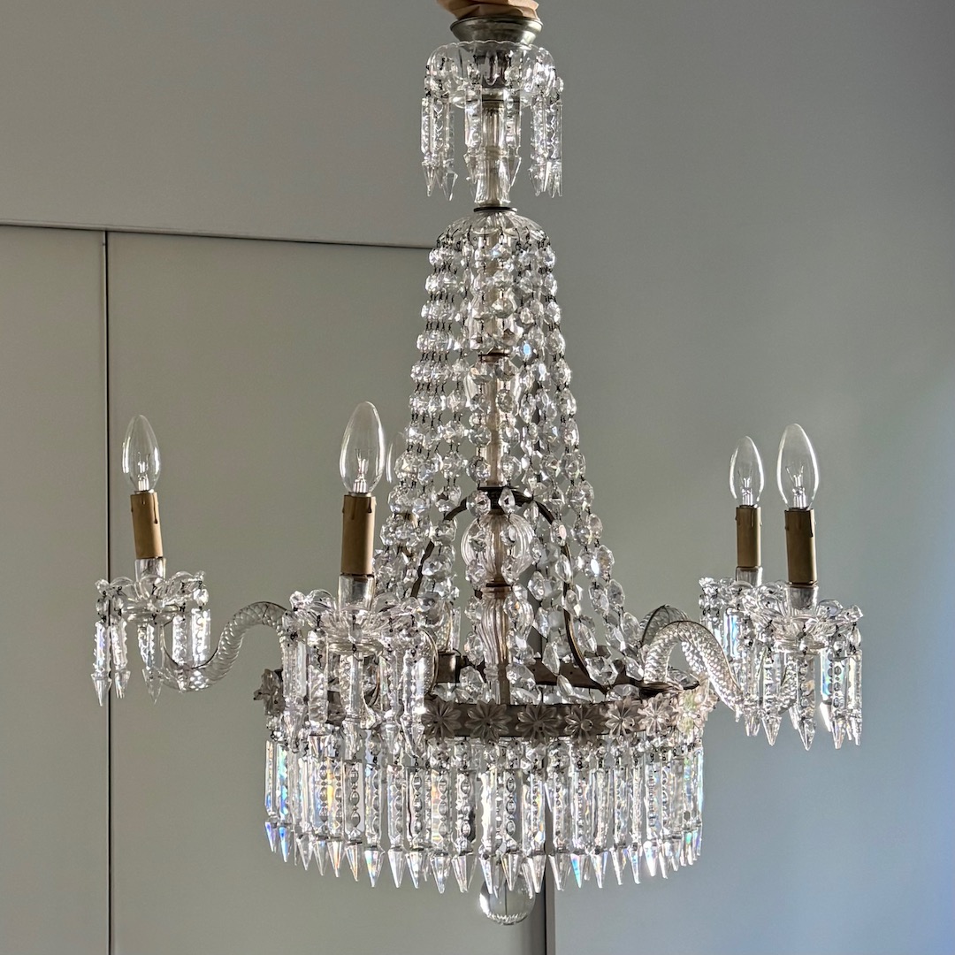Lampadario Baccarat in cristallo molato a corona, cinque luci, pendenti e margherite. Francia inizio sec. XX