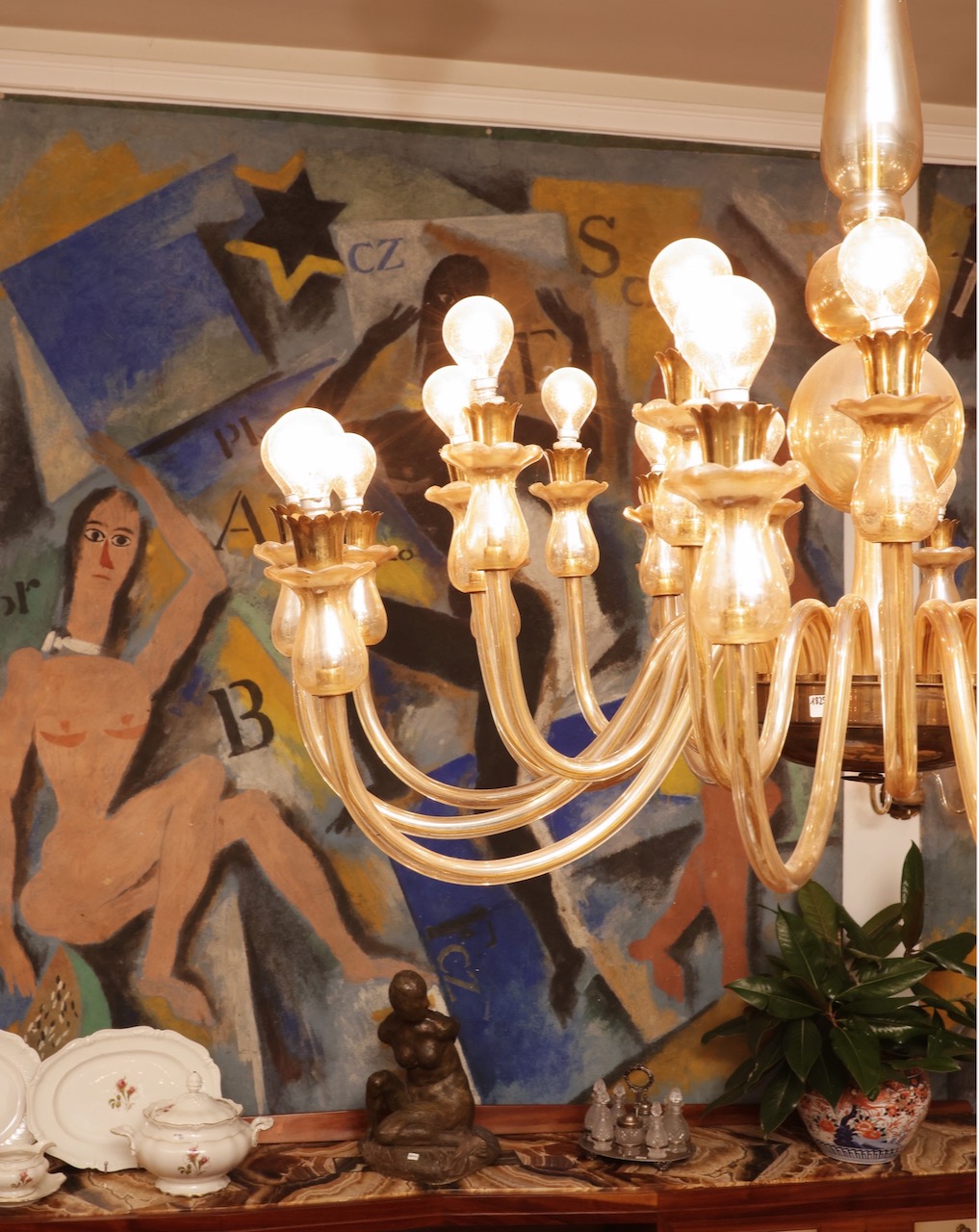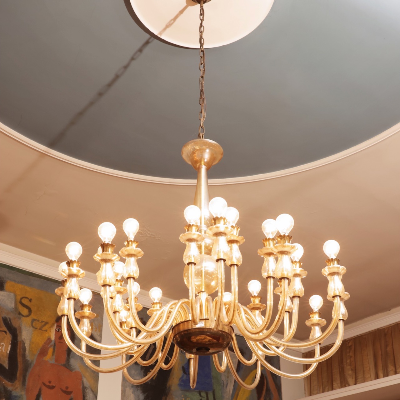 Grande lampadario in vetro soffiato fumé, ventiquattro bracci a doppia voluta e bobeche a tulipano. Italia, 1950 ca