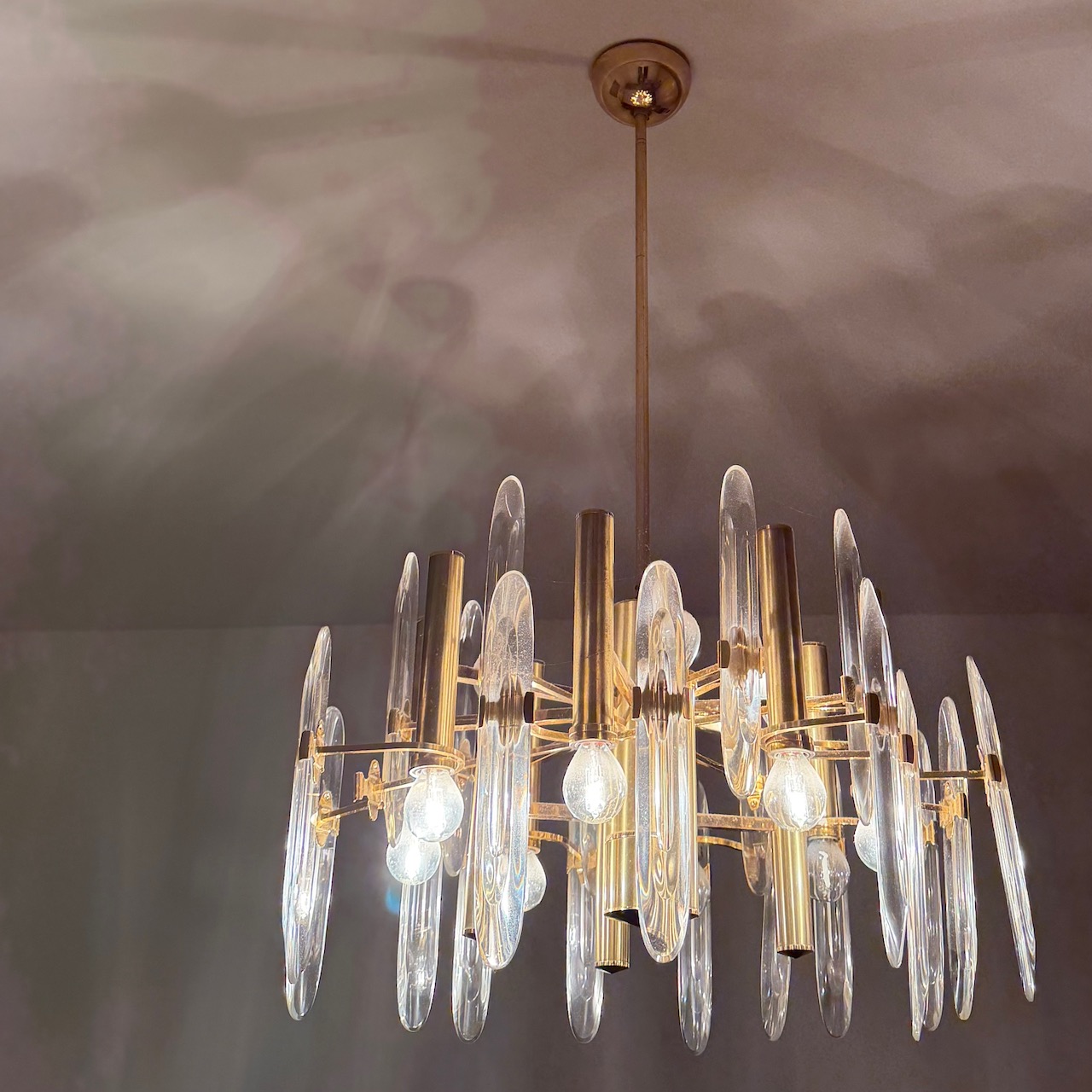 Lampadario Mid-Century in ottone dorato e cristallo, a dodici luci a doppio circuito (otto in basso e quattro in alto), ventiquattro elementi in cristallo led per diffusione luce, Gaetano Sciolari per Stilkronen. Italia, 1970 ca