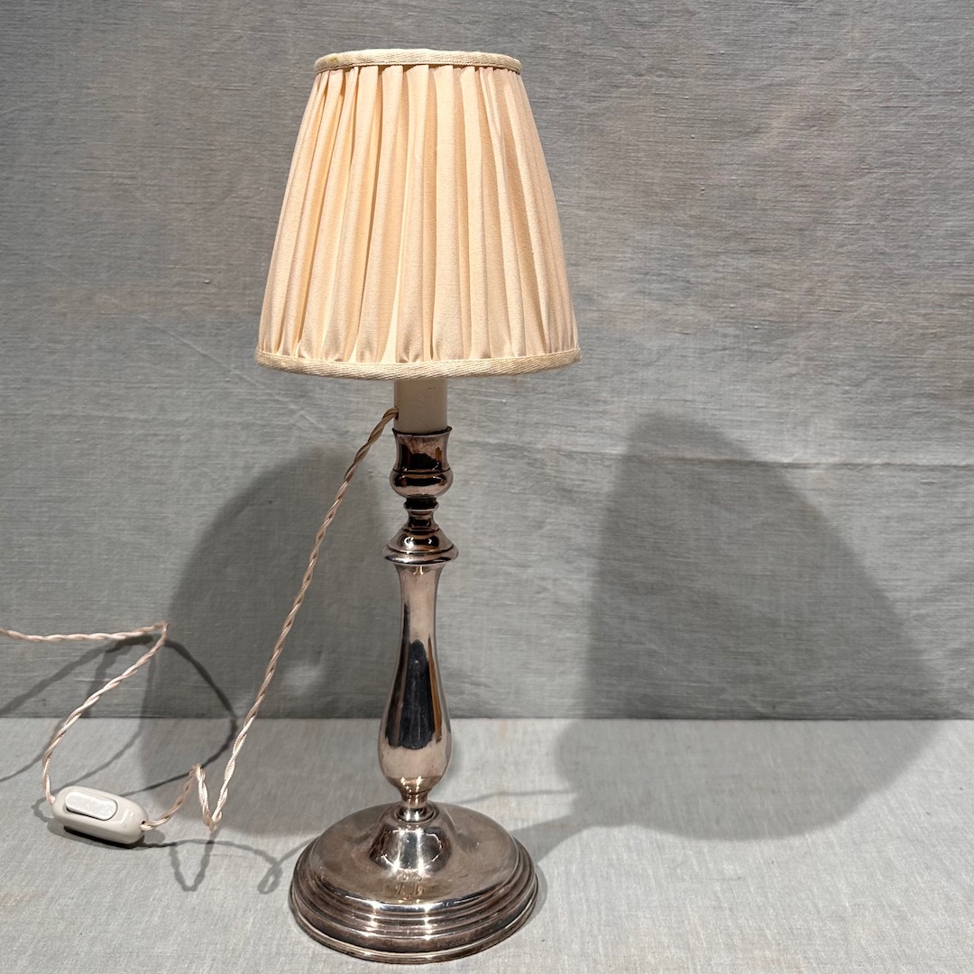 Lampada da tavolo in argento su rame, con stemma nobiliare sulla base . Italia sec. XX