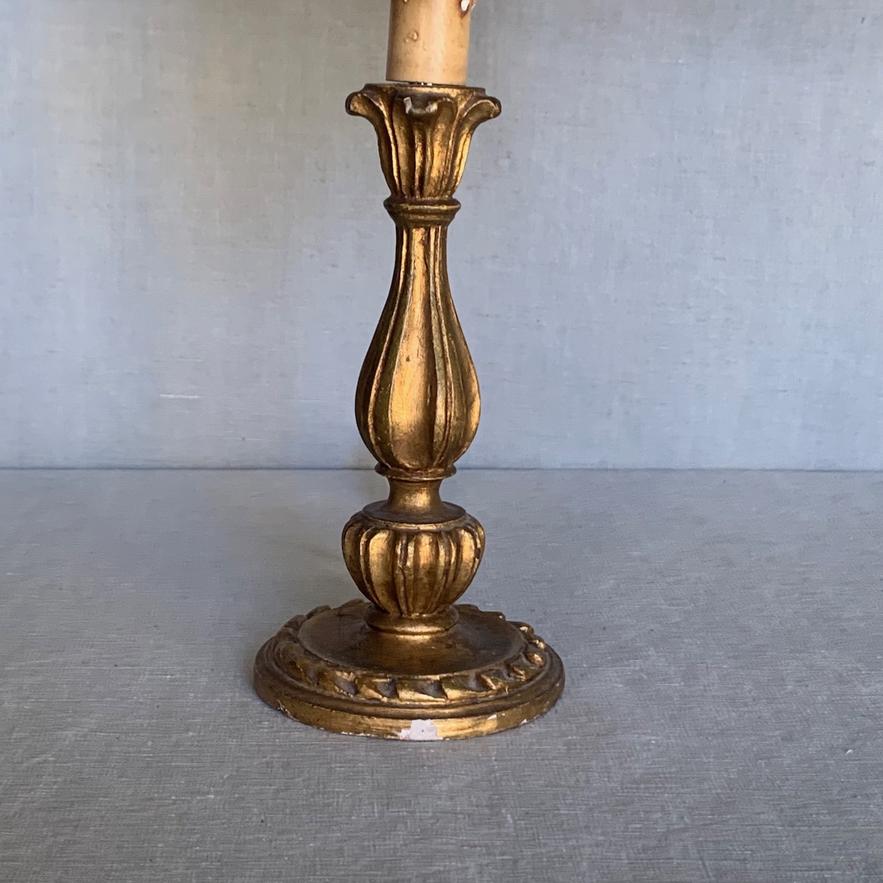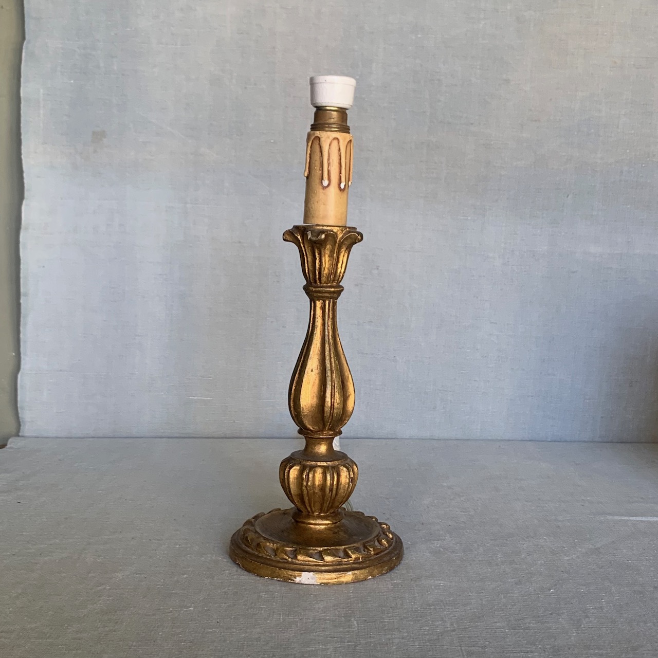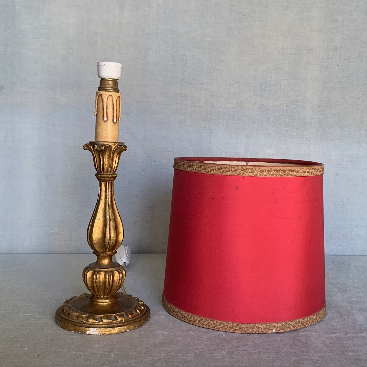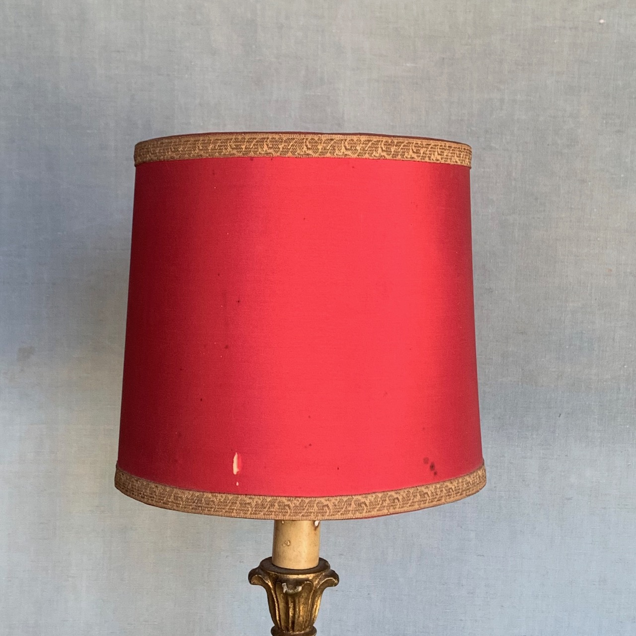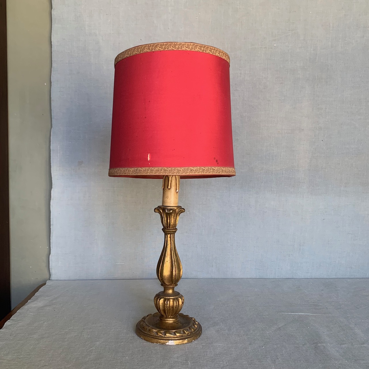 Piccolo lume da comodino in legno intagliato dorato, paralume cilindrico, tela di raso rosso geranio. Italia, sec. XX PARALUME NOLEGGIATO/VENDUTO SEPARATAMENTE