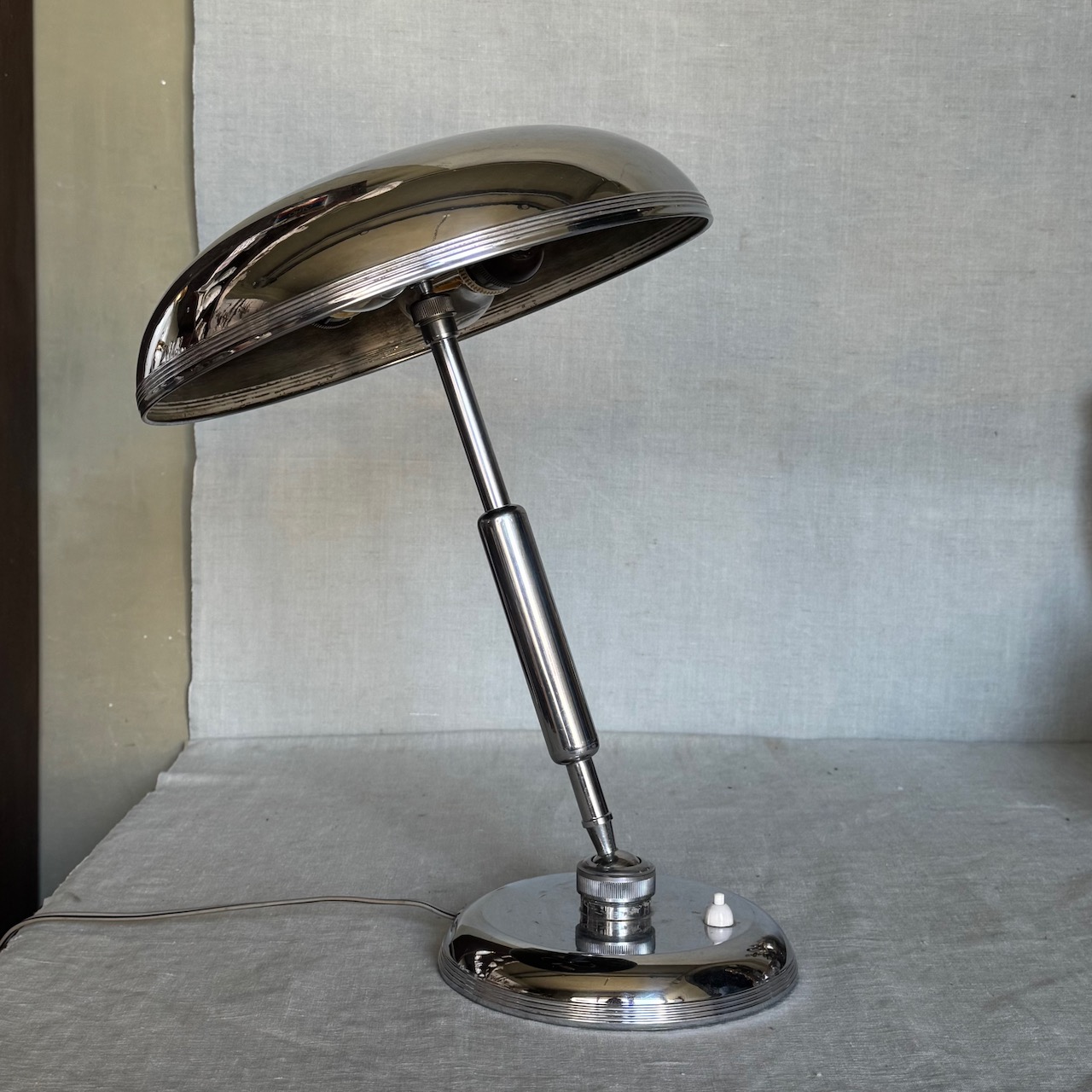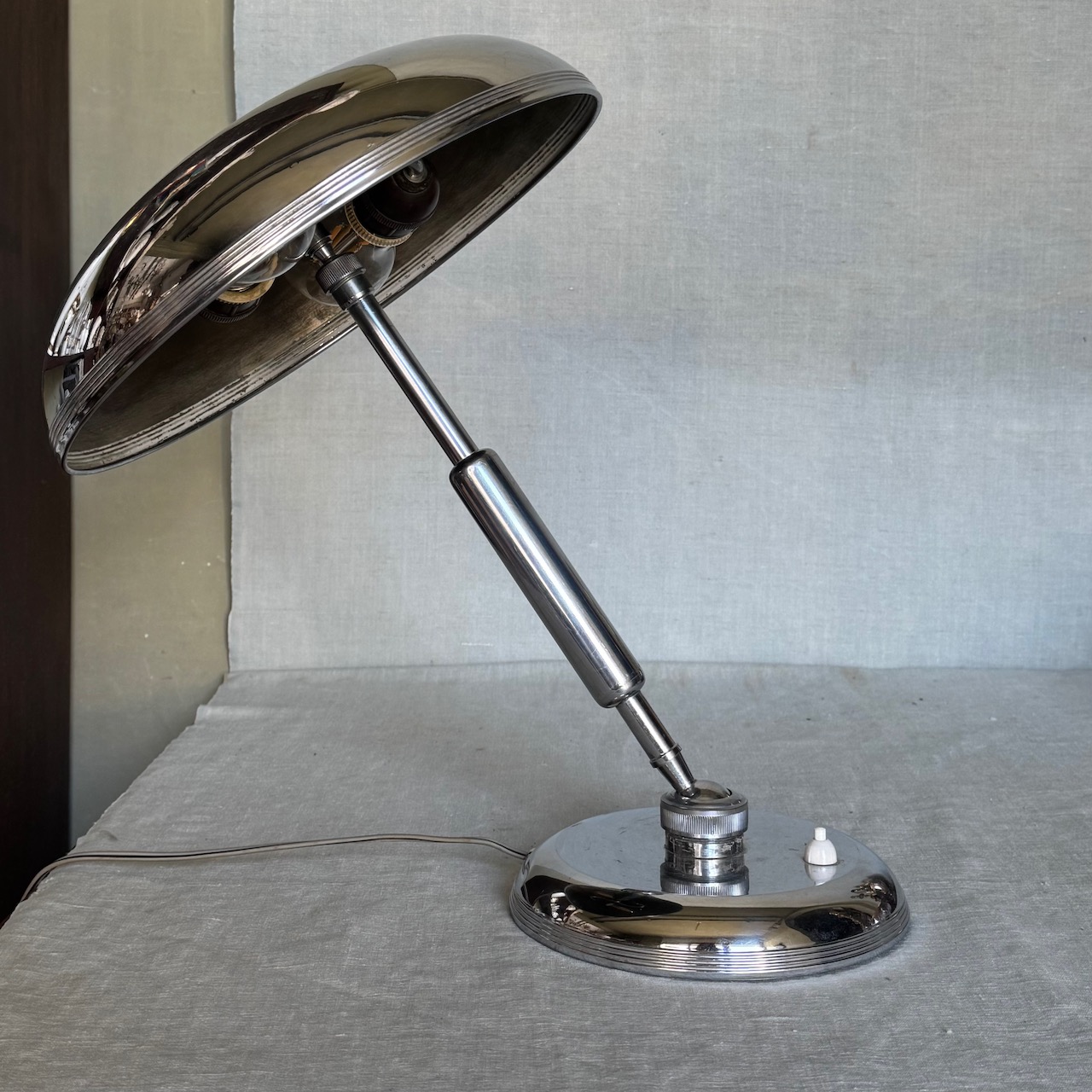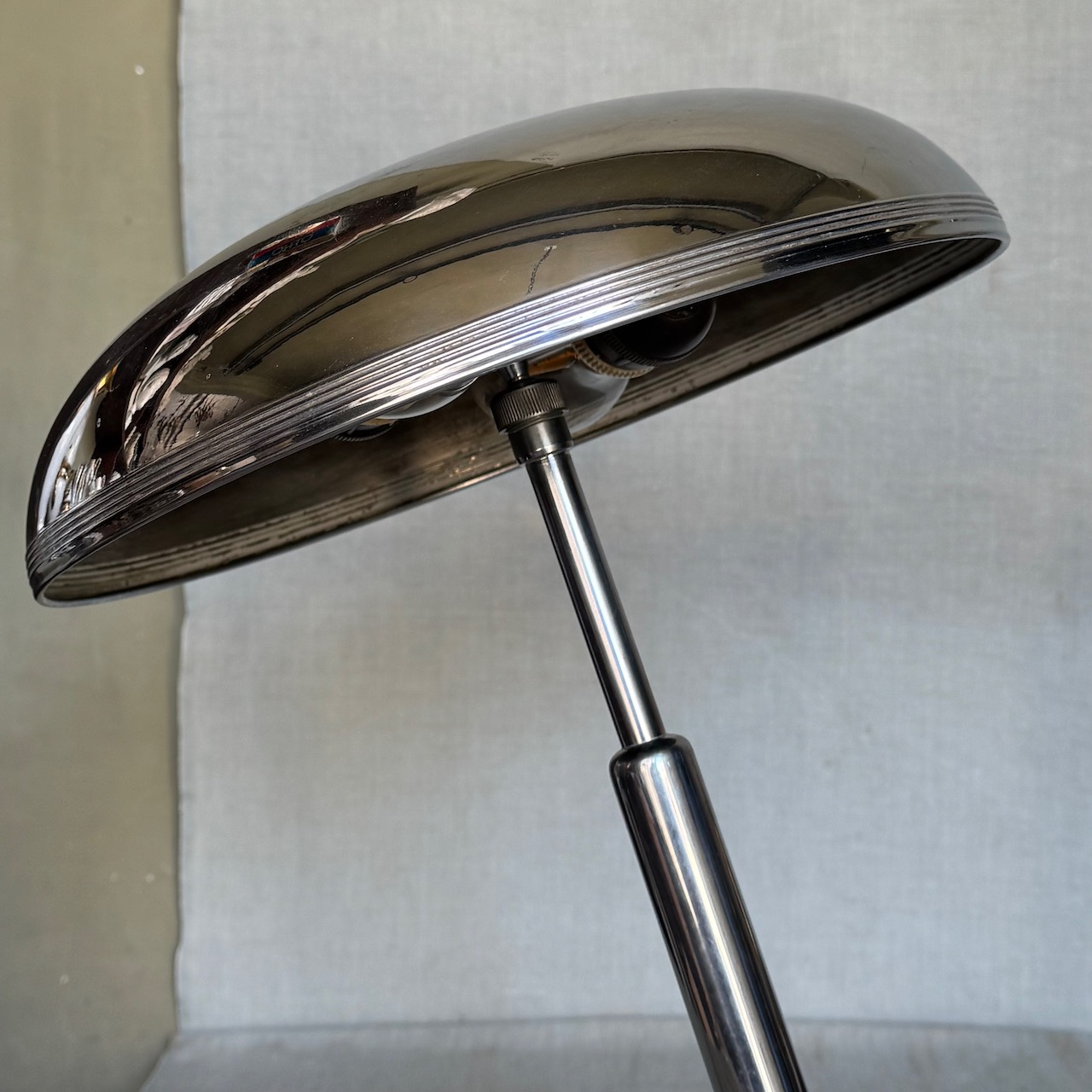 Lampada da tavolo in nickel, braccio regolabile con raccordo a sfera, G. Michelucci. Italia, 1950 ca