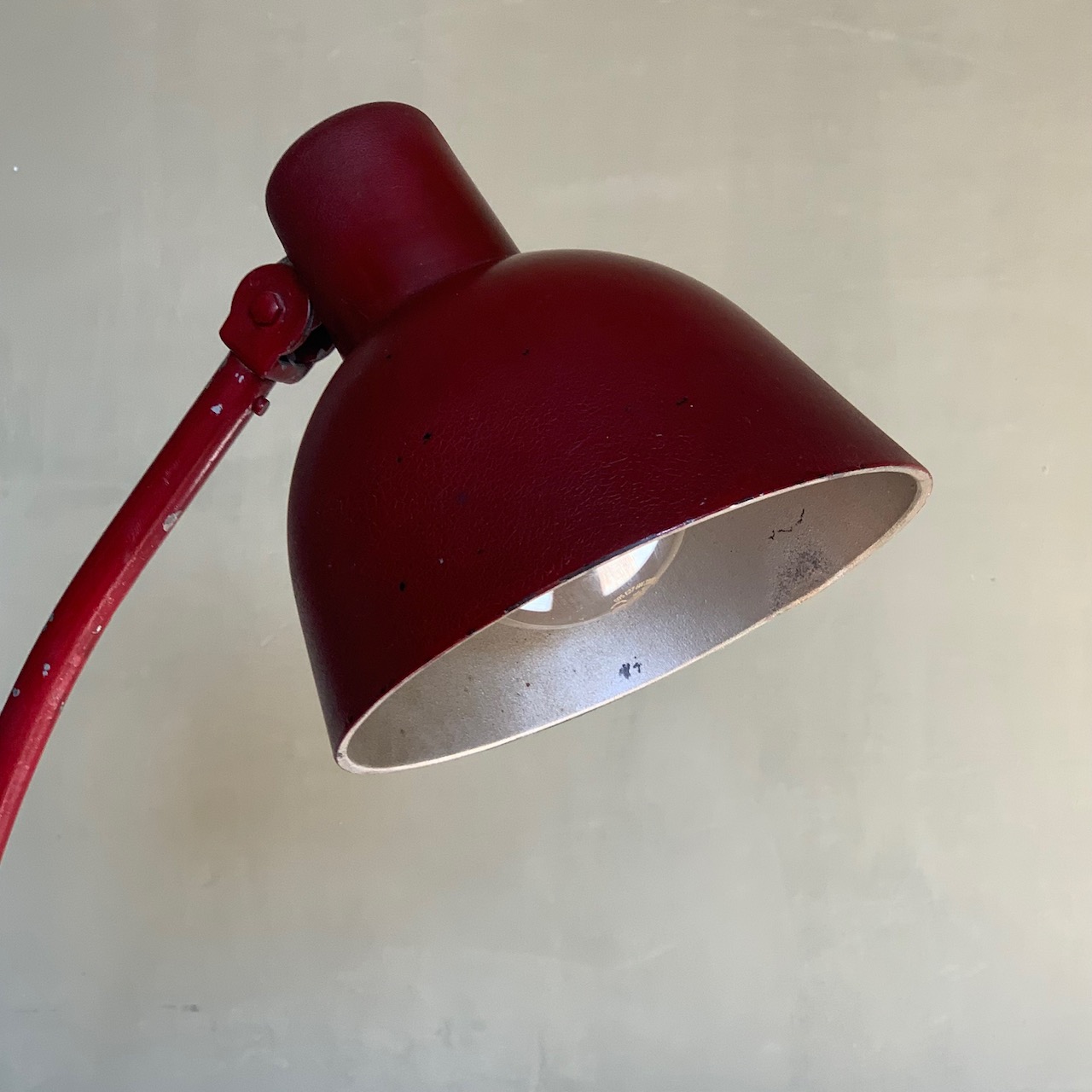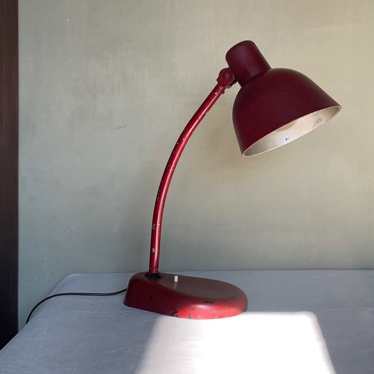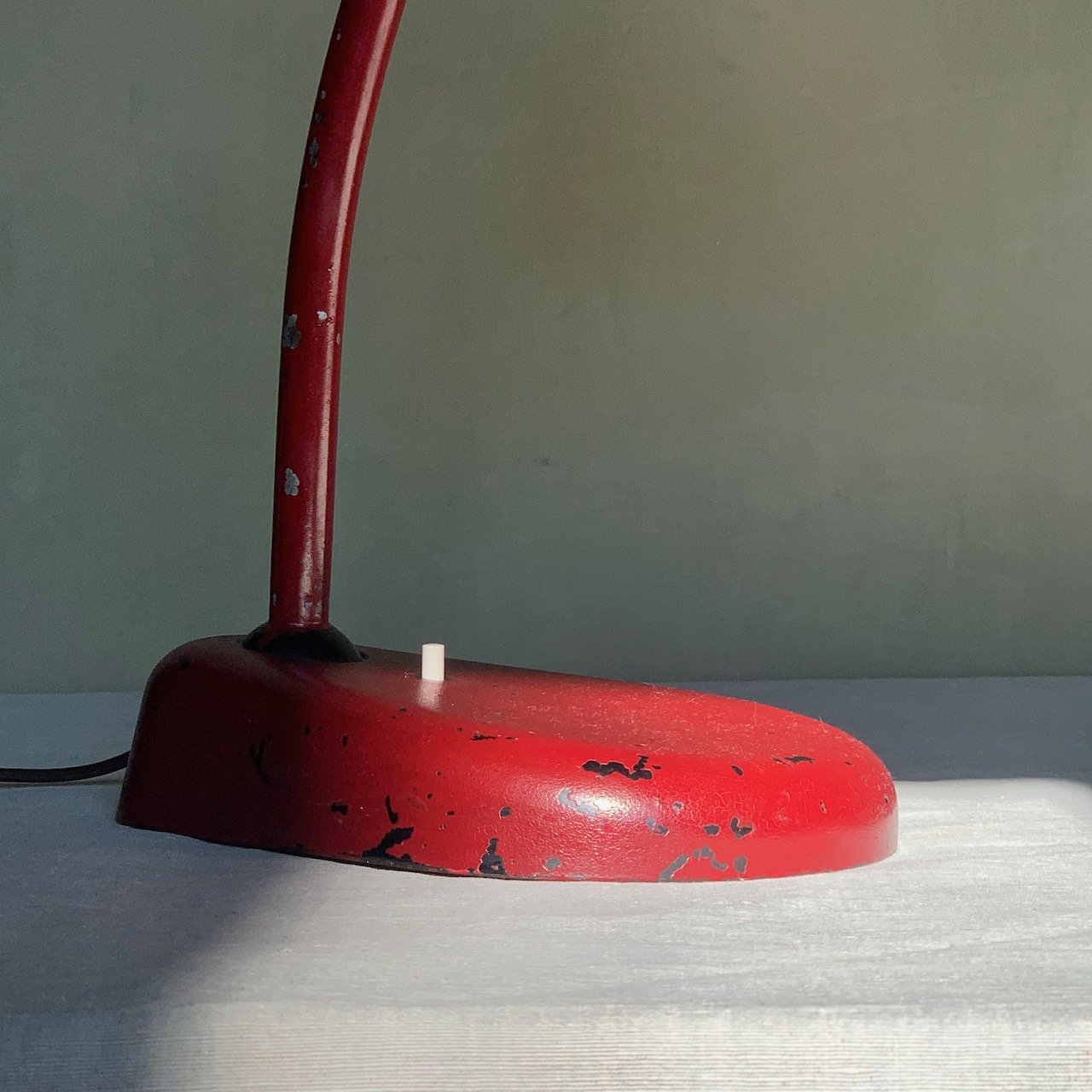 Lampada da tavolo in ferro laccato rosso con accensione a pulsante. Italia, 1940 circa