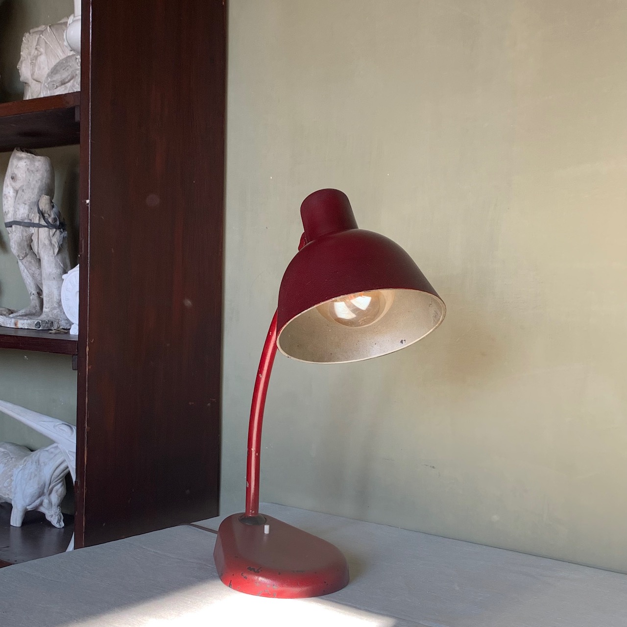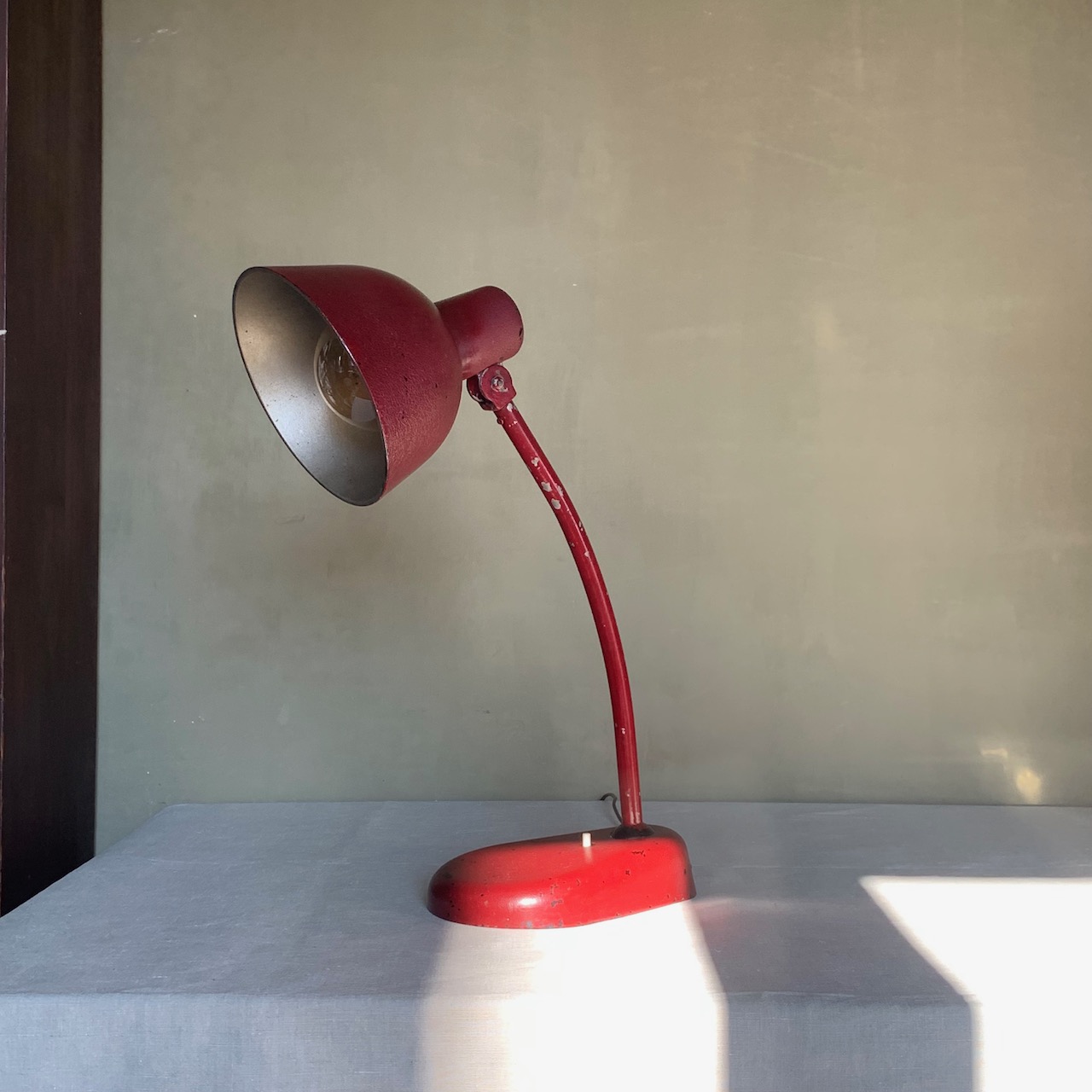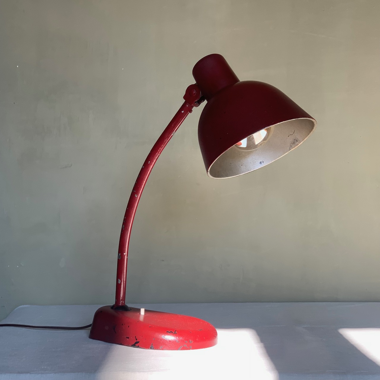 Lampada da tavolo in ferro laccato rosso con accensione a pulsante. Italia, 1940 circa