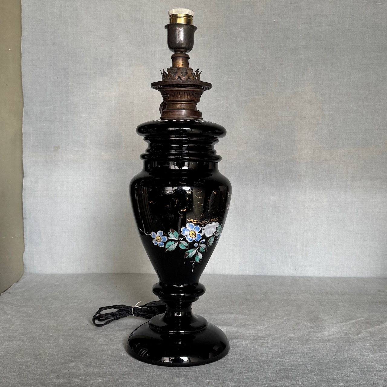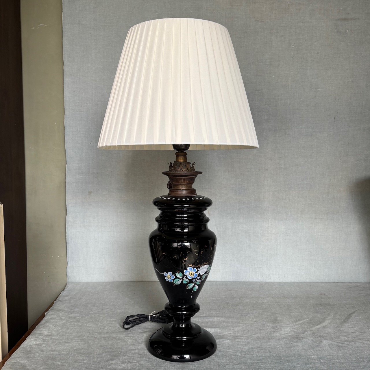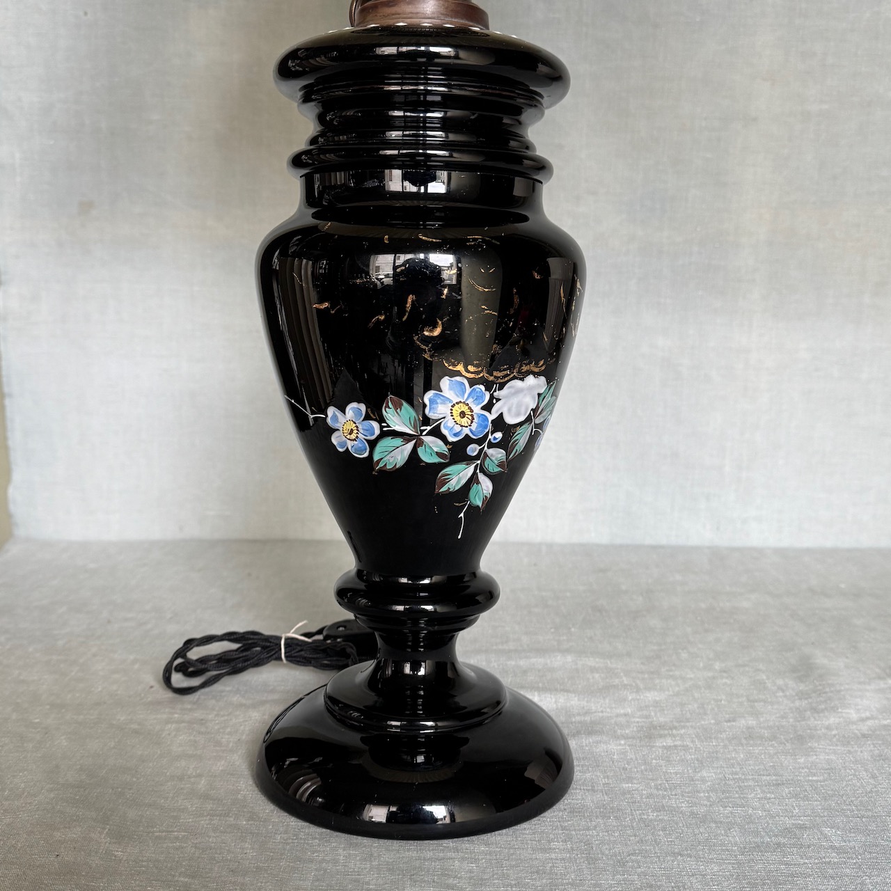 Lampada ad olio in opalina nera e decorazione floreale con lumeggiature oro, paralume in vetro. Italia, sec. XIX