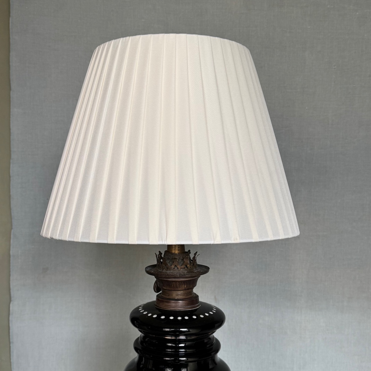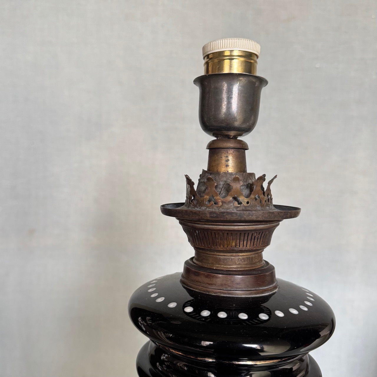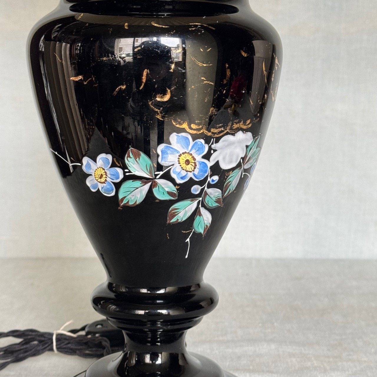 Lampada ad olio in opalina nera e decorazione floreale con lumeggiature oro, paralume in vetro. Italia, sec. XIX