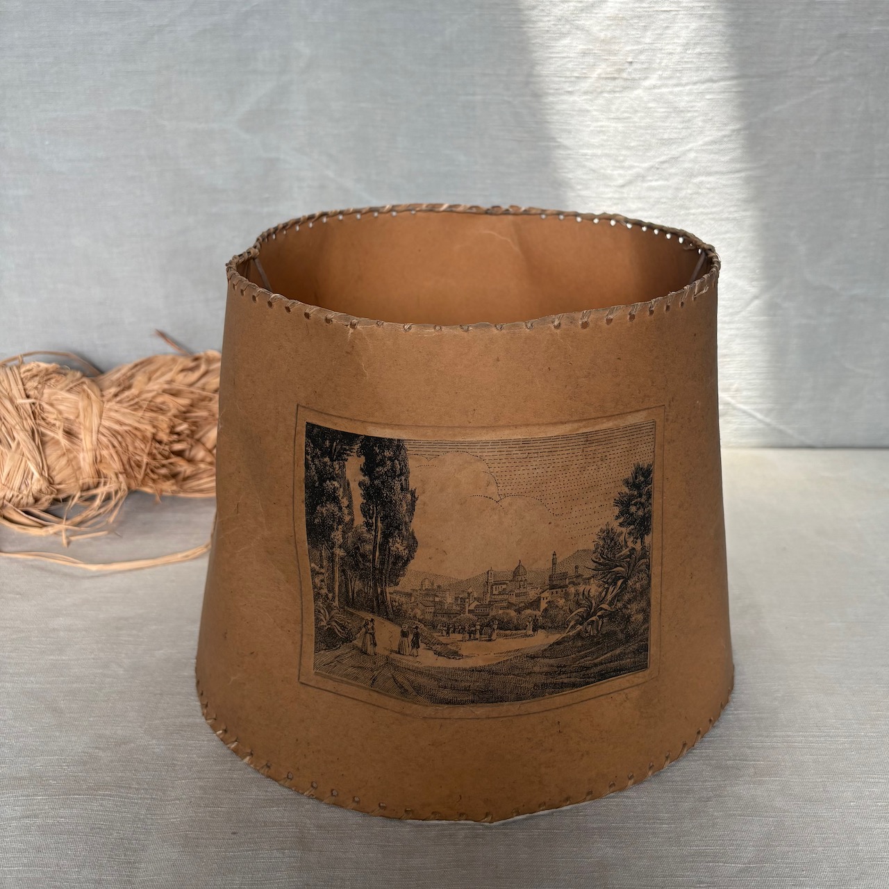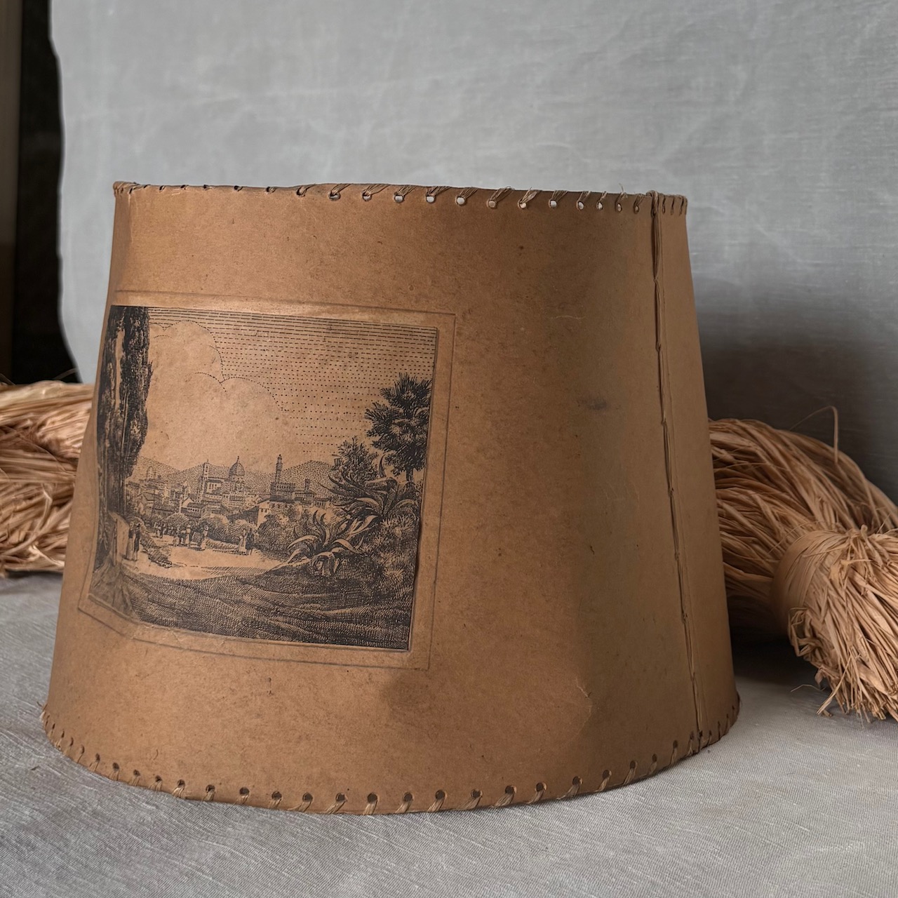 Paralume conico in carta pergamena ocra, decoro paesaggio calcografico, veduta di Firenze. Italia, inizio sec. XX