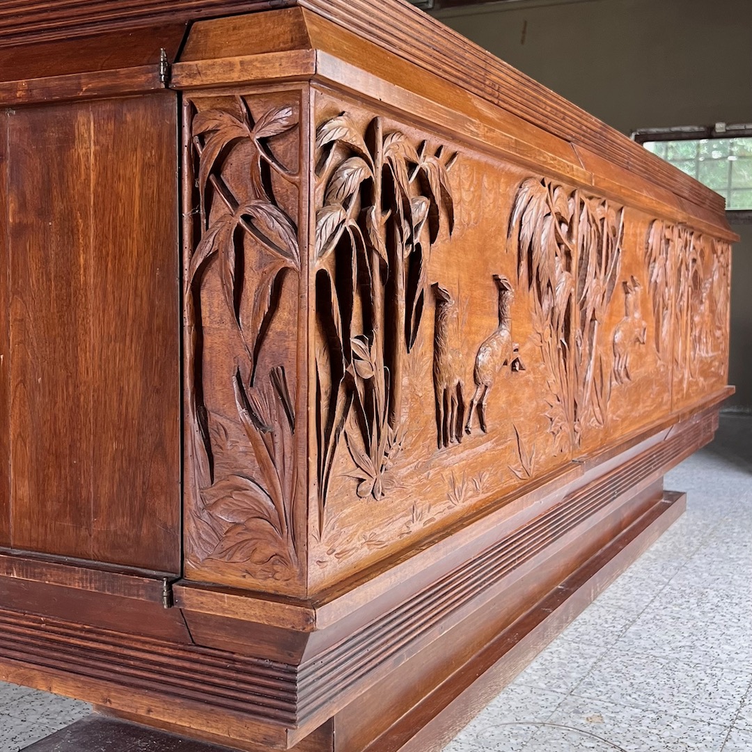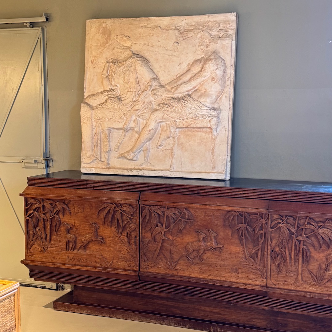 Grande Banco Credenza Sideboard in noce scolpito, piano in marmo verde serpentino, due sportelli a battente e centrale a scorrimento decorati con bassorilievi esotici. Italia, 1940 Circa NONDISPONIBILE