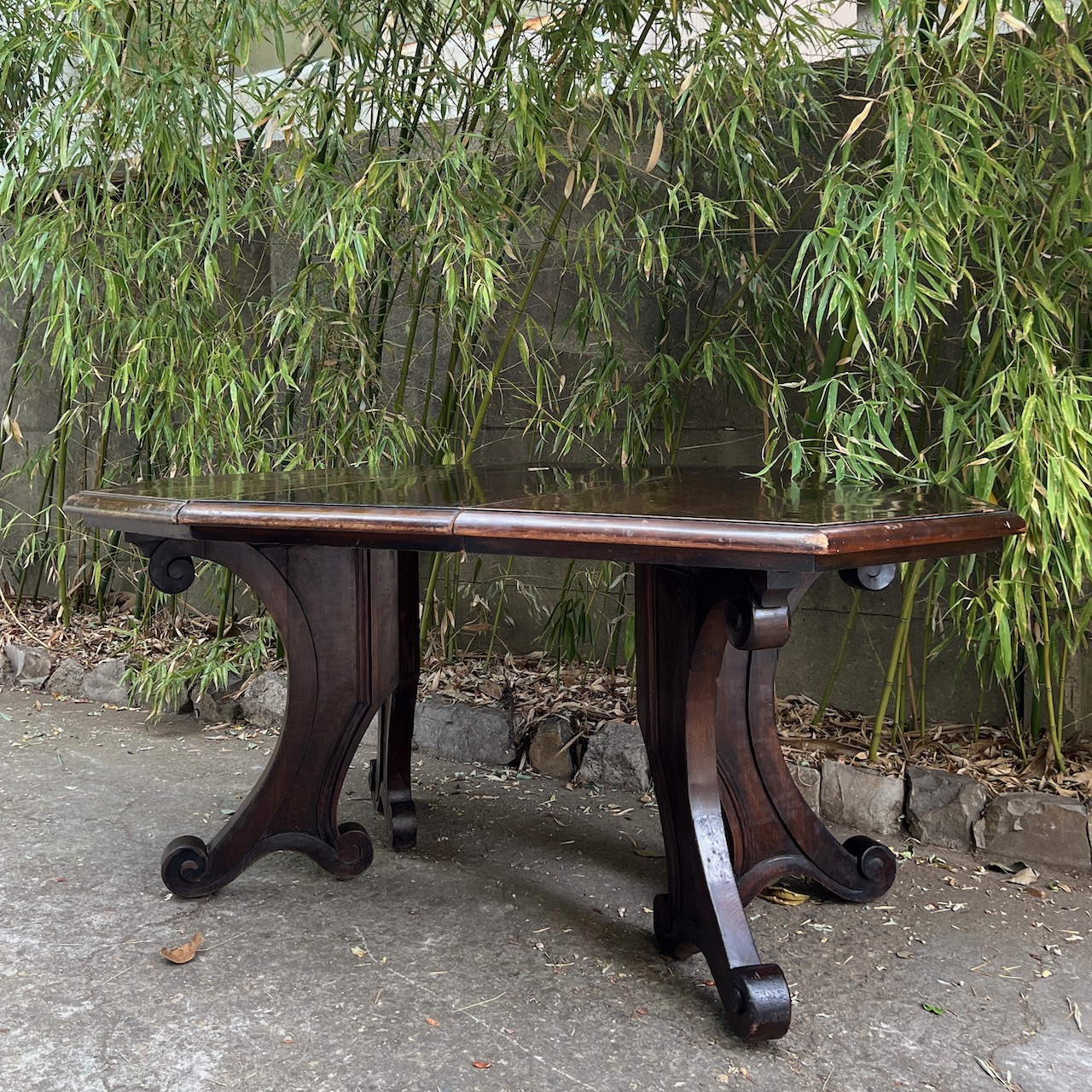 Tavolo ottagonale in noce a patina bruna, prolunga, sostegni a voluta. Italia, inizio sec. XX