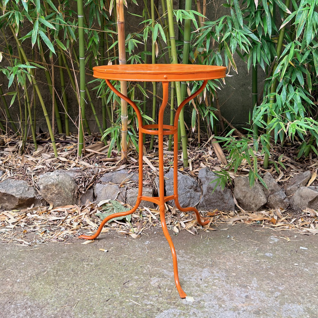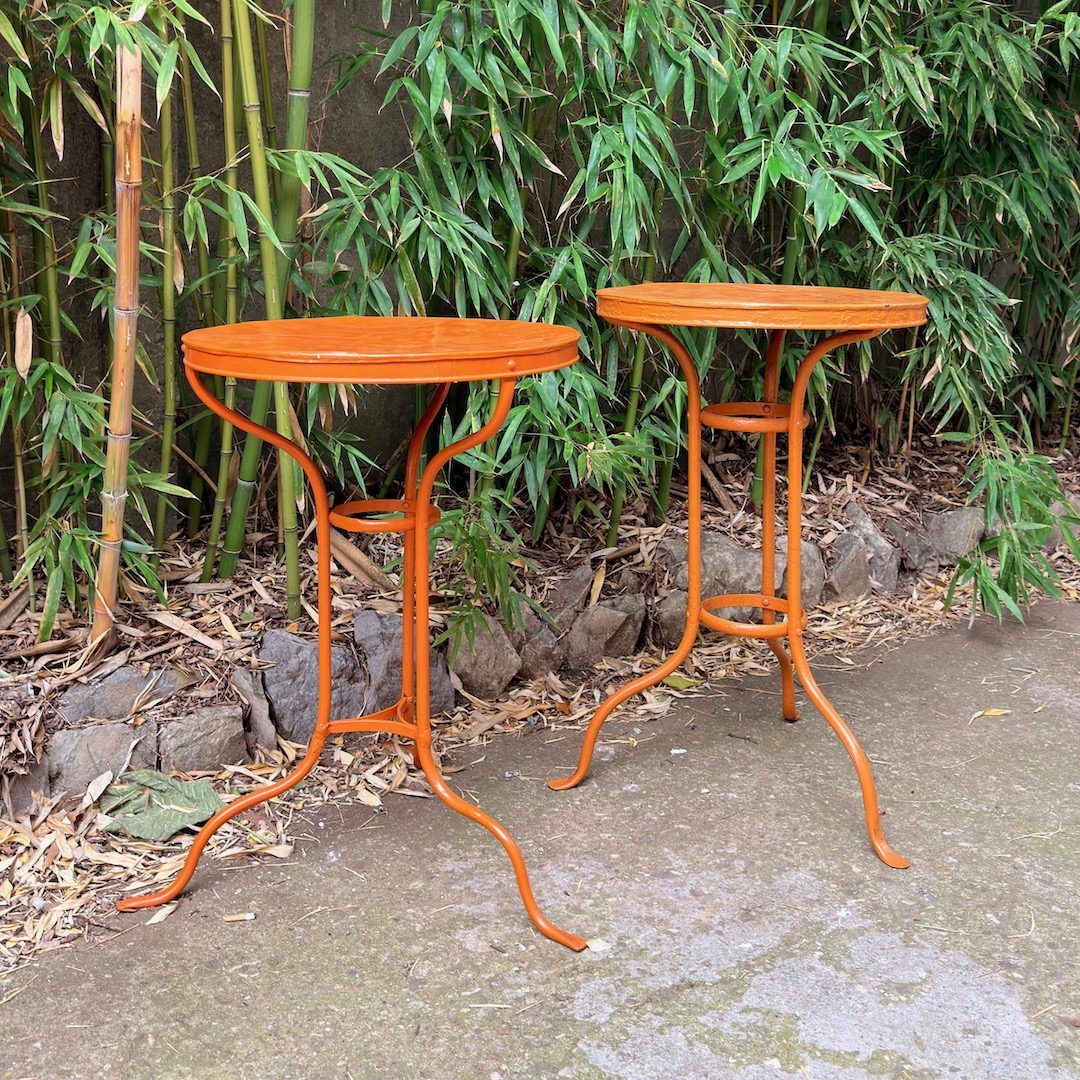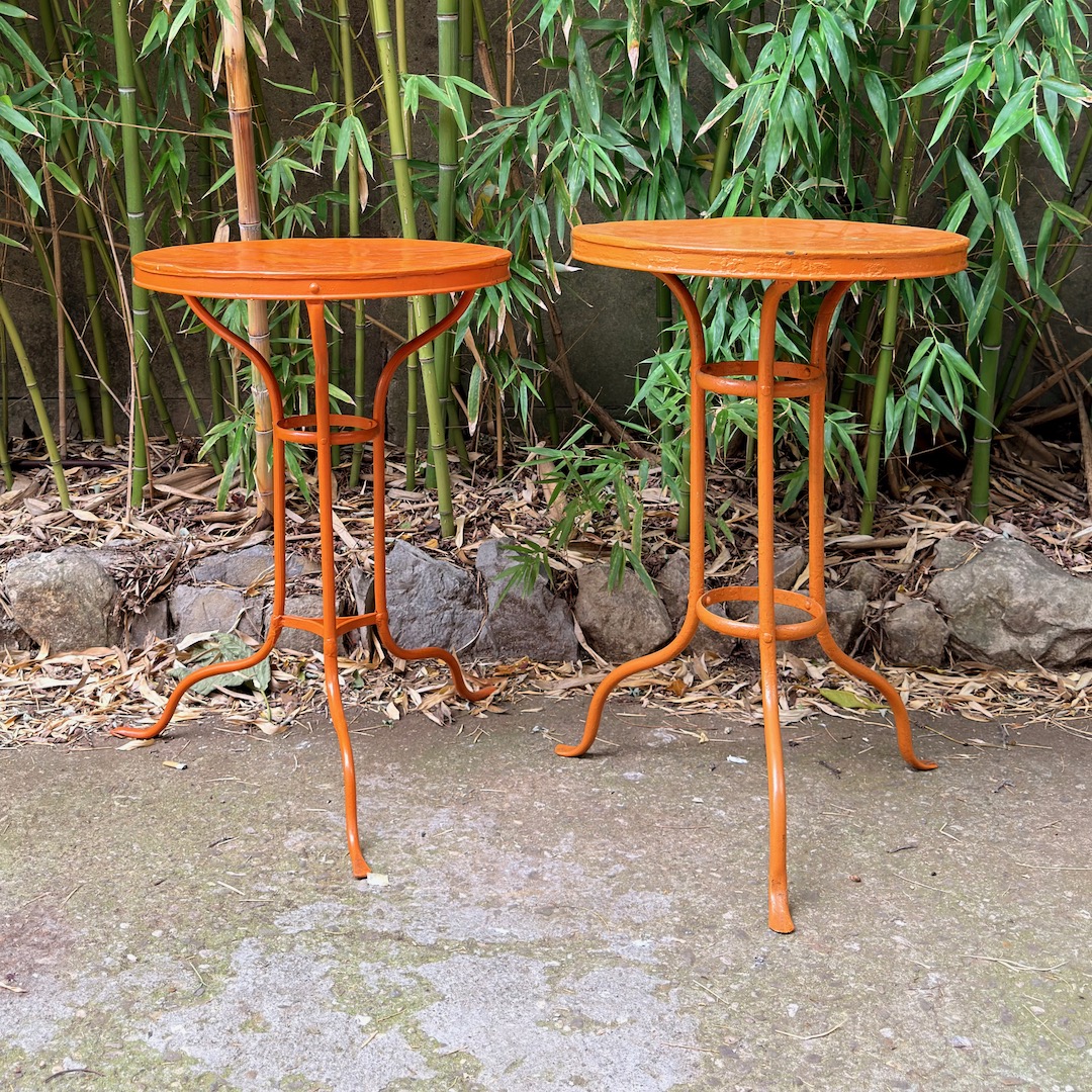 Coppia di Tavoli bistrot da giardino in ferro laccato arancio. Italia, sec. XX