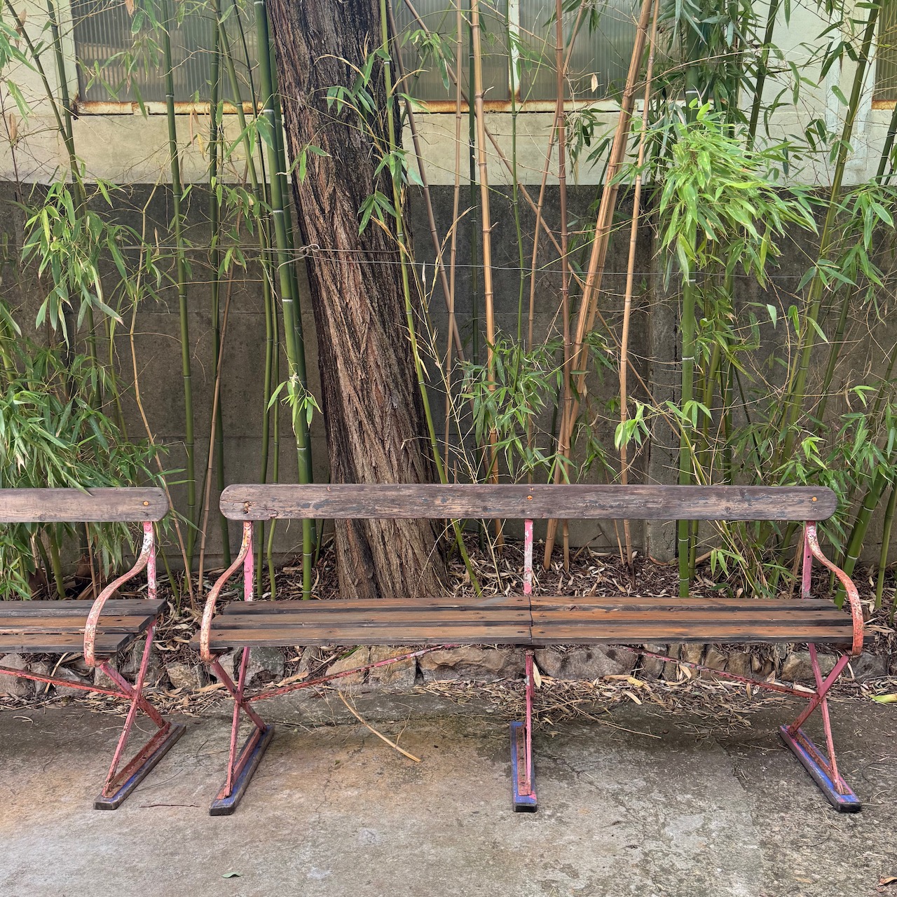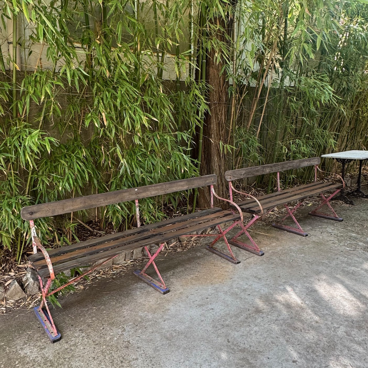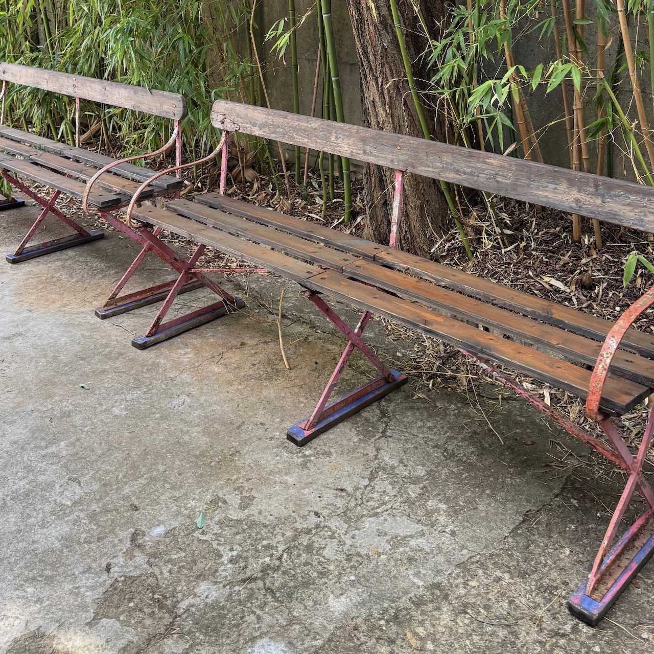 Coppia di panchine a stecche in ferro e legno dipinto rosa. Toscana, fine sec. XIX