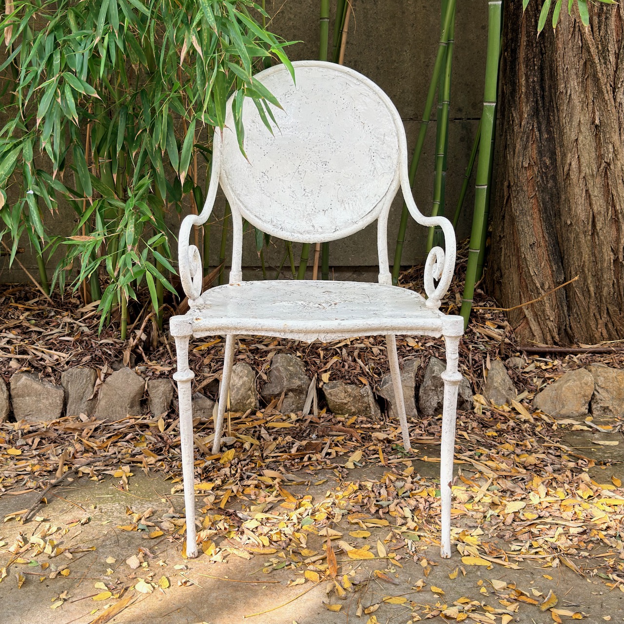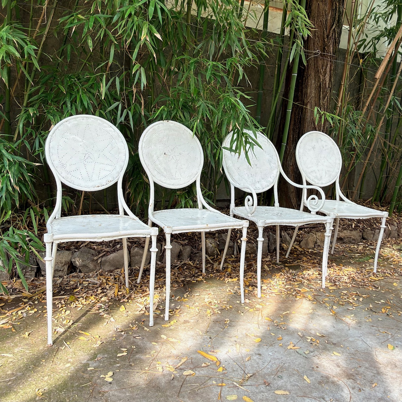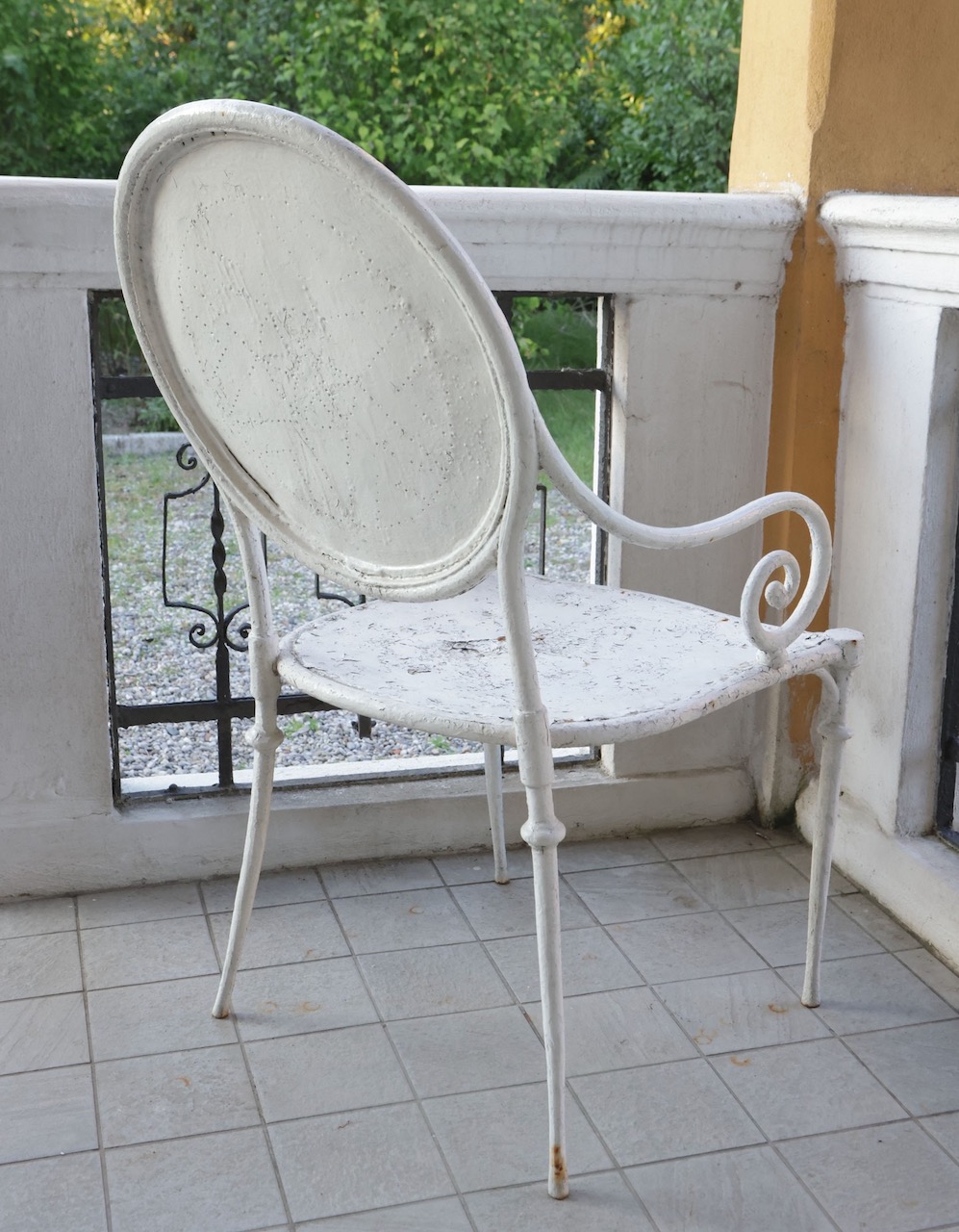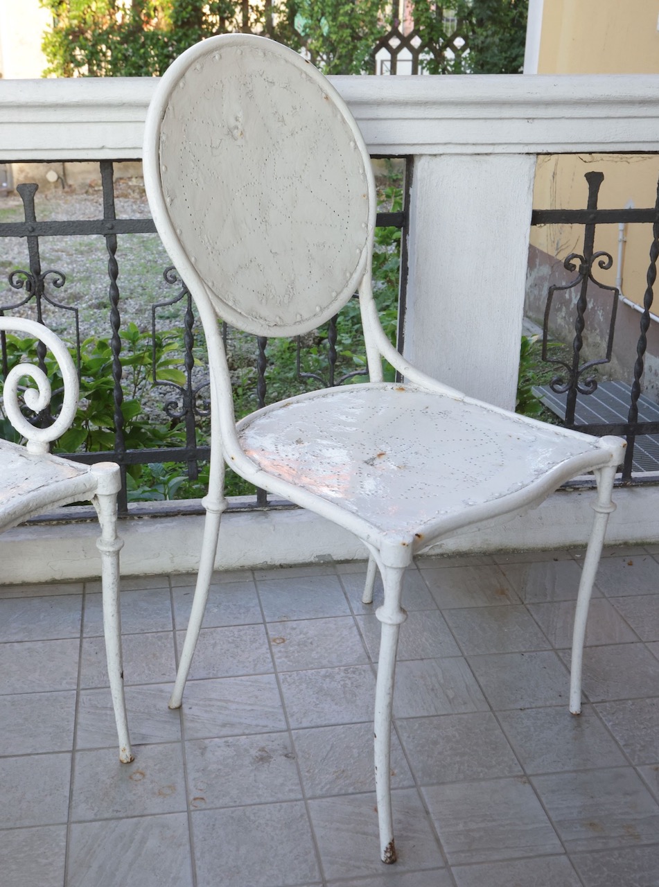 Salottino da giardino in ferro battuto laccato bianco, composto da tre sedie e una poltrona. Italia, sec. XX
