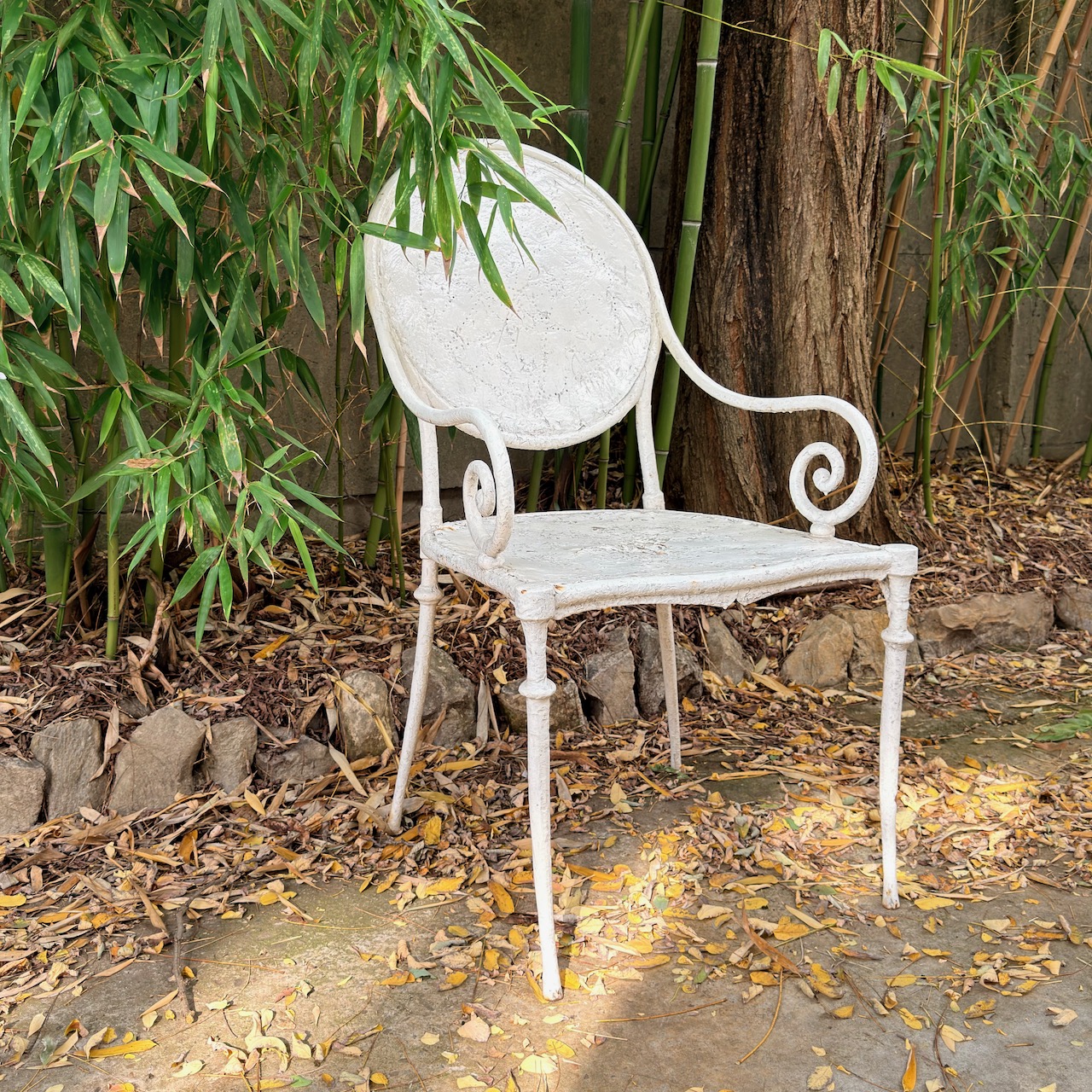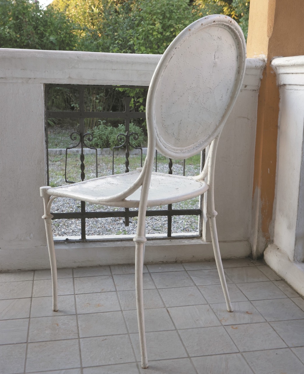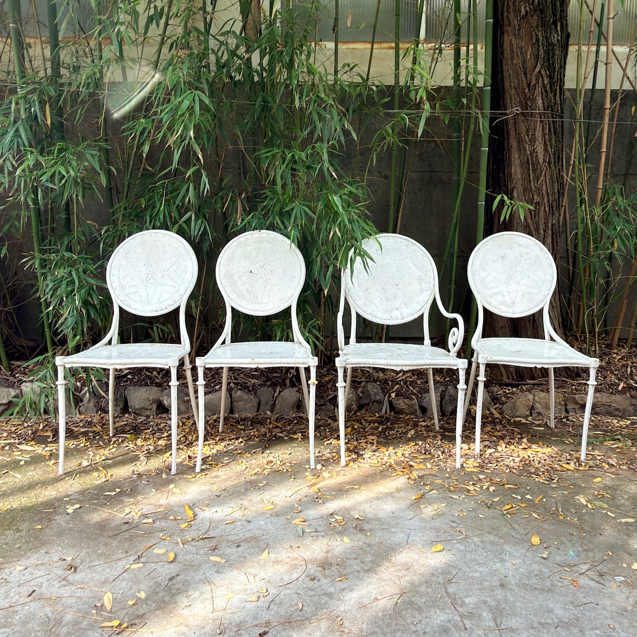 Salottino da giardino in ferro battuto laccato bianco, composto da tre sedie e una poltrona. Italia, sec. XX