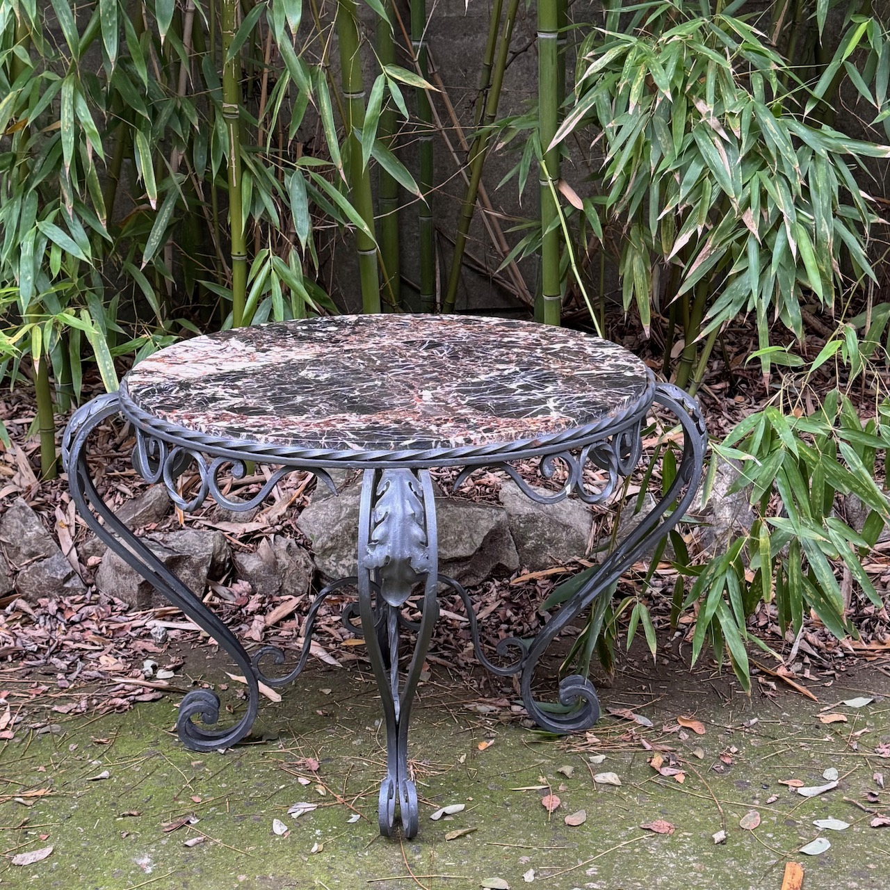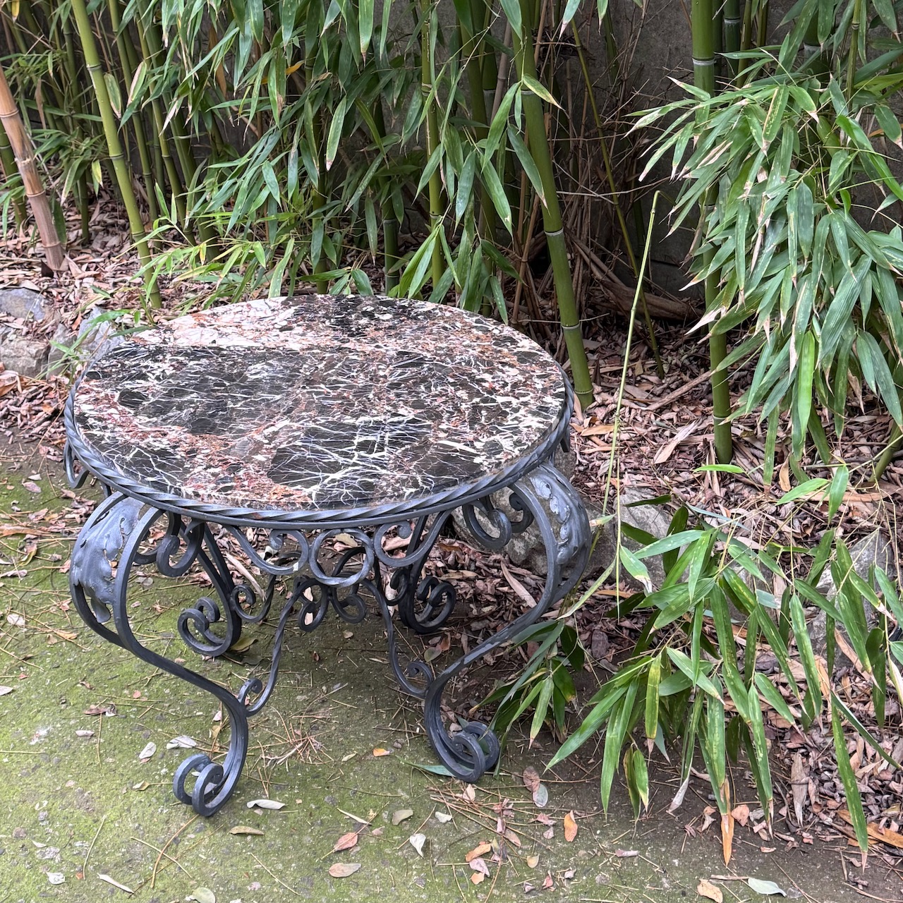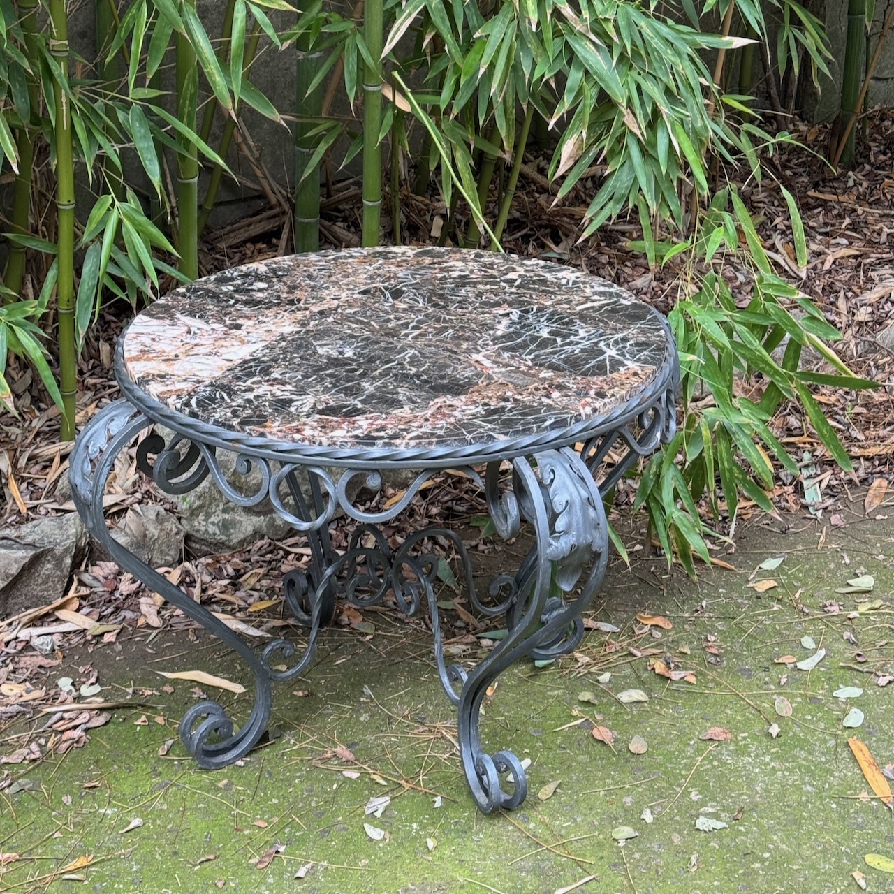 Tavolo da giardino in ferro con piano in marmo, gambe mosse con decori vegetali. Italia, sec. XX