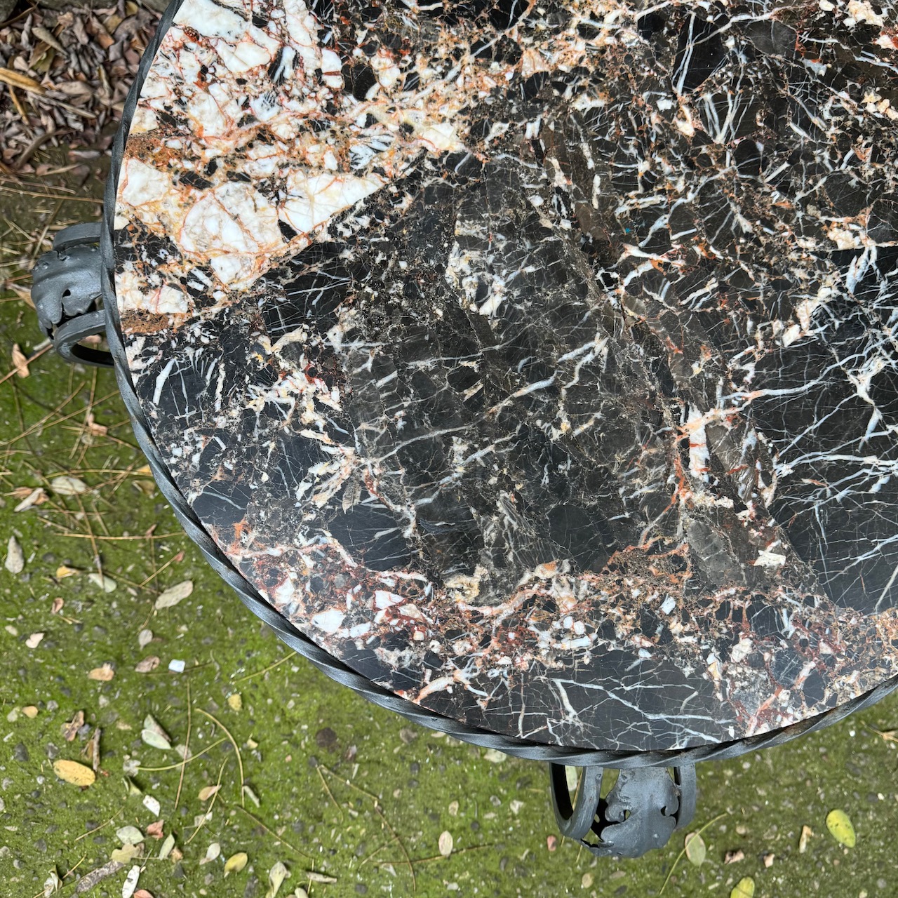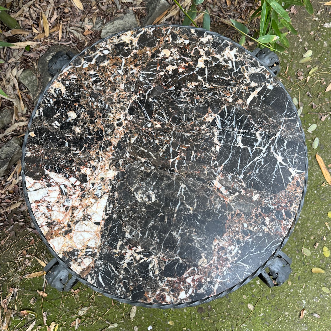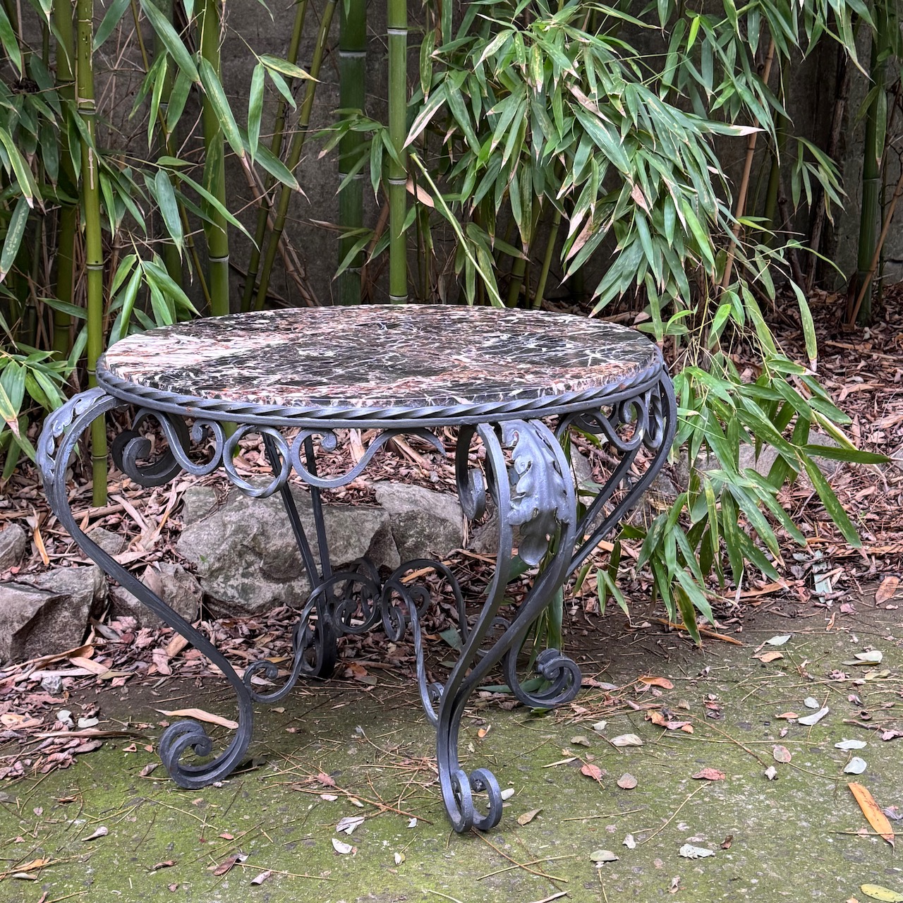 Tavolo da giardino in ferro con piano in marmo, gambe mosse con decori vegetali. Italia, sec. XX