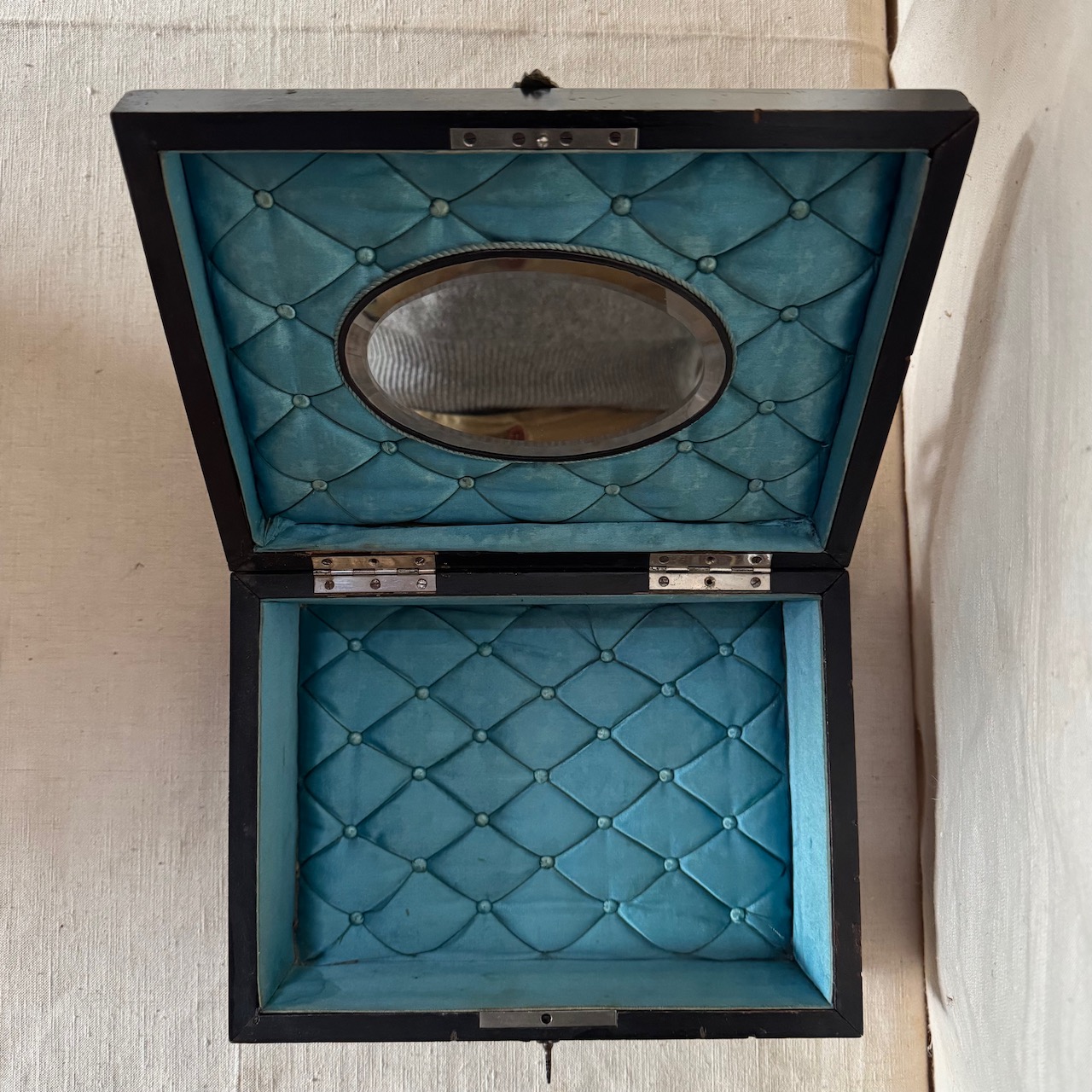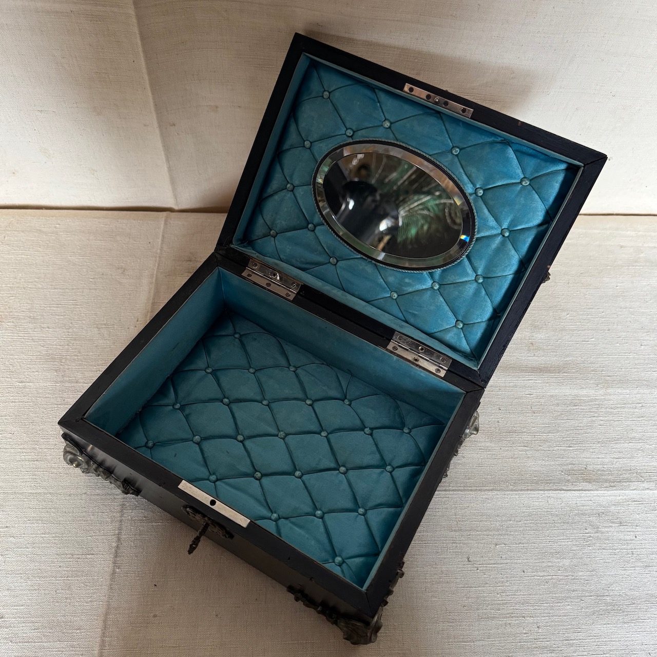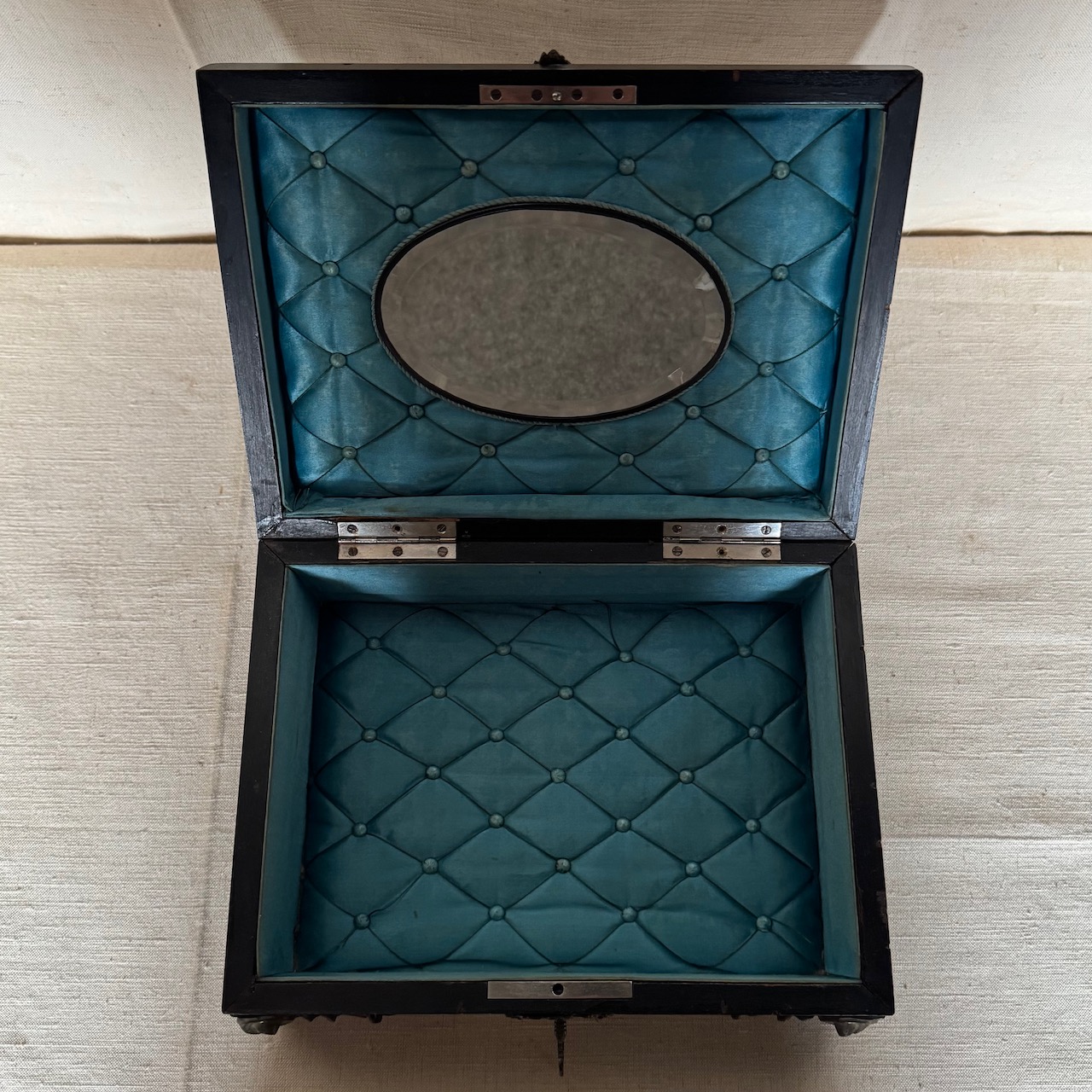 Scatola portagioie Vittoriana, legno laccato nero, finiture e piedini in bronzo, interno matellassé turchese. Inghilterra, sec. XIX
