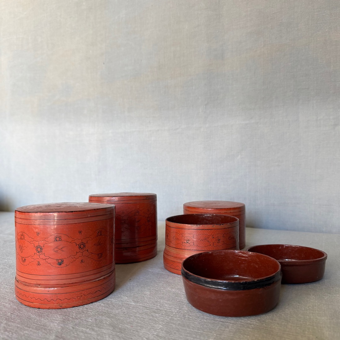 Tre antiche scatole di Betel rotonde in di bambù laccata arancione e nera, con vassoio interno. Birmania, 1910 circa