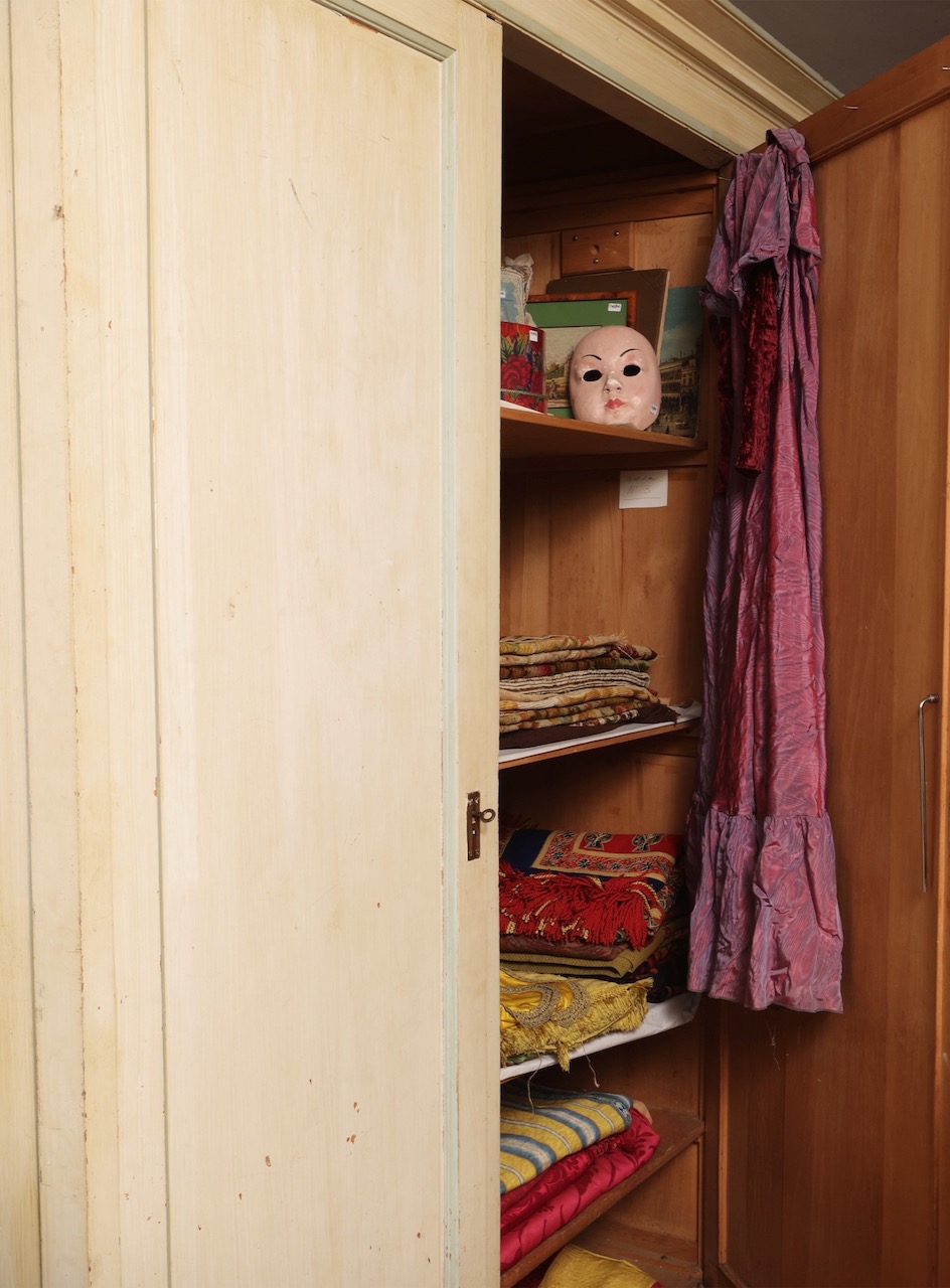 Armadio in gattice laccato bianco, cappello aggettante, tre sportelli con dettagli laccati verde acqua, base a cornice. Italia, sec. XX