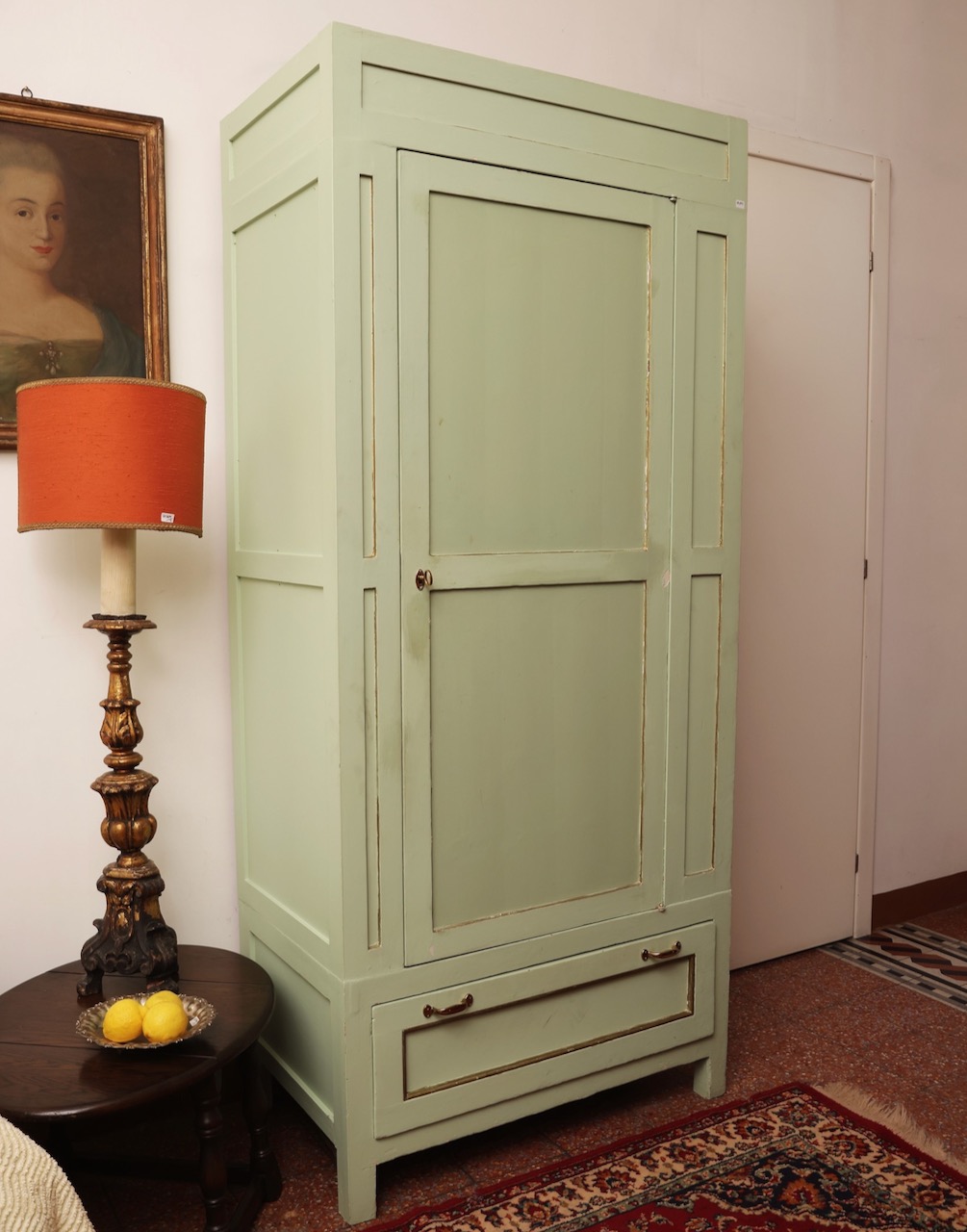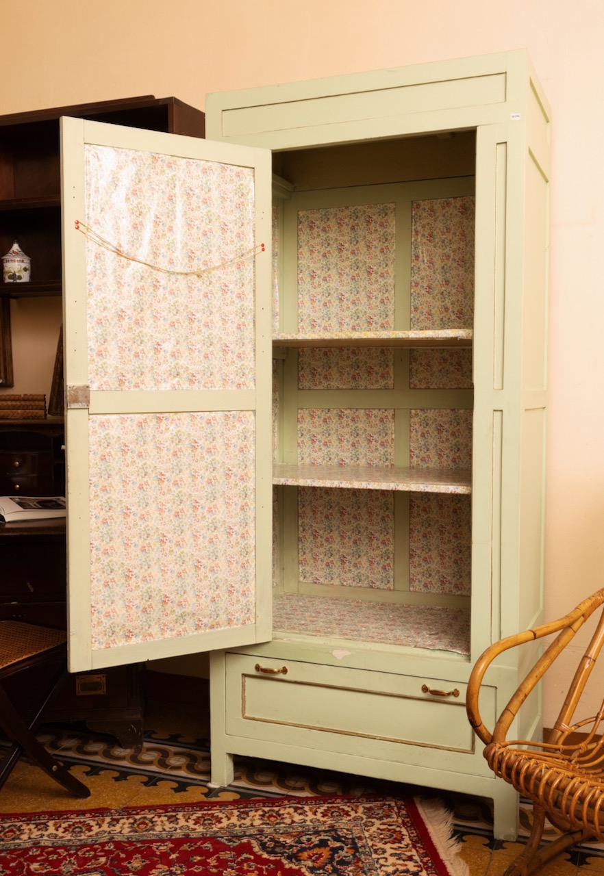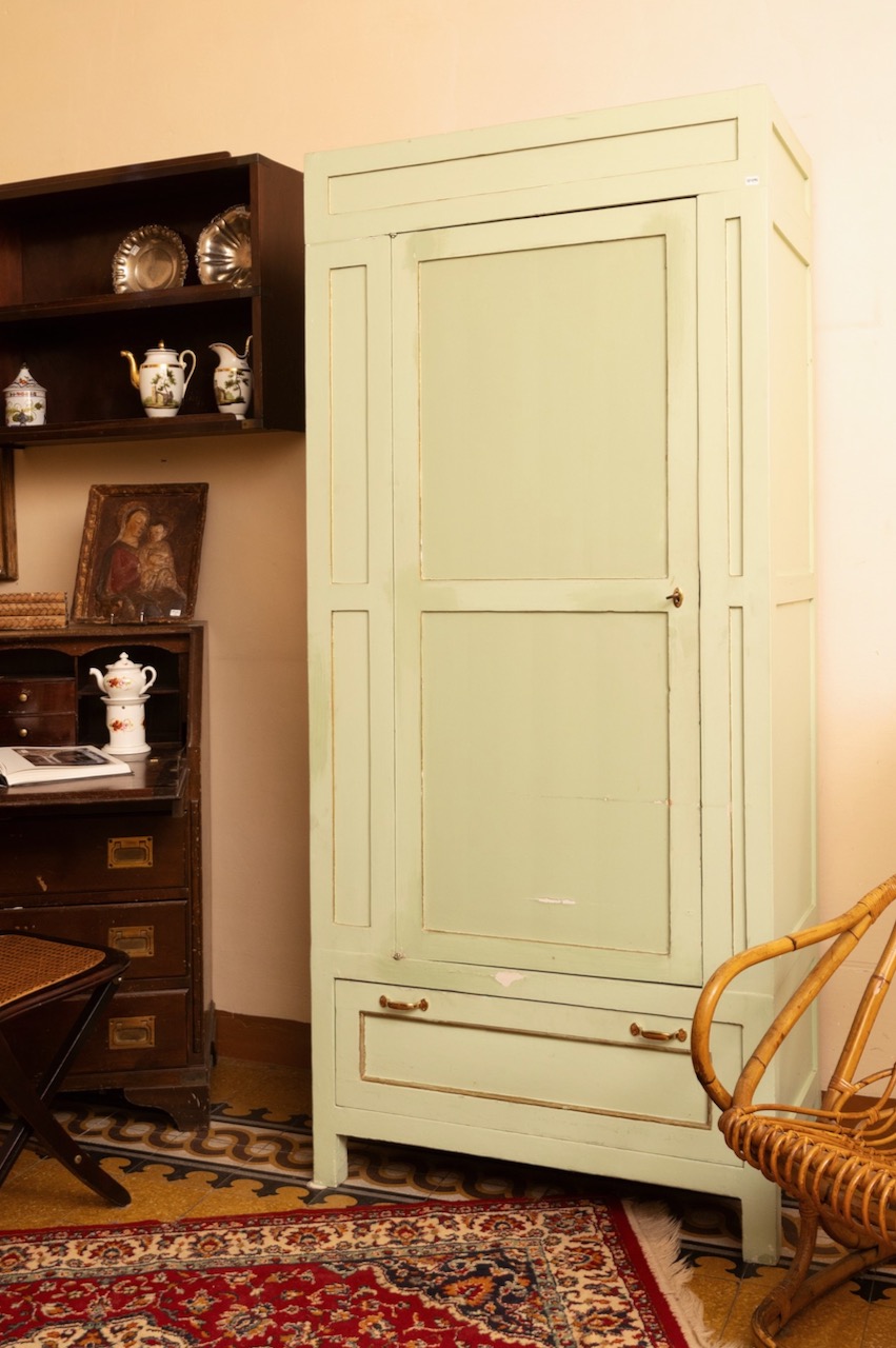 Coppia armadi guardaroba a colonna, in gattice laccato verde mente, uno sportello e un cassetto. Italia, sec. XX
