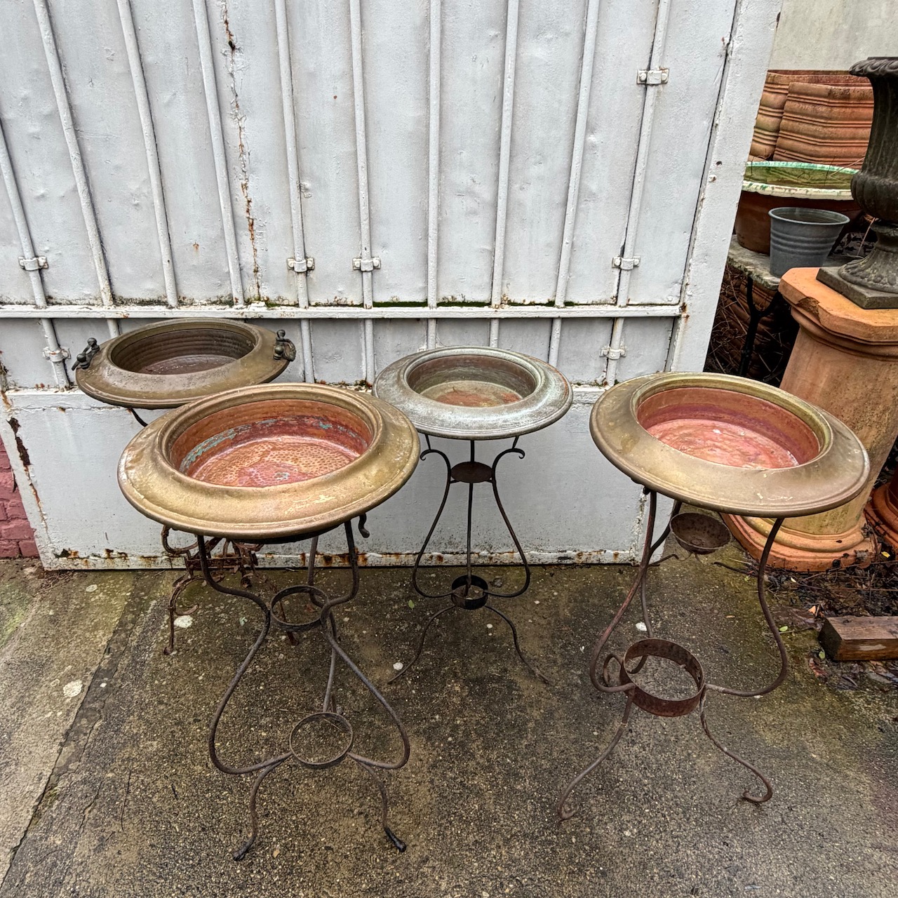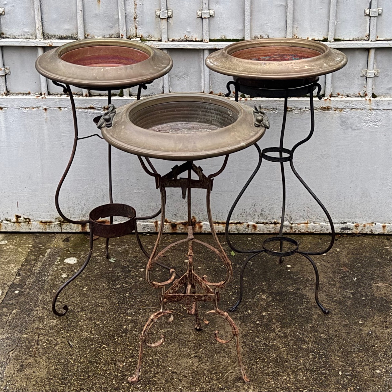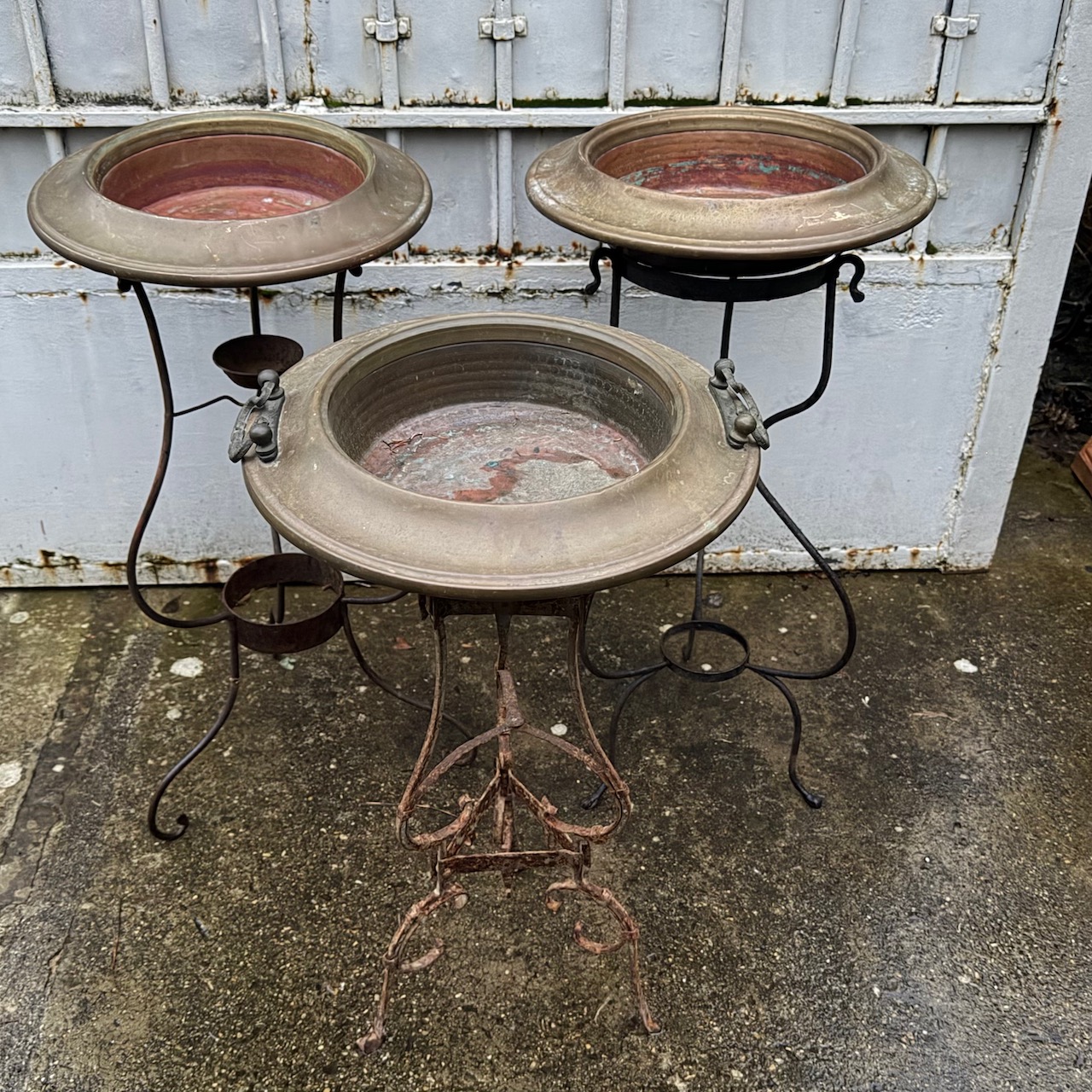 Collezione quattro bracieri in rame, sostegni in ferro battuto. Italia, sec. XIX