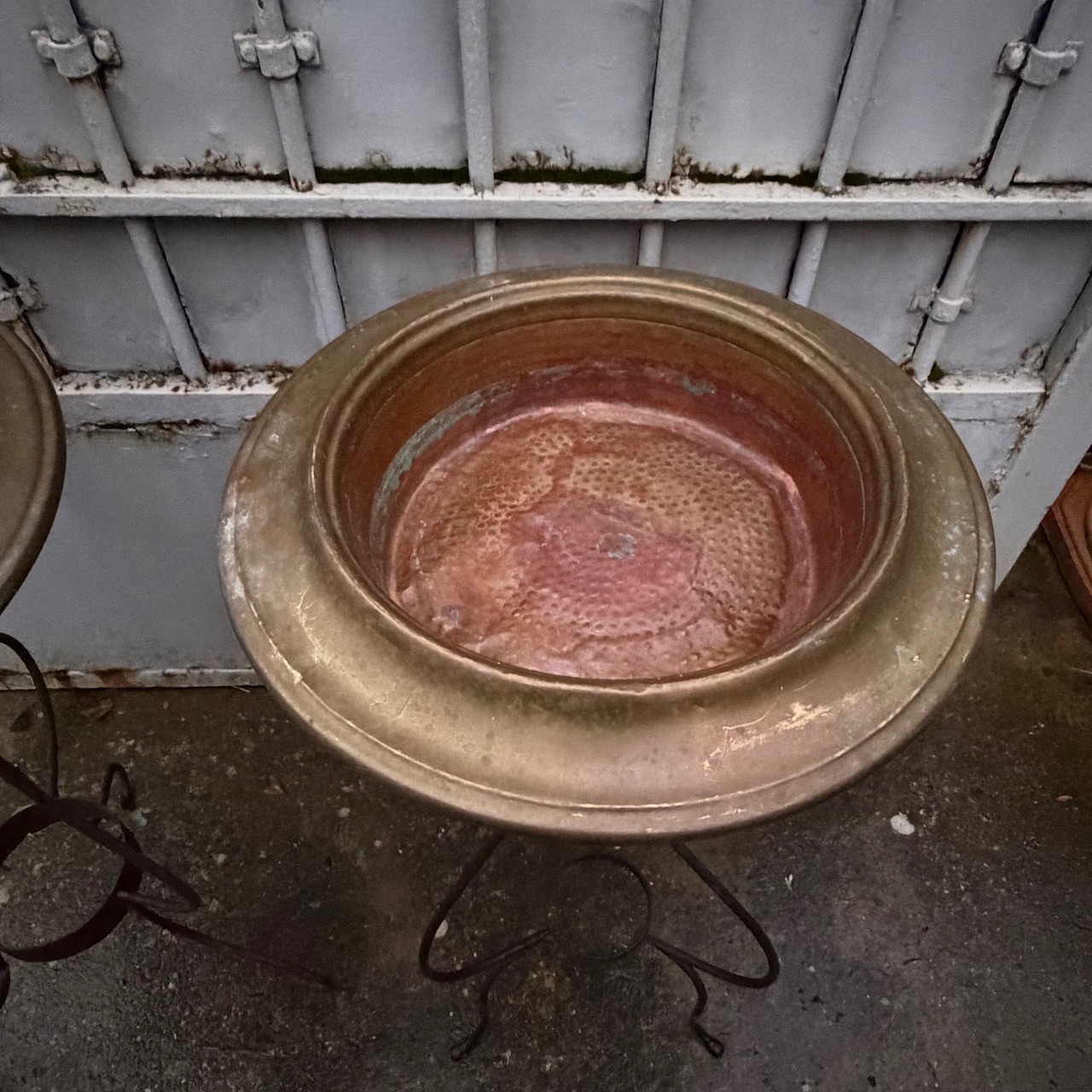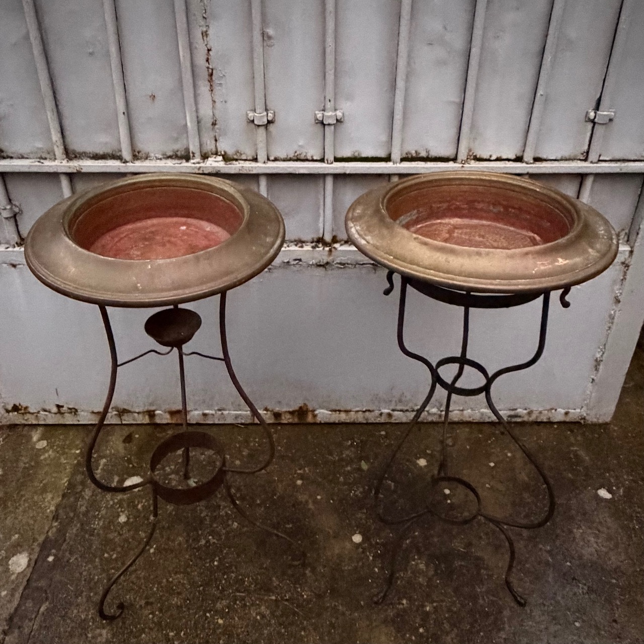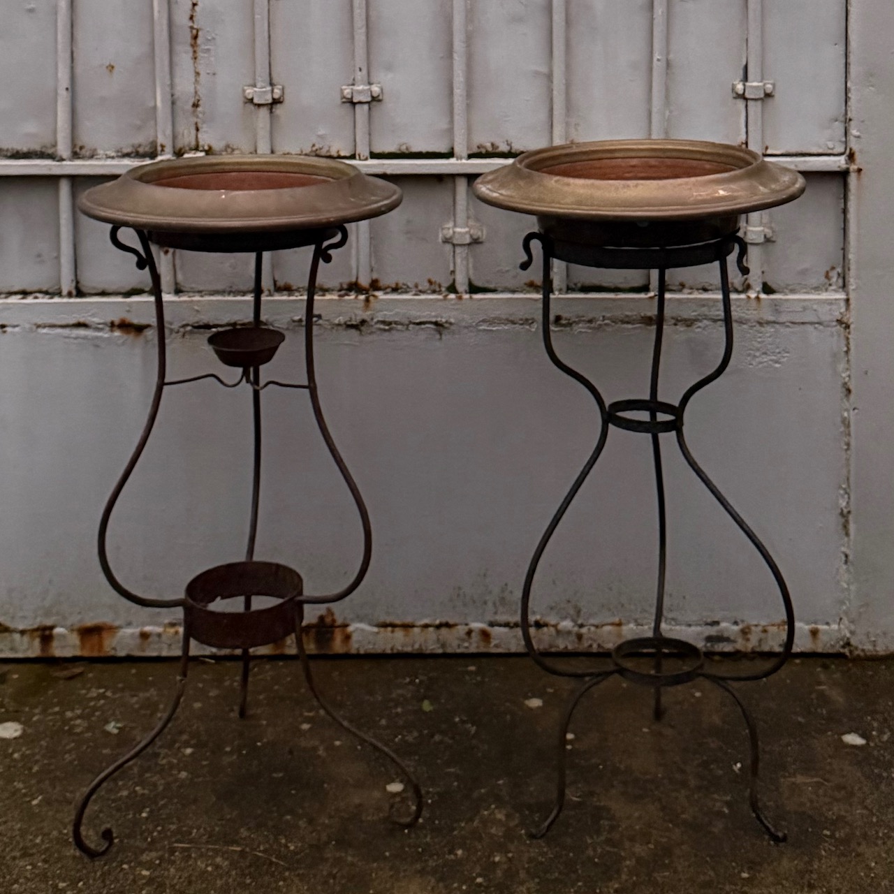 Collezione quattro bracieri in rame, sostegni in ferro battuto. Italia, sec. XIX