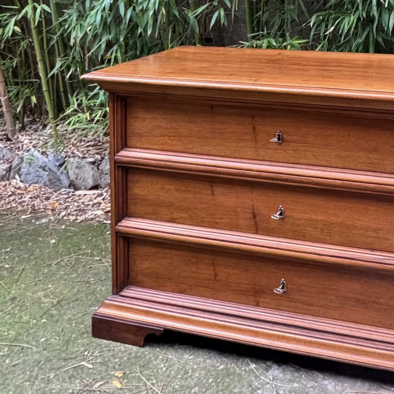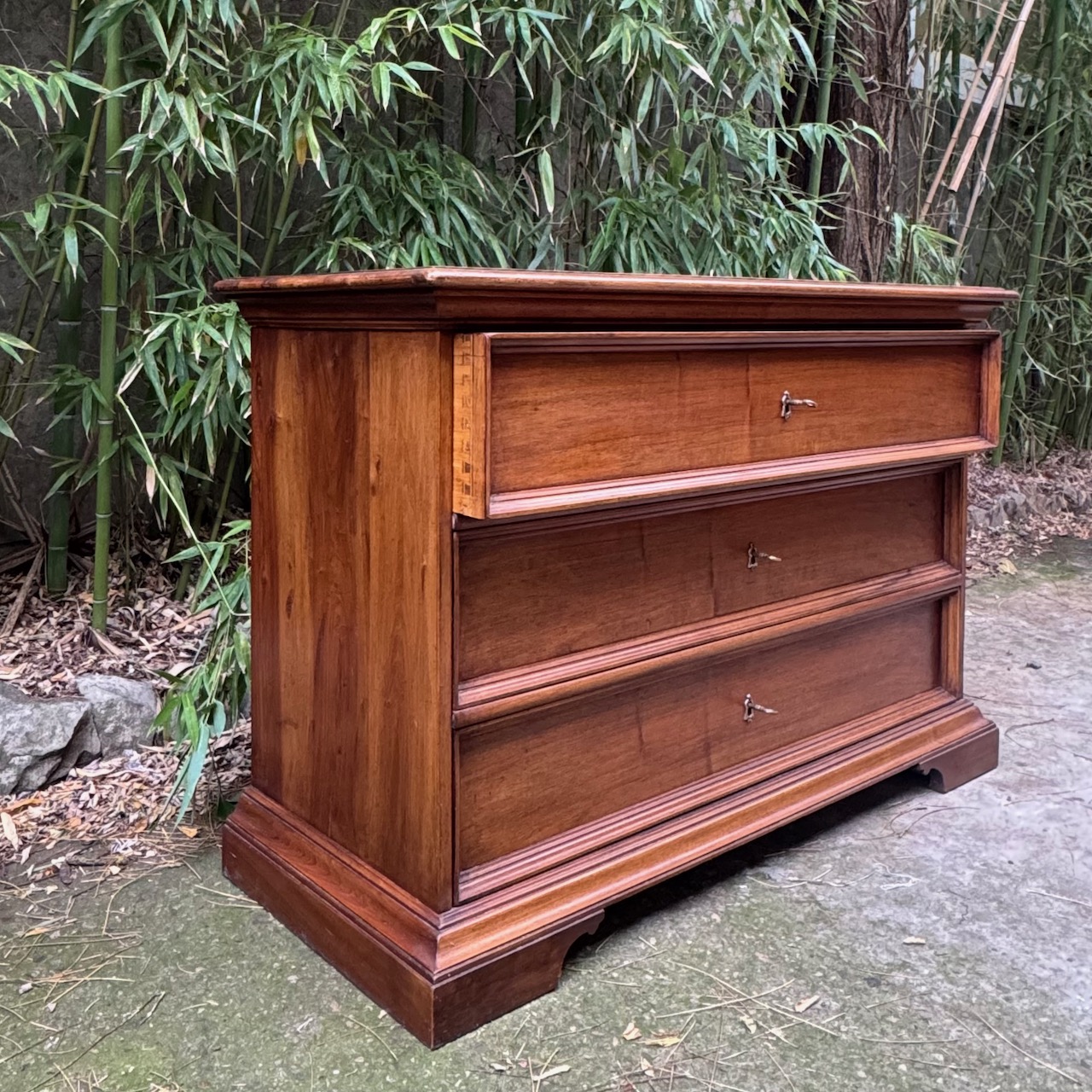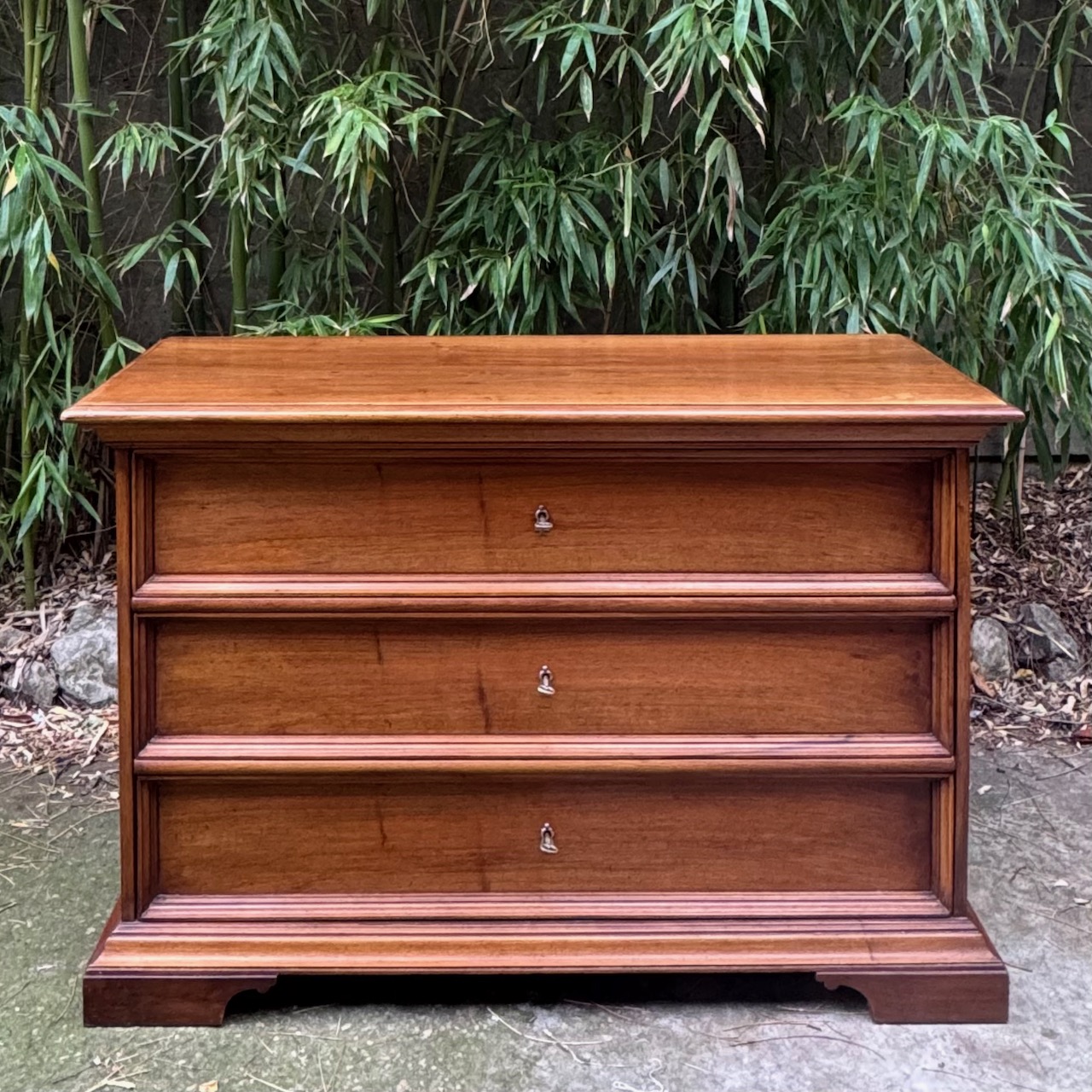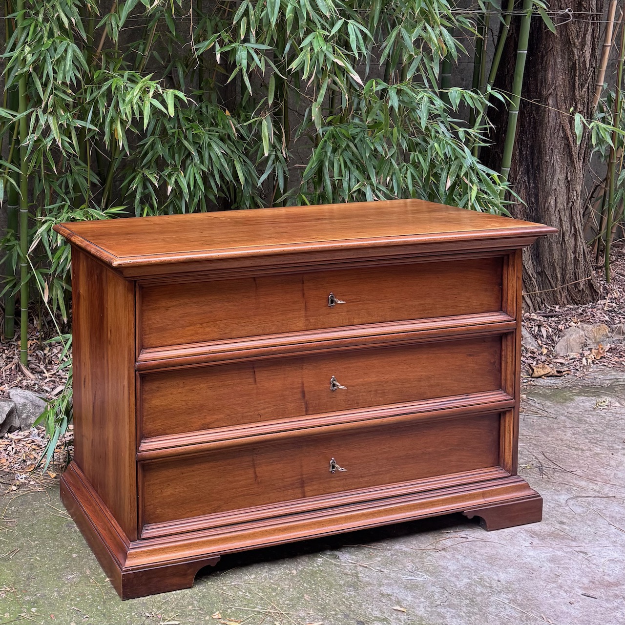 Cassettiera in noce, tre grandi cassetti, piano con angoli stondati a becco civetta. Italia, sec. XX