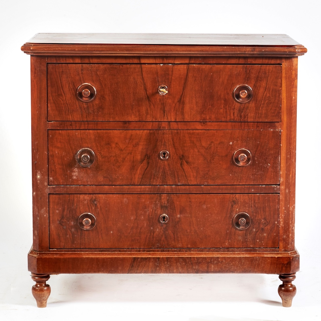 Piccola cassettiera in noce a tre cassetti, gambe tornite. Italia, sec. XIX