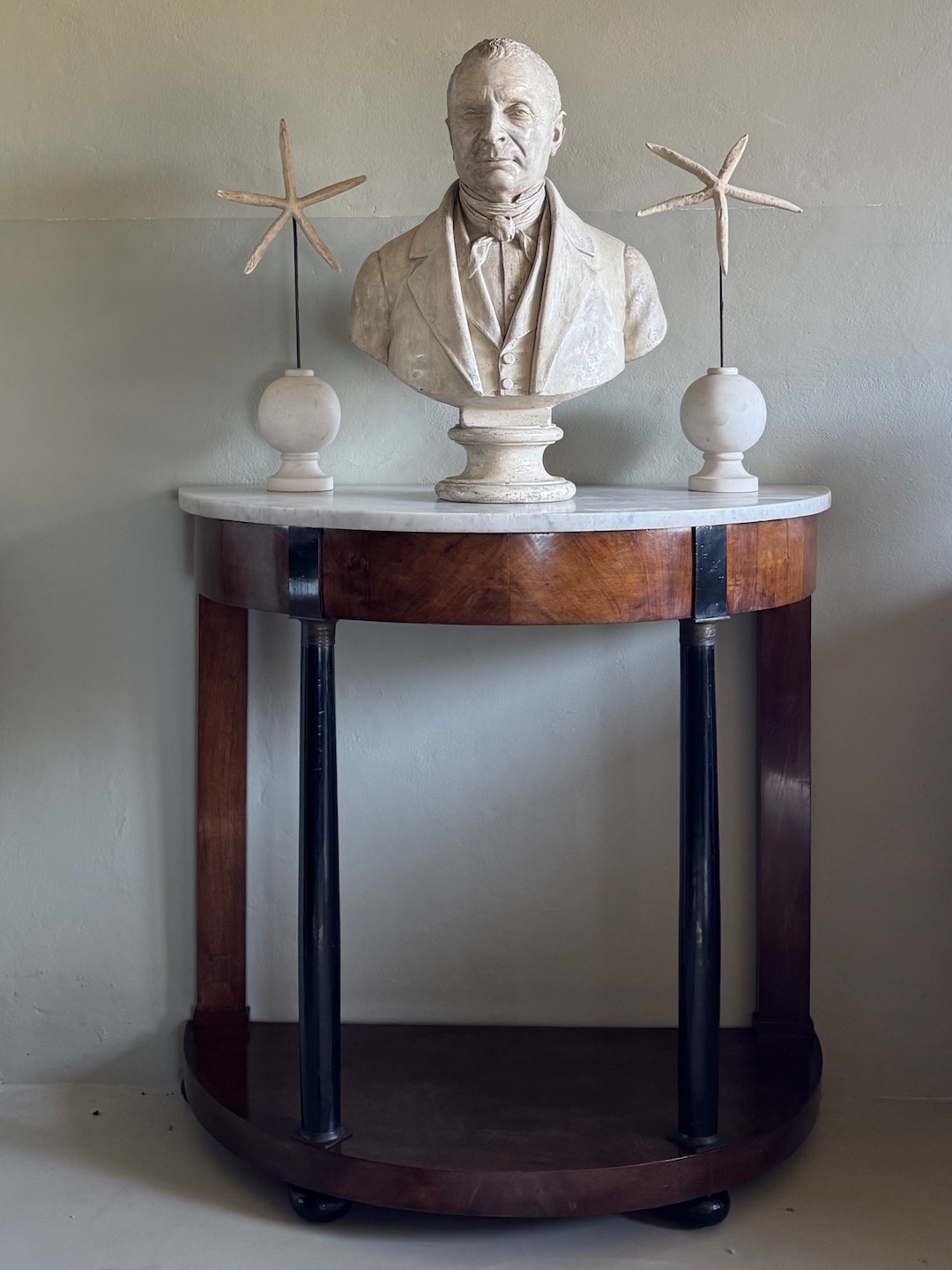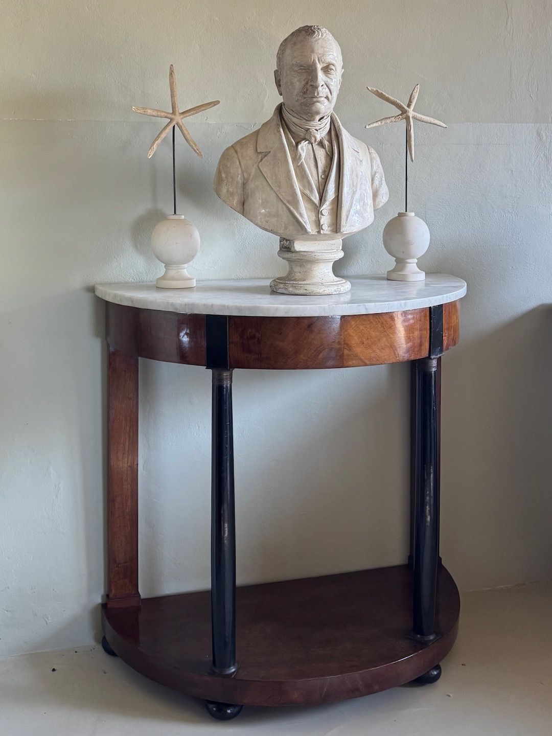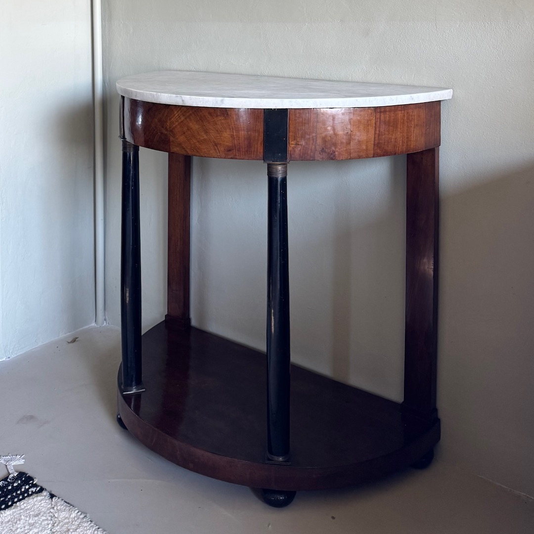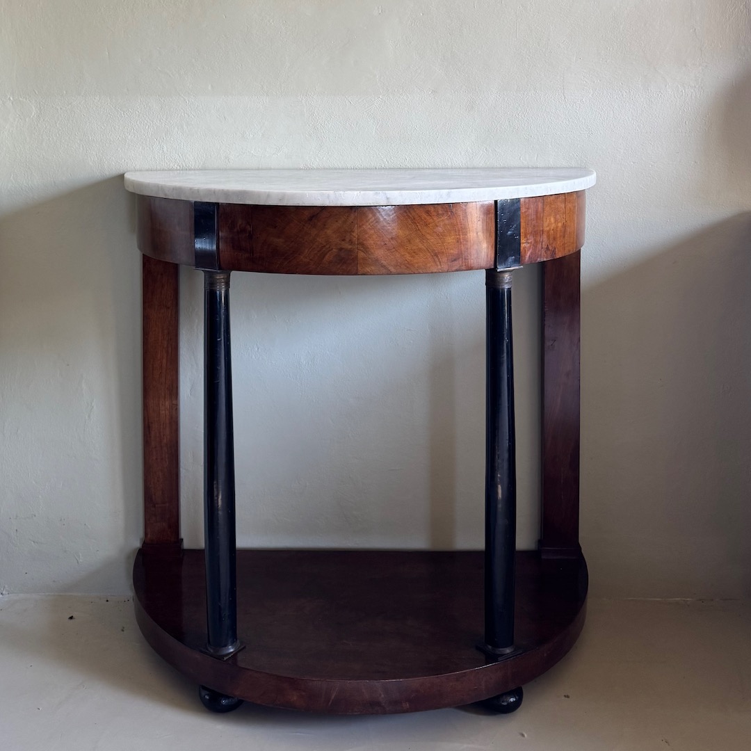Consolle a mezzaluna Impero in piuma di ciliegio parzialmente ebanizato, piano in marmo, base colonne in bronzo. Italia, sec. XIX