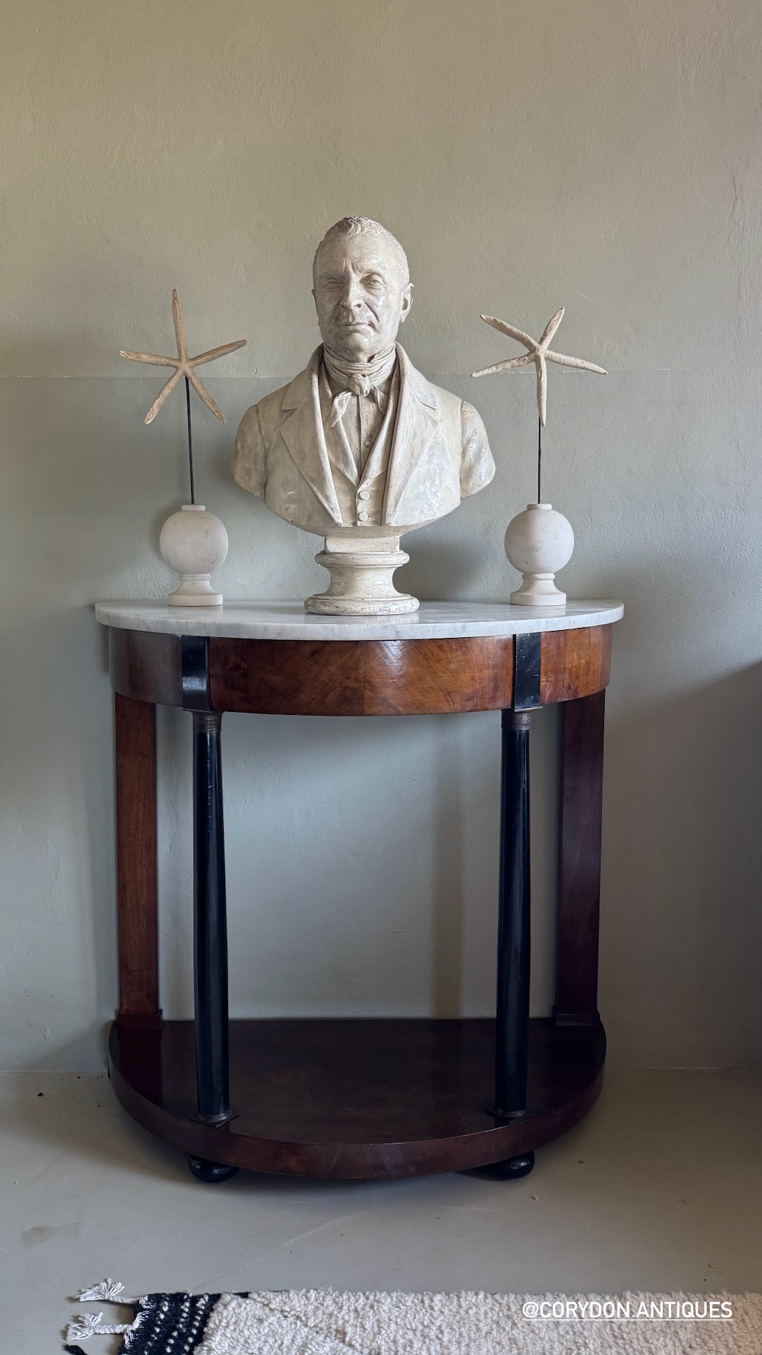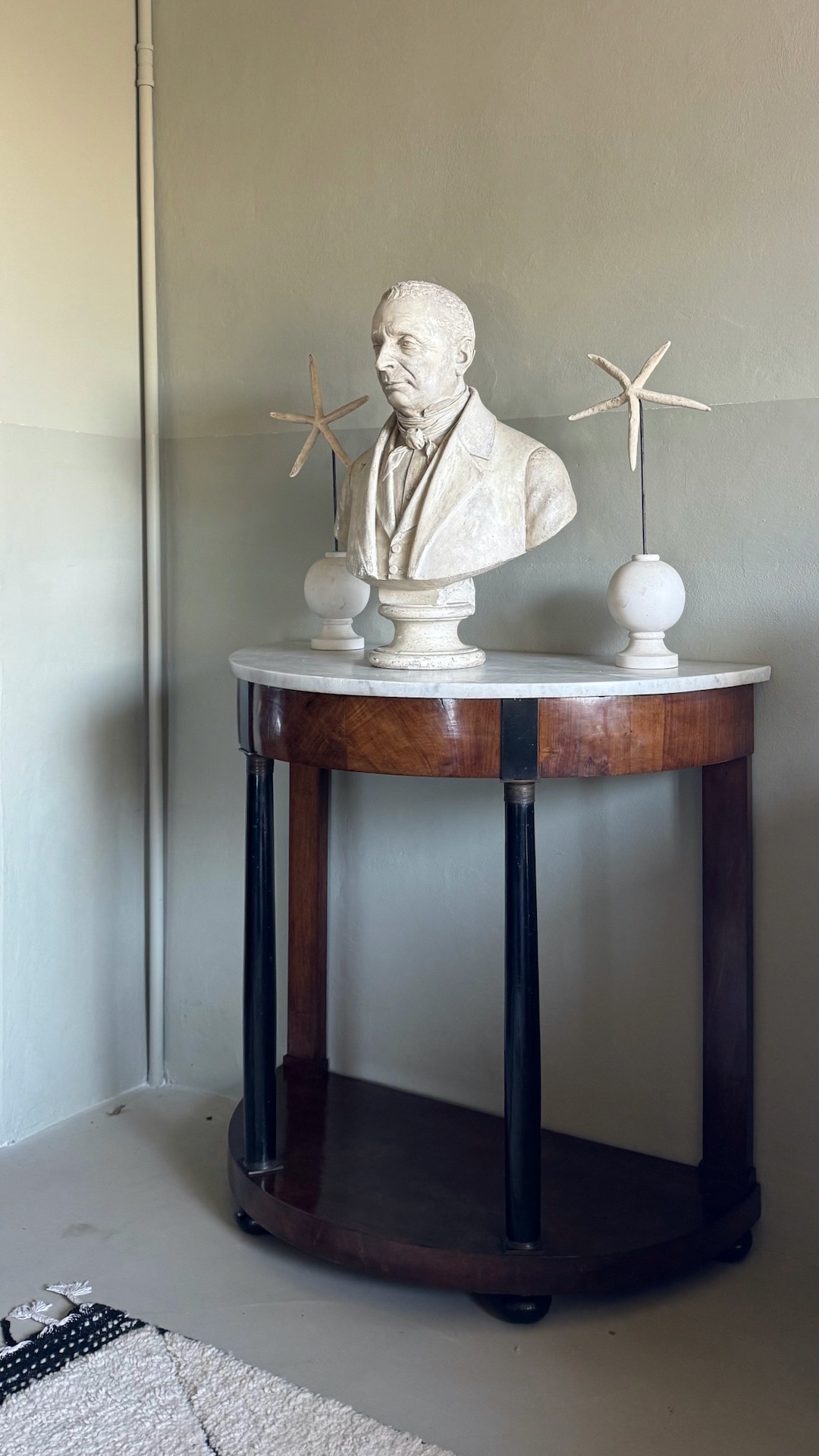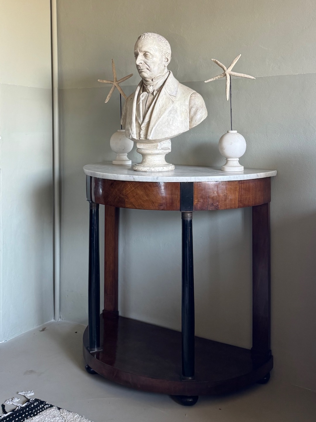 Consolle a mezzaluna Impero in piuma di ciliegio parzialmente ebanizato, piano in marmo, base colonne in bronzo. Italia, sec. XIX